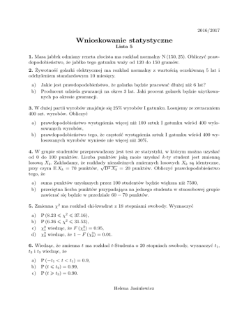 2016/2017 Wnioskowanie statystyczne Lista 5 1. Masa jabłek odmiany reneta złocista ma rozkład normalny N (150, 25). Obliczyć prawdopodobieństwo, że jabłko tego gatunku waży od 120 do 150 gramów. 2. Żywotność golarki elektrycznej ma rozkład normalny z wartością oczekiwaną 5 lat i odchyleniem standardowym 10 miesięcy. a) Jakie jest prawdopodobieństwo, że golarka będzie pracować dłużej niż 6 lat? b) Producent udziela gwarancji na okres 3 lat. Jaki procent golarek będzie użytkowanych po okresie gwarancji. 3. W dużej partii wyrobów znajduje się 25% wyrobów I gatunku. Losujemy ze zwracaniem 400 szt. wyrobów. Obliczyć a) prawdopodobieństwo wystąpienia więcej niż 100 sztuk I gatunku wśród 400 wylosowanych wyrobów, b) prawdopodobieństwo tego, że częstość wystąpienia sztuk I gatunku wśród 400 wylosowanych wyrobów wyniesie nie więcej niż 30%. 4. W grupie studentów przeprowadzony jest test ze statystyki, w którym można uzyskać od 0 do 100 punktów. Liczba punktów jaką może uzyskać k-ty student jest zmienną losową Xk . Zakładamy, że rozkłady √ niezależnych zmiennych losowych Xk są identyczne, przy czym E Xk = 70 punktów, D2 Xk = 20 punktów. Obliczyć prawdopodobieństwo tego, że a) suma punktów uzyskanych przez 100 studentów będzie większa niż 7500, b) przeciętna liczba punktów przypadająca na jednego studenta w stuosobowej grupie zawierać się będzie w przedziale 60 − 70 punktów. 5. Zmienna χ2 ma rozkład chi-kwadrat z 18 stopniami swobody. Wyznaczyć a) b) c) d) P (8.23 ¬ χ2 ¬ 37.16), P (6.26 ¬ χ2 ¬ 31.53), χ21 wiedząc, że F (χ21 ) = 0.95, χ22 wiedząc, że 1 − F (χ22 ) = 0.01. 6. Wiedząc, że zmienna t ma rozkład t-Studenta o 20 stopniach swobody, wyznaczyć t1 , t2 i t3 wiedząc, że a) P (−t1 < t < t1 ) = 0.9, b) P (t ¬ t2 ) = 0.99, c) P (t t3 ) = 0.90. Helena Jasiulewicz