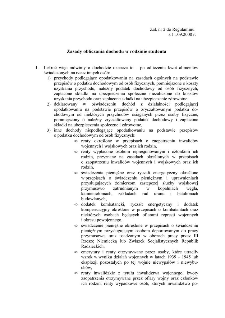 Zał. nr 2 do Regulaminu z 11.09.2008 r. Zasady obliczania dochodu w rodzinie studenta 1. Ilekroć więc mówimy o dochodzie oznacza to – po odliczeniu kwot alimentów świadczonych na rzecz innych osób: 1) przychody podlegające opodatkowaniu na zasadach ogólnych na podstawie przepisów o podatku dochodowym od osób fizycznych, pomniejszone o koszty uzyskania przychodu, naleŜny podatek dochodowy od osób fizycznych, zapłacone składki na ubezpieczenia społeczne niezaliczone do kosztów uzyskania przychodu oraz zapłacone składki na ubezpieczenie zdrowotne 2) deklarowany w oświadczeniu dochód z działalności podlegającej opodatkowaniu na podstawie przepisów o zryczałtowanym podatku dochodowym od niektórych przychodów osiąganych przez osoby fizyczne, pomniejszony o naleŜny zryczałtowany podatek dochodowy i zapłacone składki na ubezpieczenia społeczne i zdrowotne, 3) inne dochody niepodlegające opodatkowaniu na podstawie przepisów o podatku dochodowym od osób fizycznych: • renty określone w przepisach o zaopatrzeniu inwalidów wojennych i wojskowych oraz ich rodzin, • renty wypłacone osobom represjonowanym i członkom ich rodzin, przyznane na zasadach określonych w przepisach o zaopatrzeniu inwalidów wojennych i wojskowych oraz ich rodzin, • świadczenia pienięŜne oraz ryczałt energetyczny określone w przepisach o świadczeniu pienięŜnym i uprawnieniach przysługujących Ŝołnierzom zastępczej słuŜby wojskowej przymusowo zatrudnianym w kopalniach węgla, kamieniołomach, zakładach rud uranu i batalionach budowlanych, • dodatek kombatancki, ryczałt energetyczny i dodatek kompensacyjny określone w przepisach o kombatantach oraz niektórych osobach będących ofiarami represji wojennych i okresu powojennego, • świadczenie pienięŜne określone w przepisach o świadczeniu pienięŜnym przysługującym osobom deportowanym do pracy przymusowej oraz osadzonym w obozach pracy przez III Rzeszę Niemiecką lub Związek Socjalistycznych Republik Radzieckich, • emerytury i renty otrzymywane przez osoby, które utraciły wzrok w wyniku działań wojennych w latach 1939 – 1945 lub eksplozji pozostałych po tej wojnie niewypałów i niewybuchów, • renty inwalidzkie z tytułu inwalidztwa wojennego, kwoty zaopatrzenia otrzymywane przez ofiary wojny oraz członków ich rodzin, renty wypadkowe osób, których inwalidztwo po- • • • • • • • • wstało w związku z przymusowym pobytem na robotach w III Rzeszy Niemieckiej w latach 1939 – 1945, otrzymywane z zagranicy, zasiłki chorobowe określone w przepisach o ubezpieczeniu społecznym rolników oraz w przepisach o systemie ubezpieczeń społecznych, środki bezzwrotnej pomocy zagranicznej otrzymywane od rządów państw obcych, organizacji międzynarodowych lub międzynarodowych instytucji finansowych, pochodzące ze środków bezzwrotnej pomocy przyznanych na podstawie jednostronnej deklaracji lub umów zawartych z tymi państwami, organizacjami lub instytucjami przez Radę Ministrów, właściwego ministra lub agencje rządowe, w tym równieŜ w przypadkach, gdy przekazanie tych środków jest dokonywane za pośrednictwem podmiotu upowaŜnionego do rozdzielania środków bezzwrotnej pomocy zagranicznej na rzecz podmiotów, którym słuŜyć ma ta pomoc, naleŜności ze stosunku pracy lub z tytułu stypendium osób fizycznych mających miejsce zamieszkania na terytorium Rzeczypospolitej Polskiej, przebywających czasowo za granicą w wysokości odpowiadającej równowartości diet z tytułu podróŜy słuŜbowej poza granicami kraju ustalonych dla pracowników zatrudnionych w państwowych lub samorządowych jednostkach sfery budŜetowej na podstawie ustawy z dnia 26 czerwca 1974 r. - Kodeks pracy (Dz. U. z 1998 r. Nr 21, poz. 94, z późn. zm.), naleŜności pienięŜne wypłacone policjantom, Ŝołnierzom, celnikom i pracownikom jednostek wojskowych i jednostek policyjnych uŜytych poza granicami państwa w celu udziału w konflikcie zbrojnym lub wzmocnienia sił państwa albo państw sojuszniczych, misji pokojowej, akcji zapobieŜenia aktom terroryzmu lub ich skutkom, a takŜe naleŜności pienięŜne wypłacone Ŝołnierzom, policjantom, celnikom i pracownikom pełniącym funkcje obserwatorów w misjach pokojowych organizacji międzynarodowych i sił wielonarodowych, naleŜności pienięŜne ze stosunku słuŜbowego otrzymywane w czasie słuŜby kandydackiej przez funkcjonariuszy Policji, Państwowej StraŜy PoŜarnej, StraŜy Granicznej i Biura Ochrony Rządu, obliczone za okres, w którym osoby te uzyskały dochód, dochody członków rolniczych spółdzielni produkcyjnych z tytułu członkostwa w rolniczej spółdzielni produkcyjnej, pomniejszone o składki na ubezpieczenie społeczne, alimenty na rzecz dzieci, stypendia określone w przepisach o systemie oświaty, przepisach Prawo o szkolnictwie wyŜszym oraz w przepisach o stopniach naukowych i tytule naukowym oraz o stopniach i tytule w zakresie sztuki, a takŜe inne stypendia przyznawane uczniom lub studentom, • 2. 3. kwoty diet nieopodatkowane podatkiem dochodowym od osób fizycznych, otrzymywane przez osoby wykonujące czynności związane z pełnieniem obowiązków społecznych i obywatelskich, • naleŜności pienięŜne otrzymywane z tytułu wynajmu pokoi gościnnych w budynkach mieszkalnych połoŜonych na terenach wiejskich w gospodarstwie rolnym osobom przebywającym na wypoczynku oraz uzyskane z tytułu wyŜywienia tych osób, • dodatki za tajne nauczanie określone w ustawie z dnia 26 stycznia 1982 roku – Karta Nauczyciela (Dz. U. z 2003 r. Nr 118, poz. 1112, Nr 137, poz. 1304, Nr 203, poz. 1966 i Nr 213, poz. 2081), • dochody uzyskane z działalności gospodarczej prowadzonej na podstawie zezwolenia na terenie specjalnej strefy ekonomicznej określonej w przepisach o specjalnych strefach ekonomicznych, • ekwiwalenty pienięŜne za deputaty węglowe określone w przepisach o komercjalizacji, restruktu