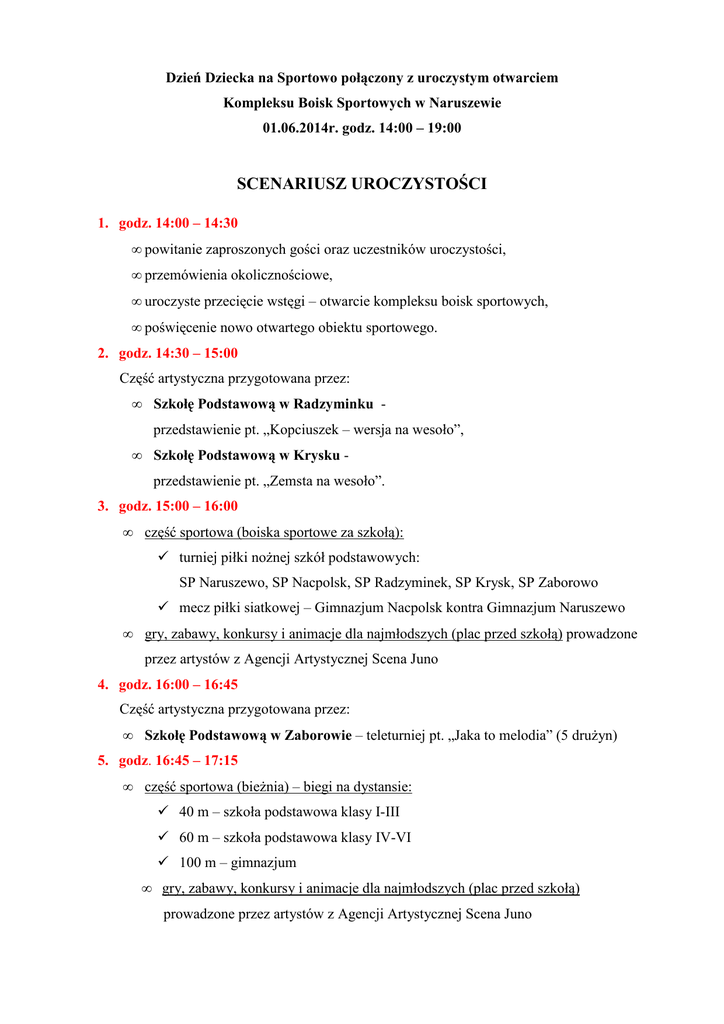 Dzień Dziecka na Sportowo połączony z uroczystym otwarciem Kompleksu Boisk Sportowych w Naruszewie 01.06.2014r. godz. 14:00 – 19:00 SCENARIUSZ UROCZYSTOŚCI 1. godz. 14:00 – 14:30 • powitanie zaproszonych gości oraz uczestników uroczystości, • przemówienia okolicznościowe, • uroczyste przecięcie wstęgi – otwarcie kompleksu boisk sportowych, • poświęcenie nowo otwartego obiektu sportowego. 2. godz. 14:30 – 15:00 Część artystyczna przygotowana przez: • Szkołę Podstawową w Radzyminku przedstawienie pt. „Kopciuszek – wersja na wesoło”, • Szkołę Podstawową w Krysku przedstawienie pt. „Zemsta na wesoło”. 3. godz. 15:00 – 16:00 • część sportowa (boiska sportowe za szkołą): turniej piłki noŜnej szkół podstawowych: SP Naruszewo, SP Nacpolsk, SP Radzyminek, SP Krysk, SP Zaborowo mecz piłki siatkowej – Gimnazjum Nacpolsk kontra Gimnazjum Naruszewo • gry, zabawy, konkursy i animacje dla najmłodszych (plac przed szkołą) prowadzone przez artystów z Agencji Artystycznej Scena Juno 4. godz. 16:00 – 16:45 Część artystyczna przygotowana przez: • Szkołę Podstawową w Zaborowie – teleturniej pt. „Jaka to melodia” (5 druŜyn) 5. godz. 16:45 – 17:15 • część sportowa (bieŜnia) – biegi na dystansie: 40 m – szkoła podstawowa klasy I-III 60 m – szkoła podstawowa klasy IV-VI 100 m – gimnazjum • gry, zabawy, konkursy i animacje dla najmłodszych (plac przed szkołą) prowadzone przez artystów z Agencji Artystycznej Scena Juno 6. godz.17:15 – 17:45 Część artystyczna przygotowana przez: • Zespół Szkół w Naruszewie – turniej pt. „Potyczki rodzinne” (5 druŜyn) 7. godz. 17:45 – 18:15 Część artystyczna przygotowana przez: • Zespół Szkół w Nacpolsku – występy wokalne 8. godz. 18:15 – 19:00 Podsumowanie: • • nagrodzenie najlepszych zawodników oraz druŜyn w turniejach oraz konkurencjach sportowych, losowanie nagrody głównej (roweru) w loterii fantowej. Informacje dodatkowe: • Szkoła Podstawowa w Zaborowie serdecznie zaprasza do udziału w loterii fantowej, z której dochód zostanie w całości przeznaczony na „Pomoc dla Agnieszki” - pomoc w leczeniu chorego rodzica dziecka uczęszczającego do Szkoły Podstawowej w Zaborowie (jedynego opiekuna trojga dzieci). Losy o wartości 5 i 10 zł (kaŜdy los wygrywa) będą rozprowadzane w dniu 01 czerwca od godz. 14:00 do wyczerpania w namiocie usytuowanym po prawej stronie głównego wejścia do budynku szkoły. Spośród osób biorących udział w loterii fantowej po godzinie 18:15 odbędzie się losowanie nagrody głównej (roweru). • W czasie trwania imprezy w namiocie Gminy Naruszewo będzie wykonywany bezpłatny pomiar ciśnienia tętniczego oraz bezpłatne badanie poziomu cukru we krwi.