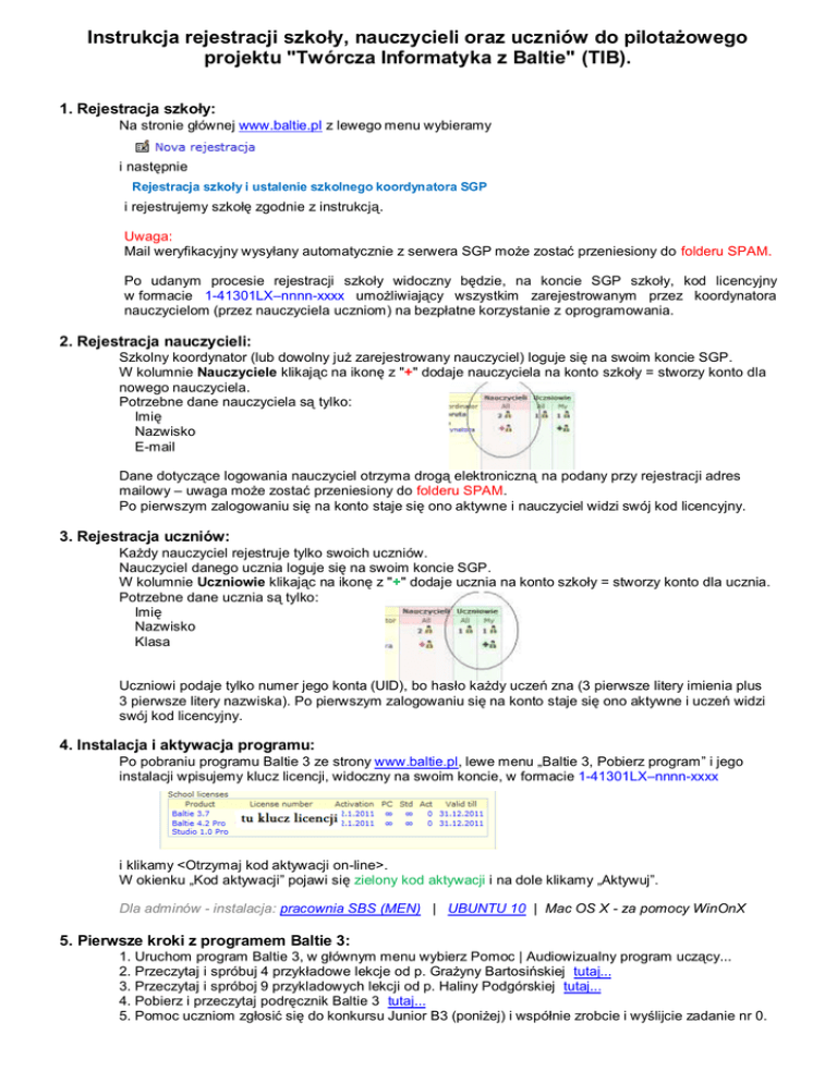 Instrukcja rejestracji szkoły, nauczycieli oraz uczniów do pilotażowego projektu "Twórcza Informatyka z Baltie" (TIB). 1. Rejestracja szkoły: Na stronie głównej www.baltie.pl z lewego menu wybieramy i następnie Rejestracja szkoły i ustalenie szkolnego koordynatora SGP i rejestrujemy szkołę zgodnie z instrukcją. Uwaga: Mail weryfikacyjny wysyłany automatycznie z serwera SGP może zostać przeniesiony do folderu SPAM. Po udanym procesie rejestracji szkoły widoczny będzie, na koncie SGP szkoły, kod licencyjny w formacie 1-41301LX–nnnn-xxxx umożliwiający wszystkim zarejestrowanym przez koordynatora nauczycielom (przez nauczyciela uczniom) na bezpłatne korzystanie z oprogramowania. 2. Rejestracja nauczycieli: Szkolny koordynator (lub dowolny już zarejestrowany nauczyciel) loguje się na swoim koncie SGP. W kolumnie Nauczyciele klikając na ikonę z "+" dodaje nauczyciela na konto szkoły = stworzy konto dla nowego nauczyciela. Potrzebne dane nauczyciela są tylko: Imię Nazwisko E-mail Dane dotyczące logowania nauczyciel otrzyma drogą elektroniczną na podany przy rejestracji adres mailowy – uwaga może zostać przeniesiony do folderu SPAM. Po pierwszym zalogowaniu się na konto staje się ono aktywne i nauczyciel widzi swój kod licencyjny. 3. Rejestracja uczniów: Każdy nauczyciel rejestruje tylko swoich uczniów. Nauczyciel danego ucznia loguje się na swoim koncie SGP. W kolumnie Uczniowie klikając na ikonę z "+" dodaje ucznia na konto szkoły = stworzy konto dla ucznia. Potrzebne dane ucznia są tylko: Imię Nazwisko Klasa Uczniowi podaje tylko numer jego konta (UID), bo hasło każdy uczeń zna (3 pierwsze litery imienia plus 3 pierwsze litery nazwiska). Po pierwszym zalogowaniu się na konto staje się ono aktywne i uczeń widzi swój kod licencyjny. 4. Instalacja i aktywacja programu: Po pobraniu programu Baltie 3 ze strony www.baltie.pl, lewe menu „Baltie 3, Pobierz program” i jego instalacji wpisujemy klucz licencji, widoczny na swoim koncie, w formacie 1-41301LX–nnnn-xxxx i klikamy <Otrzymaj kod aktywacji on-line>. W okienku „Kod aktywacji” pojawi się zielony kod aktywacji i na dole klikamy „Aktywuj”. Dla adminów - instalacja: pracownia SBS (MEN) | UBUNTU 10 | Mac OS X - za pomocy WinOnX 5. Pierwsze kroki z programem Baltie 3: 1. Uruchom program Baltie 3, w głównym menu wybierz Pomoc | Audiowizualny program uczący... 2. Przeczytaj i spróbuj 4 przykładowe lekcje od p. Grażyny Bartosińskiej tutaj... 3. Przeczytaj i spróboj 9 przykladowych lekcji od p. Haliny Podgórskiej tutaj... 4. Pobierz i przeczytaj podręcznik Baltie 3 tutaj... 5. Pomoc uczniom zgłosić się do konkursu Junior B3 (poniżej) i współnie zrobcie i wyślijcie zadanie nr 0. 6. Instrukcja udziału uczniów w konkursach Dla wszystkich początkujących jest przeznaczony konkurs Junior B3. Uczeń już po pierwszej lekcji programowania w Baltie jest w stanie przystępić do konkursu Junior. Proszę się nie tego bać W konkursie Junior B3 biorą udział uczniowie już od przedszkoła. Na stronie głównej www.baltie.pl z lewego menu uczeń wybiera Konkursy 2011/12. Następnie klika na Junior B3. Uczeń loguje się na swoje konto i klika na Zgłoszenie w lewym menu. Uczeń najpierw spróbuje zrobić zadanie #0. To zadanie sie nie liczy do wyników. Oznacza to, że uczeń może spróbować wszystkiego tak długo i tyle razy, ile chce. Nauczyciel też może zobaczyć wszystkie zadania – po zalogowaniu się klika na Zadania w lewym menu. Wszystkie zadania konkursu Junior są nadal otwarte, więc można przystąpić do rywalizacji w każdej chwili i każde zadanie można poprawiać ile razy chcecie.