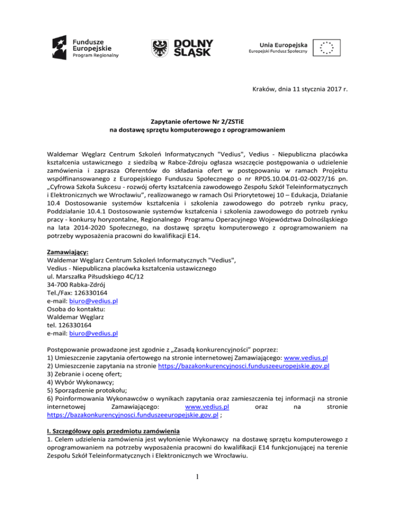 Kraków, dnia 11 stycznia 2017 r. Zapytanie ofertowe Nr 2/ZSTiE na dostawę sprzętu komputerowego z oprogramowaniem Waldemar Węglarz Centrum Szkoleń Informatycznych "Vedius", Vedius - Niepubliczna placówka kształcenia ustawicznego z siedzibą w Rabce-Zdroju ogłasza wszczęcie postępowania o udzielenie zamówienia i zaprasza Oferentów do składania ofert w postępowaniu w ramach Projektu współfinansowanego z Europejskiego Funduszu Społecznego o nr RPDS.10.04.01-02-0027/16 pn. „Cyfrowa Szkoła Sukcesu - rozwój oferty kształcenia zawodowego Zespołu Szkół Teleinformatycznych i Elektronicznych we Wrocławiu”, realizowanego w ramach Osi Priorytetowej 10 – Edukacja, Działanie 10.4 Dostosowanie systemów kształcenia i szkolenia zawodowego do potrzeb rynku pracy, Poddziałanie 10.4.1 Dostosowanie systemów kształcenia i szkolenia zawodowego do potrzeb rynku pracy - konkursy horyzontalne, Regionalnego Programu Operacyjnego Województwa Dolnośląskiego na lata 2014-2020 Społecznego, na dostawę sprzętu komputerowego z oprogramowaniem na potrzeby wyposażenia pracowni do kwalifikacji E14. Zamawiający: Waldemar Węglarz Centrum Szkoleń Informatycznych "Vedius", Vedius - Niepubliczna placówka kształcenia ustawicznego ul. Marszałka Piłsudskiego 4C/12 34-700 Rabka-Zdrój Tel./Fax: 126330164 e-mail: [email protected] Osoba do kontaktu: Waldemar Węglarz tel. 126330164 e-mail: [email protected] Postępowanie prowadzone jest zgodnie z „Zasadą konkurencyjności” poprzez: 1) Umieszczenie zapytania ofertowego na stronie internetowej Zamawiającego: www.vedius.pl 2) Umieszczenie zapytania na stronie https://bazakonkurencyjnosci.funduszeeuropejskie.gov.pl 3) Zebranie i ocenę ofert; 4) Wybór Wykonawcy; 5) Sporządzenie protokołu; 6) Poinformowania Wykonawców o wynikach zapytania oraz zamieszczenia tej informacji na stronie internetowej Zamawiającego: www.vedius.pl oraz na stronie https://bazakonkurencyjnosci.funduszeeuropejskie.gov.pl ; I. Szczegółowy opis przedmiotu zamówienia 1. Celem udzielenia zamówienia jest wyłonienie Wykonawcy na dostawę sprzętu komputerowego z oprogramowaniem na potrzeby wyposażenia pracowni do kwalifikacji E14 funkcjonującej na terenie Zespołu Szkół Teleinformatycznych i Elektronicznych we Wrocławiu. 1 2. Przedmiotem zamówienia jest dostawa 16 sztuk komputerów stacjonarnych z oprogramowaniem graficznym o minimalnych parametrach przedstawionych poniżej lub równoważnych: 1. Procesor: INTEL CORE i5-6600 - 3.30 GHz, turbo 3.90 GHz, x4/4, 6 MB, 65W, BOX, s-1151 2. Płyta główna: MSI H170M-A PRO-m-ATX, H170, 4xDDR4, 2x PCI-E 16x, RAID, DVI, HDMI, S-1151 3. Pamięć RAM: DDR4 HYPERX - 16 GB / 2133 (2x 8 GB), CL14, Fury Black 4. Dysk Twardy: TOSHIBA 1 TB, 32 MB, 7200 obr., 3.5", SATA 3 - DT01ACA100 5. Dysk Twardy SSD: SSD SANDISK PLUS - 240 GB, 2.5", SATA3, 530 MB/s, 440 MB/s - SDSSDA-240GG26 6. Napęd optyczny: LG GH24NSD1 - 24x DVDRW DL, SATA, OEM, czarna 7. Obudowa: CHIEFTEC XT-01B-350GPB - m-ATX, 350W, USB 3.0, czarna 8. Monitor: PHILIPS 200V4QSBR - 19.5", VA, 1920 x 1080, LED, 8 ms, 3000:1, DVI, czarny 9. Klawiatura: LOGITECH K120 - przewodowa, USB, czarna 10. Mysz: LOGITECH B100 - optyczna, przewodowa, USB, czarna 11. Karta Sieciowa: EDIMAX EW-7612PIN - PCI-E x1, Wi-Fi b/g/n, 300 Mb/s, dwie anteny 12. Gwarancja 24 miesiące 13. Oprogramowanie: Corel Draw GS X8 Classroom 15+1 - licencja dla szkół II. Wspólny Słownik Zamówień (CPV): 30236000-2 - Różny sprzęt komputerowy III. Zamawiający nie przewiduje możliwości składania ofert częściowych IV. Miejsce i termin realizacji dostawy Kompletny sprzęt komputerowy ma zostać dostarczony do Zespołu Szkół Teleinformatycznych i Elektronicznych we Wrocławiu do 31 stycznia 2017 r. V. Warunki udziału w postępowaniu 1. O zamówienie mogą ubiegać się Wykonawcy, którzy spełniają następujące kryteria: a) nie są powiązani osobowo lub kapitałowo z Zamawiającym, Przez powiązania kapitałowe lub osobowe rozumie się wzajemne powiązania między beneficjentem lub osobami upoważnionymi do zaciągania zobowiązań w imieniu beneficjenta lub osobami wykonującymi w imieniu beneficjenta czynności związane z przygotowaniem i przeprowadzeniem procedury wyboru wykonawcy a wykonawcą, polegające w szczególności na: - uczestniczeniu w spółce jako wspólnik spółki cywilnej lub spółki osobowej, - posiadaniu co najmniej 10 % udziałów lub akcji, - pełnieniu funkcji członka organu nadzorczego lub zarządzającego, prokurenta, pełnomocnika, - pozostawaniu w związku małżeńskim, w stosunku pokrewieństwa lub powinowactwa w linii prostej, pokrewieństwa drugiego stopnia lub powinowactwa drugiego stopnia w linii bocznej lub w stosunku przysposobienia, opieki lub kurateli. b) nie znajdują się w sytuacji ekonomicznej i finansowej mogącej budzić wątpliwości co do możliwości prawidłowego wykonania zamówienia, nie wszczęto wobec nich postępowania upadłościowego, ani nie ogłoszono upadłości; nie zalegają z opłacaniem podatków, opłat lub składek na ubezpieczenie społeczne lub zdrowotne, c) dysponują odpowiednimi zasobami zdolnymi do wykonania zamówienia. 2 2. Warunek określony w ppkt 1 lit. a, b – Oświadczenie Wykonawcy. 3. Warunek określony w ppkt 1 lit. c – Specyfikacja techniczna oferowanego zestawu komputerowego. VI. Sposób przygotowania oferty, miejsce i termin złożenia oferty 1. Oferta musi zawierać „Formularz ofertowy”, zgodny ze wzorem stanowiącym załącznik nr 1 do zapytania ofertowego. 2. Oferta musi być sporządzona w języku polskim. 3. Oferta musi zawierać pełną nazwę Wykonawcy, adres siedziby, dane kontaktowe (telefon, e-mail), NIP. 4. Wykonawca jest zobowiązany do wypełnienia „Formularza ofertowego” i określenia w nim ceny jednostkowej za 1 szt. zestawu komputerowego zgodnego z parametrami opisanymi w pkt. I.2. Cena oferty musi być przedstawiona w PLN jako cena brutto (zawierać podatek VAT), zaokrąg