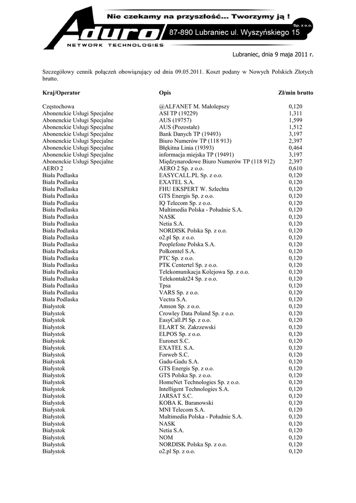 Lubraniec, dnia 9 maja 2011 r. Szczegółowy cennik połączeń obowiązujący od dnia 09.05.2011. Koszt podany w Nowych Polskich Złotych brutto. Kraj/Operator Opis Częstochowa Abonenckie Usługi Specjalne Abonenckie Usługi Specjalne Abonenckie Usługi Specjalne Abonenckie Usługi Specjalne Abonenckie Usługi Specjalne Abonenckie Usługi Specjalne Abonenckie Usługi Specjalne Abonenckie Usługi Specjalne AERO 2 Biała Podlaska Biała Podlaska Biała Podlaska Biała Podlaska Biała Podlaska Biała Podlaska Biała Podlaska Biała Podlaska Biała Podlaska Biała Podlaska Biała Podlaska Biała Podlaska Biała Podlaska Biała Podlaska Biała Podlaska Biała Podlaska Biała Podlaska Biała Podlaska Biała Podlaska Białystok Białystok Białystok Białystok Białystok Białystok Białystok Białystok Białystok Białystok Białystok Białystok Białystok Białystok Białystok Białystok Białystok Białystok Białystok Białystok Białystok Białystok @ALFANET M. Małolepszy ASI TP (19229) AUS (19757) AUS (Pozostałe) Bank Danych TP (19493) Biuro Numerów TP (118 913) Błękitna Linia (19393) informacja miejska TP (19491) Międzynarodowe Biuro Numerów TP (118 912) AERO 2 Sp. z o.o. EASYCALL.PL Sp. z o.o. EXATEL S.A. FHU EKSPERT W. Szlechta GTS Energis Sp. z o.o. IQ Telecom Sp. z o.o. Multimedia Polska - Południe S.A. NASK Netia S.A. NORDISK Polska Sp. z o.o. o2.pl Sp. z o.o. Peoplefone Polska S.A. Polkomtel S.A. PTC Sp. z o.o. PTK Centertel Sp. z o.o. Telekomunikacja Kolejowa Sp. z o.o. Telekontakt24 Sp. z o.o. Tpsa VARS Sp. z o.o. Vectra S.A. Amson Sp. z o.o. Crowley Data Poland Sp. z o.o. EasyCall.Pl Sp. z o.o. ELART St. Zakrzewski ELPOS Sp. z o.o. Euronet S.C. EXATEL S.A. Forweb S.C. Gadu-Gadu S.A. GTS Energis Sp. z o.o. GTS Polska Sp. z o.o. HomeNet Technologies Sp. z o.o. Intelligent Technologies S.A. JARSAT S.C. KOBA K. Baranowski MNI Telecom S.A. Multimedia Polska - Południe S.A. NASK Netia S.A. NOM NORDISK Polska Sp. z o.o. o2.pl Sp. z o.o. Zł/min brutto 0,120 1,311 1,599 1,512 3,197 2,397 0,464 3,197 2,397 0,610 0,120 0,120 0,120 0,120 0,120 0,120 0,120 0,120 0,120 0,120 0,120 0,120 0,120 0,120 0,120 0,120 0,120 0,120 0,120 0,120 0,120 0,120 0,120 0,120 0,120 0,120 0,120 0,120 0,120 0,120 0,120 0,120 0,120 0,120 0,120 0,120 0,120 0,120 0,120 0,120 0,120 Białystok Białystok Białystok Białystok Białystok Białystok Białystok Białystok Białystok Białystok Białystok Białystok Białystok Białystok Bielsko-Biała Bielsko-Biała Bielsko-Biała Bielsko-Biała Bielsko-Biała Bielsko-Biała Bielsko-Biała Bielsko-Biała Bielsko-Biała Bielsko-Biała Bielsko-Biała Bielsko-Biała Bielsko-Biała Bielsko-Biała Bielsko-Biała Bielsko-Biała Bielsko-Biała Bielsko-Biała Bielsko-Biała Bielsko-Biała Bielsko-Biała Bielsko-Biała Bielsko-Biała Bielsko-Biała Bielsko-Biała Bielsko-Biała Bielsko-Biała Bielsko-Biała Bydgoszcz Bydgoszcz Bydgoszcz Bydgoszcz Bydgoszcz Bydgoszcz Bydgoszcz Bydgoszcz Bydgoszcz Bydgoszcz Bydgoszcz Bydgoszcz Bydgoszcz Bydgoszcz Bydgoszcz Bydgoszcz Bydgoszcz Bydgoszcz Peoplefone Polska S.A. Polkomtel S.A. PTC Sp. z o.o. PTK Centertel Sp. z o.o. SULIKANET S.C. TARTEL Sp. z o.o. Telefonia Dialog S.A. Telekomunikacja Kolejowa Sp. z o.o. Telekomunikacja Podlasie Telekontakt24 Sp. z o.o. Teleoptimum Sp. z o.o. Tpsa VARS Sp. z o.o. Vectra S.A. Concept-T Sp. z o.o. Crowley Data Poland Sp. z o.o. EasyCALL.PL Sp. z o.o. EXATEL S.A. Gadu-Gadu S.A. Globitel Sp. z o.o. GTS Energis Sp. z o.o. GTS Polska Sp. z o.o. Hyperion S.A. Intelligent Technologies S.A. MYFON.PL S.C. NASK Netia S.A. NORDISK Polska Sp. z o.o. o2.pl Sp. z o.o. Peoplefone Polska S.A. Polkomtel S.A. PTC Sp. z o.o. PTK Centertel Sp. z o.o. Stream Communications Sp. z o.o. Telefonia Dialog S.A. Telekomunikacja Kolejowa Sp. z o.o. Telekontakt24 Sp. z o.o. Teleoptimum Sp. z o.o. TimPlus S.C. Tpsa VARS Sp. z o.o. Vectra S.A. Awacom Sp. z o.o. BTK Gawex Sp. J. Crowley Data Poland Sp. z o.o. Długie Rozmowy S.A. E-Telko Sp. z o.o. EASYCALL.PL Sp. z o.o. Elterix S.A. EXATEL S.A. Gadu-Gadu S.A. GST Internet Sp. z o.o. GTS Energis Sp. z o.o. GTS Polska Sp. z o.o. Hyperion S.A. Intelligent Technologies S.A. IPTELL Sp. z o.o. Mobyland Sp. z o.o. MTI Mobilna Telefonia Internetowa Sp. z o.o. Multimedia Polska S.A. 0,120 0,120 0,120 0,120 0,120 0,120 0,120 0,120 0,120 0,120 0,120 0,120 0,120 0,120 0,120 0,120 0,120 0,120 0,120 0,120 0,120 0,120 0,120 0,120 0,120 0,120 0,120 0,120 0,120 0,120 0,120 0,120 0,120 0,120 0,120 0,120 0,120 0,120 0,120 0,120 0,120 0,120 0,120 0,120 0,120 0,120 0,120 0,120 0,120 0,120 0,120 0,120 0,120 0,120 0,120 0,120 0,120 0,120 0,120 0,120 Bydgoszcz Bydgoszcz Bydgoszcz Bydgoszcz Bydgoszcz Bydgoszcz Bydgoszcz Bydgoszcz Bydgoszcz Bydgoszcz Bydgoszcz Bydgoszcz Bydgoszcz Bydgoszcz Bydgoszcz Bydgoszcz Bydgoszcz Bydgoszcz Bydgoszcz Bydgoszcz Bydgoszcz CenterNet Centertel Chełm Chełm Chełm Chełm Chełm Chełm Chełm Chełm Chełm Chełm Chełm Chełm Chełm Chełm Chełm Chełm Chełm Chełm Chełm Chełm Chełm Chełm Chełm Ciechanów Ciechanów Ciechanów Ciechanów Ciechanów Ciechanów Ciechanów Ciechanów Ciechanów Ciechanów Ciechanów Ciechanów Ciechanów Ciechanów NASK Netia S.A. NOM NORDISK Polska Sp. z o.o. o2.pl Sp. z o.o. P.K. TELE Sp.J. Peoplefone Polska S.A. PHU Televoice Piotr Radek Polkomtel S.A. PTC Sp. z o.o. PTK Centertel Sp. z o.o. Servcom Sp. z o.o. TARTEL Sp. z o.o. Telefonia Dialog S.A. Telekomunikacja Kolejowa Sp. z o.o. Telekontakt24 Sp. z o.o. Teleoptimum Sp. z o.o. Tpsa UPC Polska Sp. z o.o. VARS Sp. z o.o. VECTRA S.A. CenterNet S.A. PTK Centertel Sp. z o.o. ALGO PTI Concept-T Sp. z o.o. EASYCALL.PL Sp. z o.o. EXATEL S.A. FHU EKSPERT W. Szlechta GTS Energis Sp. z o.o. Hyperion S.A. IQ Telecom Sp. z o.o. Multimedia Polska S.A. NASK Netia S.A. NORDISK Polska Sp. z o.o. o2.pl Sp. z o.o. P4 Sp. z o.o. Peoplefone Polska S.A. Polkomtel S.A. PTC Sp. z o.o. PTK Centertel Sp. z o.o. Telekomunikacja Kolejowa Sp. z o.o. Telekontakt24 Sp. z o.o. Tpsa UPC Polska Sp. z 