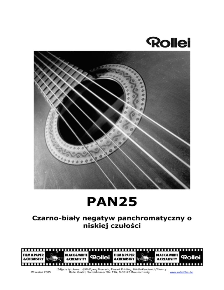 PAN25 Czarno-biały negatyw panchromatyczny o niskiej czułości Wrzesień 2005 Zdjęcie tytułowe: ©Wolfgang Moersch, Fineart Printing, Hürth-Kendenich/Niemcy Rollei GmbH, Salzdahlumer Str. 196, D-38126 Braunschweig www.rolleifilm.de Rollei PAN25 jest negatywem czarno-białym o czułości nominalnej ISO 25/15°. Poza nadzwyczajnie drobnym ziarnem odznacza się on wysoką rozdzielczością i ostrością konturów. Rollei PAN25 posiada dużą rezerwę czułości, która wynosi przy dopasowanym wywołaniu, do jednej wartości przesłony. Cienka warstwa emulsji powlekana jest na przeźroczystym nośniku i oferuje doskonałą ostrość przy bardzo drobnym ziarnie. Rollei PAN25 oferuje doskonałą jakość obrazu nawet przy bardzo dużych powiększeniach. Przeźroczysty nośnik otwiera z kolei możliwość zastosowania go jako czarno-białego slajdu. Właściwości: • niskoczuły film panchromatycznym • specjalna powłoka ułatwiająca transport w aparatach fotograficznych • nieograniczone zastosowanie zarówno przy świetle dziennym jak i sztucznym • poliestrowy nośnik odporny na pękanie i zrywanie, zdolność archiwalna LE 500 • czułość spektralna 400 – 650 nm • bardzo drobne ziarno i wysoka ostrość są podstawą doskonalej jakości negatywów • bardzo dobrze nadaje się do obróbki cyfrowej za pośrednictwem skanera Nośnik: poliester, 100µm, przeźroczysty Struktura warstw: - strona emulsji: - strona tylna: Indeks naświetlania: ISO 25/15° warstwa emulsji, warstwa antyhalacyjna warstwa NC, warstwa ochronna Krzywe charakterystyczne: wywołany w D76 wywołany w Rollei RHS Przechowywanie: Filmy fotograficzne należy generalnie chronić przed bezpośrednim światłem słonecznym, wysoką temperaturą oraz dużą wilgotnością powietrza. − − film nie naświetlony: film naświetlony: do 24 m-cy, zaleca się przechowywanie w chłodziarce przechowywać w chłodnym miejscu i możliwie najszybciej wywołać Obróbka: Rollei PAN25 należy obrabiać w całkowitej ciemności. Można go wywoływać w ogólnie dostępnych odczynnikach takich jak Agfa, Ilford, Kodak, Tetenal, Labor Partner. Wstępne przetestowanie czasów i temperatur wywoływania pomaga w uzyskaniu optymalnych rezultatów. Stosowanie innej, przez MACO nie testowanej chemii może prowadzić do znamiennych ubytków jakości manifestujących się dużym ziarnem i niską czułością filmu. Wrzesień 2005 Zdjęcie tytułowe: ©Wolfgang Moersch, Fineart Printing, Hürth-Kendenich/Niemcy Rollei GmbH, Salzdahlumer Str. 196, D-38126 Braunschweig www.rolleifilm.de Szczególnie polecane wywoływacze: Rollei High Speed (RHS) standard Rollei Low Speed (RLS) ekstremalnie drobne ziarno, doskonała rozpiętość tonalna Konfekcja: Film małoobrazkowy 135-36.......................... 135-36/10st................... 135-36/20st................... 35mm/30,5m................ Film średnioformatowy 120................................ RF2001 (w folii ochronnej) 120/12st......................... RF2001P (w drewnianej kasetce) 120/20st......................... RF2001Z (w plastikowej kasetce) Wywoływacze Rollei Low Speed 1+4................ RLS11/RLS12/RLS12K High Speed 1+7............... RHS11/RHS12/RHS12K High Contrast 1+4............ RHC11 Citrin Stop 1+19.............. RCS11/RCS12/RCS12K Fix Acid 1+4 – 1+7........... RXA11/RXA12/RXA12K Wetting Agent sc 1+1000... RWA12 Przerywacz Utrwalacz Zwilżacz RF2011 RF2011P (w drewnianej kasetce) RF2011Z (w plastikowej kasetce) RF2030 Tabela czasów: Film Wywoływacz 35mm 120 Temp. Rollei PAN25 Amaloco AM50 1+29 25 5 5 20°C D-76 stock 25 5 5 20°C Ethol UFG 1+5 40 15 21°C 1+14 25 6 20°C F 25 13,5 20°C ID-11 stock 25 5 5 20°C Ilfosol S 1+9 25 3,5 24°C Microdol-X 1+3 18 20°C Neofin Blue stock 25 12 20°C Rodinal 1+25 25 6 6 20°C Rodinal 1+50 25 11 11 20°C Rollei RHS 1+7 25 5 5 20°C Rollei RHS 1+12 25 7 7 20°C Rollei RLS 1+4 25 10 10 24°C X-tol stock 25 6,5 FX-39 HC-110 Wrzesień 2005 Roztwór ASA/ISO Zdjęcie tytułowe: ©Wolfgang Moersch, Fineart Printing, Hürth-Kendenich/Niemcy Rollei GmbH, Salzdahlumer Str. 196, D-38126 Braunschweig 20°C www.rolleifilm.de