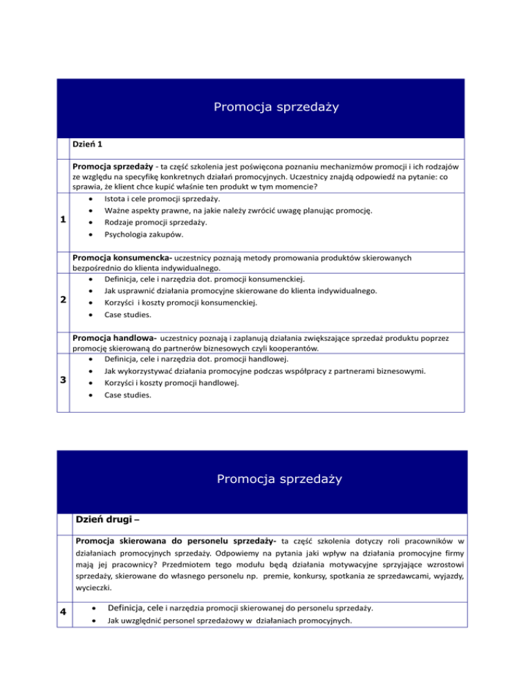 Promocja sprzedaży Dzieo 1 Promocja sprzedaży - ta częśd szkolenia jest poświęcona poznaniu mechanizmów promocji i ich rodzajów ze względu na specyfikę konkretnych działao promocyjnych. Uczestnicy znajdą odpowiedź na pytanie: co sprawia, że klient chce kupid właśnie ten produkt w tym momencie? Istota i cele promocji sprzedaży. Ważne aspekty prawne, na jakie należy zwrócid uwagę planując promocję. 1 Rodzaje promocji sprzedaży. Psychologia zakupów. Promocja konsumencka- uczestnicy poznają metody promowania produktów skierowanych bezpośrednio do klienta indywidualnego. Definicja, cele i narzędzia dot. promocji konsumenckiej. Jak usprawnid działania promocyjne skierowane do klienta indywidualnego. 2 Korzyści i koszty promocji konsumenckiej. Case studies. Promocja handlowa- uczestnicy poznają i zaplanują działania zwiększające sprzedaż produktu poprzez promocję skierowaną do partnerów biznesowych czyli kooperantów. Definicja, cele i narzędzia dot. promocji handlowej. Jak wykorzystywad działania promocyjne podczas współpracy z partnerami biznesowymi. 3 Korzyści i koszty promocji handlowej. Case studies. Promocja sprzedaży Dzień drugi – Promocja skierowana do personelu sprzedaży- ta częśd szkolenia dotyczy roli pracowników w działaniach promocyjnych sprzedaży. Odpowiemy na pytania jaki wpływ na działania promocyjne firmy mają jej pracownicy? Przedmiotem tego modułu będą działania motywacyjne sprzyjające wzrostowi sprzedaży, skierowane do własnego personelu np. premie, konkursy, spotkania ze sprzedawcami, wyjazdy, wycieczki. 4 Definicja, cele i narzędzia promocji skierowanej do personelu sprzedaży. Jak uwzględnid personel sprzedażowy w działaniach promocyjnych. Korzyści i koszty promocji skierowanej do personelu sprzedaży. Case studies. Promocji biznesowa- w tej części szkolenia zajmiemy się korzyściami 5 i ryzykiem związanym z udziałem w wydarzeniach masowych, takich jak targi i wystawy. Zajmiemy się przygotowaniem tego rodzaju promocji sprzedaży. Definicja, cele i narzędzia promocji biznesowej. Jak prowadzid działania promocyjne podczas targów, wystaw, festynów. Korzyści i koszty działao promocyjnych podczas imprez masowych. Case studies. Budowanie Programu Promocji Sprzedaży – ćwiczenia praktyczne 6 Posumowanie szkolenia. Uczestnicy zastosują nabyte kompetencje budując program promocji sprzedaży konkretnego produktu. Program każdej z grup będzie przedmiotem dyskusji na bazie wniosków, wypracowanych podczas wcześniejszych modułów szkolenia. Definiowanie odbiorcy programu. Określenie zestawu korzyści. Wybór metody i narzędzi. Opracowanie strategii wdrażania. Budżetowanie. Prezentacja programu.