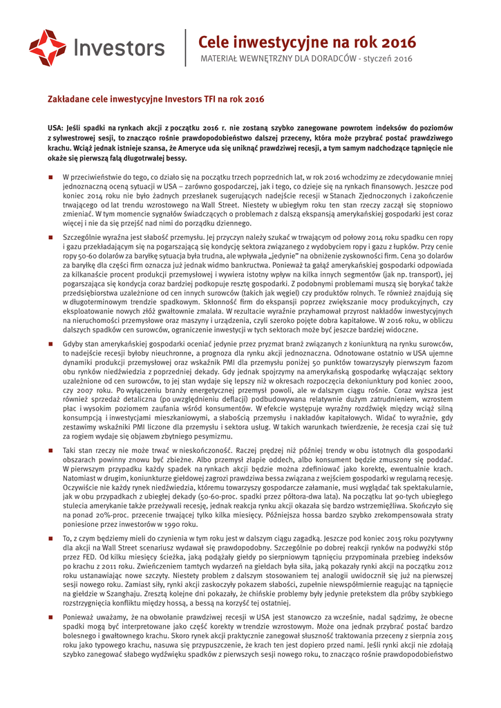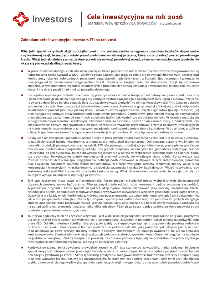 Cele inwestycyjne na rok 2016 MATERIAŁ WEWNĘTRZNY DLA DORADCÓW - styczeń 2016 Zakładane cele inwestycyjne Investors TFI na rok 2016 USA: Jeśli spadki na rynkach akcji z początku 2016 r. nie zostaną szybko zanegowane powrotem indeksów do poziomów z sylwestrowej sesji, to znacząco rośnie prawdopodobieństwo dalszej przeceny, która może przybrać postać prawdziwego krachu. Wciąż jednak istnieje szansa, że Ameryce uda się uniknąć prawdziwej recesji, a tym samym nadchodzące tąpnięcie nie okaże się pierwszą falą długotrwałej bessy. ▪▪ ▪▪ ▪▪ ▪▪ ▪▪ ▪▪ W przeciwieństwie do tego, co działo się na początku trzech poprzednich lat, w rok 2016 wchodzimy ze zdecydowanie mniej jednoznaczną oceną sytuacji w USA – zarówno gospodarczej, jak i tego, co dzieje się na rynkach finansowych. Jeszcze pod koniec 2014 roku nie było żadnych przesłanek sugerujących nadejście recesji w Stanach Zjednoczonych i zakończenie trwającego od lat trendu wzrostowego na Wall Street. Niestety w ubiegłym roku ten stan rzeczy zaczął się stopniowo zmieniać. W tym momencie sygnałów świadczących o problemach z dalszą ekspansją amerykańskiej gospodarki jest coraz więcej i nie da się przejść nad nimi do porządku dziennego. Szczególnie wyraźna jest słabość przemysłu. Jej przyczyn należy szukać w trwającym od połowy 2014 roku spadku cen ropy i gazu przekładającym się na pogarszającą się kondycję sektora związanego z wydobyciem ropy i gazu z łupków. Przy cenie ropy 50-60 dolarów za baryłkę sytuacja była trudna, ale wpływała „jedynie” na obniżenie zyskowności firm. Cena 30 dolarów za baryłkę dla części firm oznacza już jednak widmo bankructwa. Ponieważ ta gałąź amerykańskiej gospodarki odpowiada za kilkanaście procent produkcji przemysłowej i wywiera istotny wpływ na kilka innych segmentów (jak np. transport), jej pogarszająca się kondycja coraz bardziej podkopuje resztę gospodarki. Z podobnymi problemami muszą się borykać także przedsiębiorstwa uzależnione od cen innych surowców (takich jak węgiel) czy produktów rolnych. Te również znajdują się w długoterminowym trendzie spadkowym. Skłonność firm do ekspansji poprzez zwiększanie mocy produkcyjnych, czy eksploatowanie nowych złóż gwałtownie zmalała. W rezultacie wyraźnie przyhamował przyrost nakładów inwestycyjnych na nieruchomości przemysłowe oraz maszyny i urządzenia, czyli szeroko pojęte dobra kapitałowe. W 2016 roku, w obliczu dalszych spadków cen surowców, ograniczenie inwestycji w tych sektorach może być jeszcze bardziej widoczne. Gdyby stan amerykańskiej gospodarki oceniać jedynie przez pryzmat branż związanych z koniunkturą na rynku surowców, to nadejście recesji byłoby nieuchronne, a prognoza dla rynku akcji jednoznaczna. Odnotowane ostatnio w USA ujemne dynamiki produkcji przemysłowej oraz wskaźnik PMI dla przemysłu poniżej 50 punktów towarzyszyły pierwszym fazom obu rynków niedźwiedzia z poprzedniej dekady. Gdy jednak spojrzymy na amerykańską gospodarkę wyłączając sektory uzależnione od cen surowców, to jej stan wydaje się lepszy niż w okresach rozpoczęcia dekoniunktury pod koniec 2000, czy 2007 roku. Po wyłączeniu branży energetycznej przemysł powoli, ale w dalszym ciągu rośnie. Coraz wyższa jest również sprzedaż detaliczna (po uwzględnieniu deflacji) podbudowywana relatywnie dużym zatrudnieniem, wzrostem płac i wysokim poziomem zaufania wśród konsumentów. W efekcie występuje wyraźny rozdźwięk między wciąż silną konsumpcją i inwestycjami mieszkaniowymi, a słabością przemysłu i nakładów kapitałowych. Widać to wyraźnie, gdy zestawimy wskaźniki PMI liczone dla przemysłu i sektora usług. W takich warunkach twierdzenie, że recesja czai się tuż za rogiem wydaje się objawem zbytniego pesymizmu. Taki stan rzeczy nie może trwać w nieskończoność. Raczej prędzej niż później trendy w obu istotnych dla gospodarki obszarach powinny znowu być zbieżne. Albo przemysł złapie oddech, albo konsument będzie zmuszony się poddać. W pierwszym przypadku każdy spadek na rynkach akcji będzie można zdefiniować jako korektę, ewentualnie krach. Natomiast w drugim, koniunkturze giełdowej zagrozi prawdziwa bessa związana z wejściem gospodarki w regularną recesję. Oczywiście nie każdy rynek niedźwiedzia, któremu towarzyszy gospodarcze załamanie, musi wyglądać tak spektakularnie, jak w obu przypadkach z ubiegłej dekady (50-60-proc. spadki przez półtora-dwa lata). Na początku lat 90-tych ubiegłego stulecia amerykanie także przeżywali recesję, jednak reakcja rynku akcji okazała się bardzo wstrzemięźliwa. Skończyło się na ponad 20%-proc. przecenie trwającej tylko kilka miesięcy. Późniejsza hossa bardzo szybko zrekompensowała straty poniesione przez inwestorów w 1990 roku. To, z czym będziemy mieli do czynienia w tym roku jest w dalszym ciągu zagadką. Jeszcze pod koniec 2015 roku pozytywny dla akcji na Wall Street scenariusz wydawał się prawdopodobny. Szczególnie po dobrej reakcji rynków na podwyżki stóp przez FED. Od kilku miesięcy ścieżka, jaką podążały giełdy po sierpniowym tąpnięciu przypominała przebieg indeksów po krachu z 2011 roku. Zwieńczeniem tamtych wydarzeń na giełdach była siła, jaką pokazały rynki akcji na początku 2012 roku ustanawiając nowe szczyty. Niestety problem z dalszym stosowaniem tej analogii uwidocznił się już na pierwszej sesji nowego roku. Zamiast siły, rynki akcji zaskoczyły pokazem słabości, zupełnie niewspółmiernie reagując na tąpnięcie na giełdzie w Szanghaju. Zresztą kolejne dni pokazały, że chińskie problemy były jedynie pretekstem dla próby szybkiego rozstrzygnięcia konfliktu między hossą, a bessą na korzyść tej ostatniej. Ponieważ uważamy, że na obwołanie prawdziwej recesji w USA jest stanowczo za wcześnie, nadal sądzimy, że obe