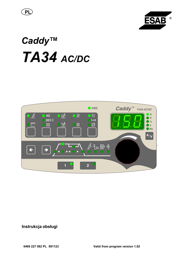 PL Caddy™ TA34 AC/DC Instrukcja obsługi 0460 227 082 PL 091123 Valid from program version 1.02 1 WPROWADZENIE . . . . . . . . . . . . . . . . . . . . . . . . . . . . . . . . . . . . . . . . . . . . . . . . . . 1.1 3 Panel sterowania . . . . . . . . . . . . . . . . . . . . . . . . . . . . . . . . . . . . . . . . . . . . . . . . . . . . . . . . . . 3 2 SPAWANIE TIG . . . . . . . . . . . . . . . . . . . . . . . . . . . . . . . . . . . . . . . . . . . . . . . . . . . . 4 2.1 2.2 2.3 Ustawienia . . . . . . . . . . . . . . . . . . . . . . . . . . . . . . . . . . . . . . . . . . . . . . . . . . . . . . . . . . . . . . . Objaśnienie symboli i funkcji . . . . . . . . . . . . . . . . . . . . . . . . . . . . . . . . . . . . . . . . . . . . . . . . Ukryte funkcje TIG . . . . . . . . . . . . . . . . . . . . . . . . . . . . . . . . . . . . . . . . . . . . . . . . . . . . . . . . . 4 5 10 3 SPAWANIE MMA . . . . . . . . . . . . . . . . . . . . . . . . . . . . . . . . . . . . . . . . . . . . . . . . . . . 11 3.1 3.2 3.3 Ustawienia . . . . . . . . . . . . . . . . . . . . . . . . . . . . . . . . . . . . . . . . . . . . . . . . . . . . . . . . . . . . . . . Objaśnienie symboli i funkcji . . . . . . . . . . . . . . . . . . . . . . . . . . . . . . . . . . . . . . . . . . . . . . . . Ukryte funkcje MMA . . . . . . . . . . . . . . . . . . . . . . . . . . . . . . . . . . . . . . . . . . . . . . . . . . . . . . . 11 11 12 4 PAMIĘĆ DANYCH SPAWANIA . . . . . . . . . . . . . . . . . . . . . . . . . . . . . . . . . . . . . . 5 KODY USTEREK . . . . . . . . . . . . . . . . . . . . . . . . . . . . . . . . . . . . . . . . . . . . . . . . . . . 13 13 5.1 5.2 Lista kodów uszkodzeń . . . . . . . . . . . . . . . . . . . . . . . . . . . . . . . . . . . . . . . . . . . . . . . . . . . . . Opisy kodów usterek . . . . . . . . . . . . . . . . . . . . . . . . . . . . . . . . . . . . . . . . . . . . . . . . . . . . . . . 13 14 6 ZAMAWIANIE CZĘŚCI ZAMIENNYCH . . . . . . . . . . . . . . . . . . . . . . . . . . . . . . . . NUMER ZAMÓWIENIOWY . . . . . . . . . . . . . . . . . . . . . . . . . . . . . . . . . . . . . . . . . . . . . 15 16 Zastrzegamy sobie prawo do wprowadzenia zmian. TOCo -2- PL 1 WPROWADZENIE Instrukcja zawiera opis obsługi panelu sterowania TA34 AC/DC. Informacje ogólne na temat obsługi znajdują się w instrukcji obsługi źródła prądu. Po podłączeniu zasilania, urządzenie przeprowadza samodiagnozę diod i wyświetlacza, po czym wyświetla wersję programu (w tym przykładzie jest to wersja 0.18). Instrukcje obsługi w innych językach można pobrać z witryny internetowej www.esab.com. 1.1 Panel sterowania Pokrętło ustawiania danych (prądu, napięcia, wartości procentowej, sekund lub częstotliwości) Wyświetlacz Wybór metody spawania TIG lub MMA Przycisk wyboru spawania TIG z: S S S prądem zmiennym AC prądem stałym DC prądem stałym DC - z pulsacją Przycisk wyboru spawania MMA z: S S S prądem zmiennym AC prądem stałym DC prądem stałym DC + Wybór zajarzania HF bi18d1oa lub LiftArct -3- PL Wybór sterowania 2-taktowego Ustawianie z panelu spawalniczego lub 4-taktowego , zmiana programu za pomocą spustu uchwytu lub podłączanie zdalnego sterowania Wyświetlanie funkcji VRD (obniżone napięcie obwodu otwartego) jest aktywne lub nieaktywne. Uwaga! Funkcja VRD działa w tych źródłach prądu, w których występuje. Wskazanie, który parametr jest wyświetlany na wyświetlaczu (prąd, napięcie, wartość procentowa, sekundy lub częstotliwość) Wybór wskazania prądu (A) lub wskazania napięcia (V) na wyświetlaczu w trakcie spawania Wskazanie wybranego parametru ustawień, patrz strona 6. Prawy przycisk służy także do obsługi funkcji ukrytych Przyciski ustawień pamięci danych spawania. Patrz strona 13. 2 SPAWANIE TIG 2.1 Ustawienia TIG bez pulsowania AC/DC i TIG z pulsowaniem DC Funkcja Zakres ustawień W stopniach: Wartość domyślna HF / LiftArc t 2) HF lub LiftArct - LiftArct 2-taktowe lub 4-taktowe - 2-taktowe 0-5s 0,1 s 0,5 s Czas narastania prądu 0 - 10 s 0,1 s 0,0 s Czas opadania prądu 0 - 10 s 0,1 s 1,0 s Czas powypływu gazu 0 - 25 s 0,1 s 10,0 s Prąd 4 - 220 A 1A 60 A Panel aktywny WYŁ. lub WŁ. - WŁ. Zmiana danych spustu WYŁ. lub WŁ. - WYŁ. Przystawka zdalnego sterowania WYŁ. lub WŁ. - WYŁ. 0 - 99 % - 30 % 2/4-taktowe 2) Czas przedwypływu gazu 1) Prąd min. bi18d1oa 2) -4- PL TIG z AC Funkcja Zakres ustawień W stopniach: Wartość domyślna Ustawienie balansu 50 - 98 %* 1% 50 % Ustawienie częstotliwości 10 - 152 Hz 1 - 3 Hz 65 Hz Wstępne rozgrzewanie elektrody 0 - 100 1 - *) Zależy od ustawienia częstotliwości. TIG z pulsowaniem DC Funkcja Zakres ustawień W stopniach: Wartość domyślna Prąd pulsujący 4 - 220 A 1A 60 A Czas pulsowania Micro Pulse 1) 0,01 - 2,5 s 0,001 - 0,250 s 0,01 s 0,001 s 1,0 s Prąd bazowy 4 - 220 A 1A 20 A Czas przerwy między impulsami Micro Pulse 1) 0,01 - 2,5 s 0,001 - 0,250 s 0,01 s 0,001 s 1,0 s 1) 2) Te funkcje to ukryte funkcje TIG, patrz opis w punkcie 2.3. Tych funkcji nie można zmienić w trakcie spawania 2.2 Objaśnienie symboli i funkcji VRD (Voltage Reducing Device) Funkcja VRD gwarantuje, że napięcie obwodu otwartego nie przekracza 35 V podczas przerwy w spawaniu. Informuje o tym święcąca dioda VRD. Funkcja VRD jest zablokowana, kiedy system wykryje rozpoczęcie spawania. Jeśli funkcja VRD zostanie włączona i napięcie obwodu otwartego przekroczy limit 35 V, na wyświetlaczu pojawi się komunikat o błędzie (16) i nie można będzie rozpocząć spawania, dopóki nie zostanie skasowany. Uwaga! Funkcja VRD działa w tych źródłach prądu, w których występuje. Spawanie TIG Spawanie TIG topi metal przedmiotu obrabianego, wykorzystując łuk zajarzony od elektrody wolframowej, która się nie topi. Jeziorko i elektroda zabezpieczone są gazem osłonowym. Prąd zmienny Zaletą prądu zmiennego jest mniejsze ryzyko ugięcia magnetycznego łuku i duża skuteczność rozbijania tlenków podcza