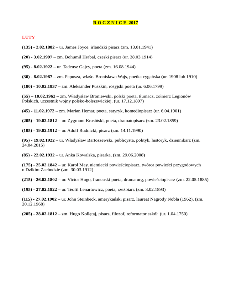 R O C Z N I C E 2017 LUTY (135) - 2.02.1882 – ur. James Joyce, irlandzki pisarz (zm. 13.01.1941) (20) - 3.02.1997 – zm. Bohumil Hrabal, czeski pisarz (ur. 28.03.1914) (95) - 8.02.1922 – ur. Tadeusz Gajcy, poeta (zm. 16.08.1944) (30) - 8.02.1987 – zm. Papusza, właśc. Bronisława Wajs, poetka cygańska (ur. 1908 lub 1910) (180) - 10.02.1837 – zm. Aleksander Puszkin, rosyjski poeta (ur. 6.06.1799) (55) – 10.02.1962 – zm. Władysław Broniewski, polski poeta, tłumacz, żołnierz Legionów Polskich, uczestnik wojny polsko-bolszewickiej. (ur. 17.12.1897) (45) - 11.02.1972 – zm. Marian Hemar, poeta, satyryk, komediopisarz (ur. 6.04.1901) (205) - 19.02.1812 – ur. Zygmunt Krasiński, poeta, dramatopisarz (zm. 23.02.1859) (105) - 19.02.1912 – ur. Adolf Rudnicki, pisarz (zm. 14.11.1990) (95) - 19.02.1922 – ur. Władysław Bartoszewski, publicysta, polityk, historyk, dziennikarz (zm. 24.04.2015) (85) - 22.02.1932 – ur. Anka Kowalska, pisarka, (zm. 29.06.2008) (175) - 25.02.1842 – ur. Karol May, niemiecki powieściopisarz, twórca powieści przygodowych o Dzikim Zachodzie (zm. 30.03.1912) (215) - 26.02.1802 – ur. Victor Hugo, francuski poeta, dramaturg, powieściopisarz (zm. 22.05.1885) (195) - 27.02.1822 – ur. Teofil Lenartowicz, poeta, rzeźbiarz (zm. 3.02.1893) (115) - 27.02.1902 – ur. John Steinbeck, amerykański pisarz, laureat Nagrody Nobla (1962), (zm. 20.12.1968) (205) - 28.02.1812 – zm. Hugo Kołłątaj, pisarz, filozof, reformator szkół (ur. 1.04.1750)