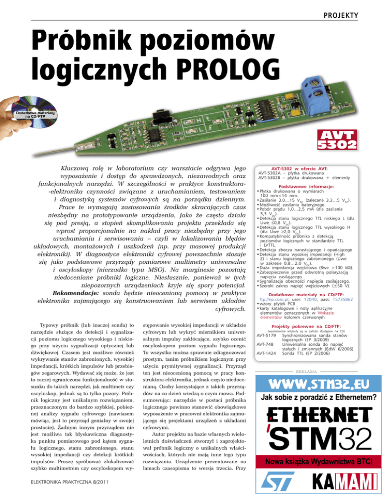 Próbnik poziomów logicznych PROLOG PROJEKTY Próbnik poziomów logicznych PROLOG Dodatkowe materiały na CD/FTP AVT 5302 Kluczową rolę w laboratorium czy warsztacie odgrywa jego wyposażenie i dostęp do sprawdzonych, niezawodnych oraz funkcjonalnych narzędzi. W szczególności w praktyce konstruktora-elektronika czynności związane z uruchamianiem, testowaniem i diagnostyką systemów cyfrowych są na porządku dziennym. Prace te wymagają zastosowania środków skracających czas niezbędny na prototypowanie urządzenia, jako że często działa się pod presją, a stopień skomplikowania projektu przekłada się wprost proporcjonalnie na nakład pracy niezbędny przy jego uruchamianiu i serwisowaniu – czyli w lokalizowaniu błędów układowych, montażowych i uszkodzeń (np. przy masowej produkcji elektroniki). W diagnostyce elektroniki cyfrowej powszechnie stosuje się jako podstawowe przyrządy pomiarowe multimetry uniwersalne i oscyloskopy (nierzadko typu MSO). Na marginesie pozostają niedoceniane próbniki logiczne. Niesłusznie, ponieważ w tych niepozornych urządzeniach kryje się spory potencjał. Rekomendacje: sonda będzie nieocenioną pomocą w praktyce elektronika zajmującego się konstruowaniem lub serwisem układów cyfrowych. Typowy próbnik (lub inaczej sonda) to narzędzie służące do detekcji i sygnalizacji poziomu logicznego wysokiego i niskiego przy użyciu sygnalizacji optycznej lub dźwiękowej. Czasem jest możliwe również wykrywanie stanów zabronionych, wysokiej impedancji, krótkich impulsów lub przebiegów zegarowych. Wydawać się może, że jest to raczej ograniczona funkcjonalność w stosunku do takich narzędzi, jak multimetr czy oscyloskop, jednak są to tylko pozory. Próbnik logiczny jest unikalnym rozwiązaniem, przeznaczonym do bardzo szybkiej, pobieżnej analizy sygnału cyfrowego (nawiasem mówiąc, jest to przyrząd genialny w swojej prostocie). Żadnym innym przyrządem nie jest możliwa tak błyskawiczna diagnostyka punktu pomiarowego pod kątem sygnału logicznego, stanu zabronionego, stanu wysokiej impedancji czy detekcji krótkich impulsów. Proszę spróbować zlokalizować szybko multimetrem czy oscyloskopem wyELEKTRONIKA PRAKTYCZNA 8/2011 stępowanie wysokiej impedancji w układzie cyfrowym lub wykryć miernikiem uniwersalnym impulsy zakłócające, szybko ocenić oscyloskopem poziom sygnału logicznego. To wszystko można sprawnie zdiagnozować prostym, tanim próbnikiem logicznym przy użyciu prymitywnej sygnalizacji. Przyrząd ten jest nieocenioną pomocą w pracy konstruktora-elektronika, jednak często niedocenianą. Osoby korzystające z takich przyrządów na co dzień wiedzą o czym mowa. Podsumowując: narzędzie w postaci próbnika logicznego powinno stanowić obowiązkowe wyposażenie w pracowni elektronika zajmującego się projektami urządzeń z układami cyfrowymi. Autor projektu na bazie własnych wieloletnich doświadczeń stworzył i zaprojektował próbnik logiczny o unikalnych właściwościach, których nie mają inne tego typu rozwiązania. Urządzenie prezentowane na łamach czasopisma to wersja trzecia. Przy AVT-5302 w ofercie AVT: AVT-5302A – płytka drukowana AVT-5302B – płytka drukowana + elementy Podstawowe informacje: •Płytka drukowana o wymiarach 100 mm×14 mm. •Zasilanie 3,0…15 VDC (zalecane 3,3…5 VDC). •Możliwość zasilania bateryjnego. •Pobór prądu 1,0…2,5 mA (dla zasilania 3,3 VDC). •Detekcja stanu logicznego TTL niskiego L (dla Uwe ≤0,8 VDC). •Detekcja stanu logicznego TTL wysokiego H (dla Uwe ≥2,0 VDC). •Kompatybilność próbnika z detekcją poziomów logicznych w standardzie TTL i LVTTL. •Detekcja zbocza narastającego i opadającego. •Detekcja stanu wysokiej impedancji (High Z) i stanu logicznego zabronionego (Uwe w zakresie 0,8…2,0 VDC). •Duża impedancja wejściowa (Rwe >100 kV). •Zabezpieczenie przed odwrotną polaryzacją napięcia zasilającego. •Sygnalizacja obecności napięcia zasilającego. •Szeroki zakres napięć wejściowych (±50 V). Dodatkowe materiały na CD/FTP: ftp://ep.com.pl, user: 12040, pass: 15735862 •wzory płytek PCB •karty katalogowe i noty aplikacyjne elementów oznaczonych w Wykazie elementów kolorem czerwonym Projekty pokrewne na CD/FTP: (wymienione artykuły są w całości dostępne na CD) AVT-5179 AVT-748 AVT-1424 Synchronizowana sonda stanów logicznych (EP 3/2009) Uniwersalna sonda do napięć stałych i zmiennych (EdW 6/2006) Sonda TTL (EP 2/2006) REKLAMA 21 PROJEKTY jego opracowaniu zostały określone następujące założenia: • Realizacja podstawowej funkcjonalności próbnika, czyli sygnalizowania poziomów logicznych TTL: niskiego, wysokiego, stanu zabronionego i wysokiej impedancji. • Wykrywanie zboczy narastających i opadających sygnałów oraz krótkich im- pulsów dodatnich i ujemnych o czasie trwania rzędu nanosekund, wykrywanie przebiegów cyfrowych o częstotliwościach rzędu dziesiątek MHz. Rysunek 1. Schemat ideowy próbnika logicznego 22 ELEKTRONIKA PRAKTYCZNA 8/2011 Próbnik poziomów logicznych PROLOG Na CD: karty katalogowe i noty aplikacyjne elementów oznaczonych w wykazie elementów kolorem czerwonym • Odporność na podanie na wejście sondy napięć znacznie przekraczających nominalny zakres pracy (rzędu dziesiątek V). • Szeroki zakres napięcia zasilania, możliwość zasilania urządzenia typowymi napięciami występującymi w układach cyfrowych (tj. 3,3 i 5 V), niewrażliwość na wahania napięcia zasilającego. • Odporność na dołączenie napięcia zasilającego o odwrotnej polaryzacji, sygnalizacja obecności napięcia zasilającego. • Bardzo mały pobór prądu umożliwiający zasilenie wprost z wyjścia układu cyfrowego (np. bramki logicznej lub linii GPIO mikrokontrolera). • Wejście próbnika o wysokiej impedancji i niewielkiej pojemności, wprowadzające możliwie małe obciążenie badanego punktu pomiarowego. • Miniaturyzacja urządze