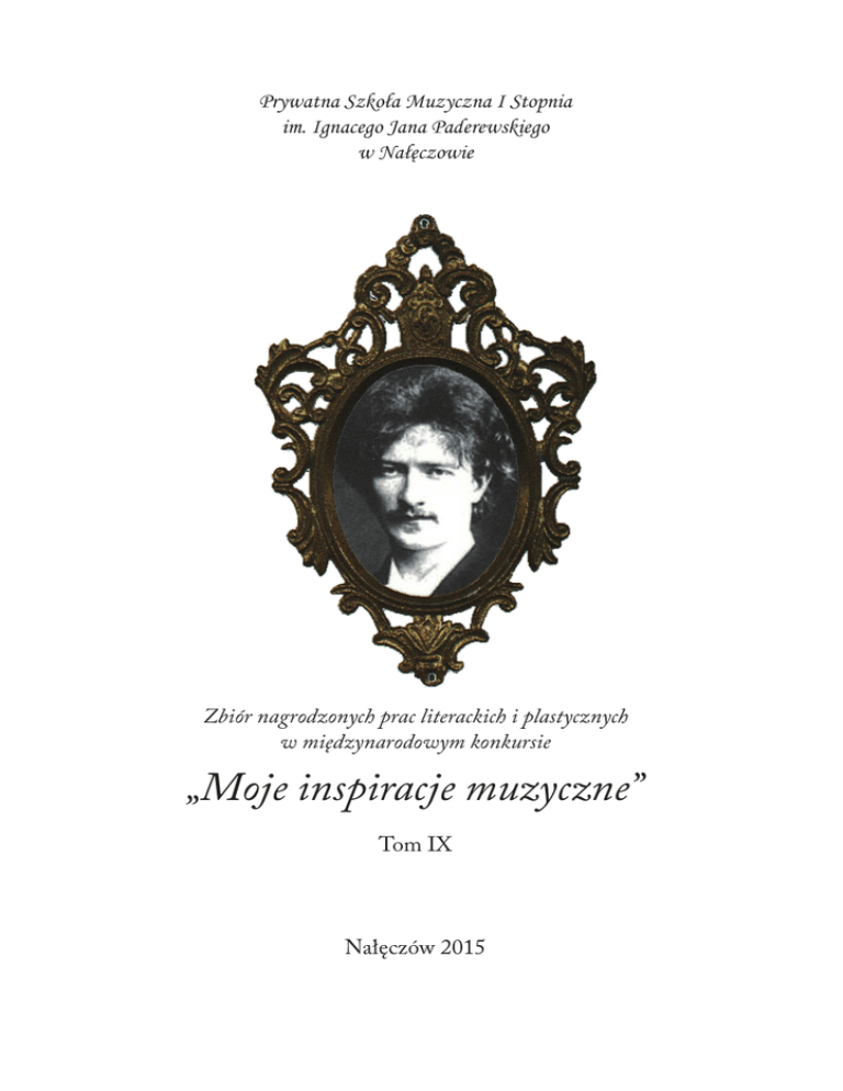 Prywatna Szkoła Muzyczna I Stopnia im. Ignacego Jana Paderewskiego w Nałęczowie Zbiór nagrodzonych prac literackich i plastycznych w międzynarodowym konkursie „Moje inspiracje muzyczne” Tom IX Nałęczów 2015 1 Copyright by Prywatna Szkoła Muzyczna I Stopnia im. Ignacego Jana Paderewskiego w Nałęczowie www.psmn.pl, e-mail: [email protected] Koncepcja edytorska i redakcja Wioletta Sieczkowska-Kos Korekta Wiesława Dobrowolska-Łuszczyńska Współorganizator Ministerstwo Kultury i Dziedzictwa Narodowego Centrum Edukacji Artystycznej Patronat medialny Redakcja czasopisma „Wychowanie muzyczne” ISBN: 978-83-62648-49-8 Wydawca i druk Wydawnictwo Drukarnia Best Print s.c. ul. Głowackiego 35, 20-060 Lublin tel. 605-953-905, email: [email protected] 2 Zatrzymać czas Dziecko ma w sobie wszystko, co warunkuje skuteczne wychowanie, w szczególności zaś nieustanną aktywność, w której zaangażowana jest cała jego osobowość; jest to aktywność istoty znajdującej się w okresie wzrostu, w stałym rozwoju. Zatem naturalne dążenie do zdobywania stanowi treść życia dziecka. Naszym zadaniem jest pielęgnowanie tej cechy. Musimy rozwijać jego spontaniczne zainteresowania, potrzebę działania i tworzenia. Roger Cousinet Sokrates - grecki filozof, uważany za największego obok Platona i Arystotelesa myśliciela starożytności, tak pisał o wychowaniu: Wychowanie przez muzykę jest najznakomitsze, bowiem rytm i harmonia najgłębiej wnikają w duszę wzbudzając wykształcenie w niej odwagi i przyzwoitości. Wykształcenie muzyczne uchodzi za środek wychowawczy potężniejszy od innych. Zwolennik intelektualizmu etycznego uznawał, że prawdziwa wiedza o tym, co słuszne i sprawiedliwe, zawsze prowadzi do cnoty, która jest warunkiem dobra i szczęścia. Do dnia dzisiejszego wielcy, acz skromni tego świata, mają odwagę powtarzać za Sokratesem: „Wiem, że nic nie wiem”. A przecież wyrocznia w Delfach ogłosiła go, najmądrzejszym człowiekiem świata. I choć od jego śmierci (zm. w 399 p.n.e. w Atenach) minęło tyle wieków, współczesna nauka prawdę tę ugruntowuje, potwierdzając faktami naukowymi, że nauka muzyki wspaniale wpływa na wszechstronny rozwój intelektualny i emocjonalny dziecka. Nauka muzyki zmniejsza poziom agresji, pomaga rozwiązywać problemy wychowawcze, uczy dyscypliny i porządkuje organizację pracy. Według współczesnej nauki, by muzyka mogła spełnić swoje funkcje, każde dziecko – niezależnie od poziomu jego predyspozycji – powinno uczyć się muzyki od najmłodszych lat. 3 Warto więc, drodzy Rodzice zrobić przerwę, dać sobie czas na weryfikację swoich zobowiązań wobec naszych polskich „skarbów” i zastanowić się, jakich rzeczy chciałbyś nauczyć swoje dzieci, żeby dobrze radziło sobie w szkole, w życiu i wśród ludzi? Co powinieneś zrobić, by zapewnić swojemu dziecku szczęśliwą i kreatywną przyszłość? Czas i walka z czasem trwa, a tymczasem pociąg życia pędzi i zmierza do kolejnego przystanku młodych ludzi. Warto więc zastanowić się nad dowodami naukowców, że ucząc dzieci muzyki dajesz im do ręki oręż takich wartości, jak: pewność siebie, ambicja, pomysłowość, empatia, komunikatywność, umiejętność współpracy w grupie, umiejętność koncentracji, dobra pamięć, potrzeba ładu i porządku, samodzielność, spostrzegawczość, a nade wszystko entuzjazm i umiejętność cieszenia się życiem. I o tym właśnie piszą uczestnicy konkursu. Ich prace to ekspresja, radość i szczęście. Jestem przekonana, że nie ma wśród nich fanów zdobywania kolejnych poziomów ogłupiających gier komputerowych. Uczestnicy tego konkursu to młodzi, wrażliwi, z bogatą wyobraźnią i myślący ludzie. Dzięki nim my organizatorzy i jurorzy jesteśmy wzruszeni i pełni wiary w prawo Fermata, głoszące, że: promień świetlny poruszający się (w dowolnym ośrodku) od punktu A do punktu B przebywa zawsze lokalnie minimalną drogę optyczną, czyli taką, na której przebycie potrzeba czasu najkrótszego*. Dla mnie tym promieniem jesteście wy twórczo i wielokierunkowo poszukujący swojego życiowego celu. Jestem przekonana, że wszyscy uczestnicy naszego konkursu z pewnością będą potrzebowali najkrótszego czasu na odebranie nagrody za ogromny wysiłek włożony w edukację muzyczną i artystyczną. Ta nagroda to satysfakcja i radość z muzyki oraz sztuki jej uprawiania. To także nagroda dla opiekunów, wychowawców i nauczycieli. Dziś jeszcze potrzebujecie wsparcia, wzmacniania i pielęgnacji fascynacji muzycznych. Ale już dziś słychać w was rytm i harmonię. * zasada wariacyjna w fizyce, sformułowana w 1662 przez Pierre’a de Fermata. 4 W tegorocznych pracach Każda nuta jest rozmową, wielobarwna, kolorowa, tu ekspresji są witraże, tu Muzyka syci i dodaje smaku, Nie dzieli, lecz łączy, tu jest pasja, język świata, tu Muzyka to wiosenny poranek, to radość, gniew, śmiech i płacz; ale niech budzi… co ranek wiosenna radość. Więc nawet jeżeli nie zostaną wielkimi muzykami, to korzystać będą z dobrodziejstw edukacji muzycznej, odważnie i przyzwoicie. Bo czego jak czego, ale odwagi odmówić im nie można. Życzę wszystkim uczestnikom tej i kolejnej edycji, by otaczali się tylko światem „Muzykolandii”, a „Złolandia” tego świata niech przestawi się na inne tory i omija Was szerokim łukiem. Wszystkim laureatom, uczestnikom oraz waszym opiekunom i dyrektorom serdecznie gratulujemy i dziękujemy za udział w tegorocznej edycji konkursu. Na kolejną edycję zapraszam wszystkich chętnych do wielkiej improwizacji. Temat XVII edycji: „Improwizacja nieokiełznana – dźwiękiem, słowem, pędzlem uprawiana” Wioletta Sieczkowska-Kos 5 Komunikat Jury Jury podczas oceny prac: dr hab. A. Panek, dr. B. Niścior, mgr Z. Strzyżyński, mgr inż. W. Sieczkowska-Kos, fot.: mgr A. Kos W XVI edycji konkursu „Moje inspiracje muzyczne” jury ocenia
