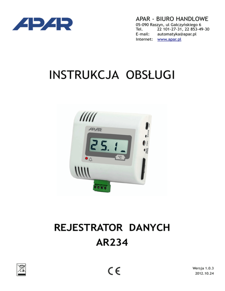 APAR - BIURO HANDLOWE 05-090 Raszyn, ul Gałczyńskiego 6 Tel. 22 101-27-31, 22 853-49-30 E-mail: [email protected] Internet: www.apar.pl INSTRUKCJA OBSŁUGI REJESTRATOR DANYCH AR234 Wersja 1.0.3 2012.10.24 Dziękujemy za wybór naszego produktu. Niniejsza instrukcja ułatwi Państwu prawidłową obsługę, bezpieczne użytkowanie i pełne wykorzystanie możliwości rejestratora. Przed montażem i uruchomieniem prosimy o przeczytanie i zrozumienie niniejszej instrukcji. W przypadku pytań prosimy o kontakt z doradcą technicznym. SPIS TREŚCI 1. ZALECENIA MONTAŻOWE............................................................... 3 2. OGÓLNA CHARAKTERYSTYKA REJESTRATORA……………………………….............. 3 3. ZAWARTOŚĆ ZESTAWU...................................................................4 4. DANE TECHNICZNE..................................................................... 5 5. WYMIARY OBUDOWY ORAZ OPIS ELEMENTÓW ZEWNĘTRZNYCH.................. 7 6. OPIS ZŁĄCZA POMIAROWEGO I POŁĄCZEŃ ELEKTRYCZNYCH..................... 7 7. PODŁĄCZANIE DO KOMPUTERA I INSTALACJA STEROWNIKÓW.................... 8 8. INSTALACJA OPROGRAMOWANIA...................................................... 8 9. USTAWIANIE PARAMETRÓW KONFIGURACYJNYCH……………………………………….... 8 9.1.CZAS I DATA....................................................................... 10 9.2.OPCJE REJESTRACJI.............................................................. 10 9.3.KONFIGURACJA WEJŚCIA POMIAROWEGO..................................... 11 9.4.OPCJE DOSTĘPU I IDENTYFIKACJI.............................................. 11 9.5.OPCJE WYŚWIETLANIA........................................................... 12 9.6.KONFIGURACJA WYJŚCIA ALARMOWEGO...................................... 12 10. OBSŁUGA I FUNKCJE KARTY SD/MMC............................................... 13 11. PRZEGLĄDANIE ZAREJESTROWANYCH POMIARÓW I ZDARZEŃ................... 13 12. SYGNALIZACJA KOMUNIKATÓW I BŁĘDÓW.......................................... 14 13. WAŻNE UWAGI EKSPLOATACYJNE .................................................14 14. WYMIANA BATERII...................................................................... 15 15. NOTATKI WŁASNE...................................................................... 16 ! Należy zwrócić szczególną uwagę na teksty oznaczone tym znakiem Producent zastrzega sobie prawo do dokonywania zmian w konstrukcji i oprogramowaniu urządzenia bez pogorszenia parametrów technicznych. 2 1. ZALECENIA MONTAŻOWE ! Przyrząd został zaprojektowany tak, aby zapewnić odpowiedni poziom odporności na większość zaburzeń, które mogą wystąpić w środowiskach pracy. W środowiskach o nieznanym poziomie zakłóceń zaleca się stosowanie następujących środków zapobiegających ewentualnemu zakłócaniu pracy przyrządu: stosować ekranowanie przewodów czujnikowych i sygnałowych, przy czym uziemienie ekranu powinno być jednopunktowe, wykonane jak najbliżej przyrządu unikać prowadzenia przewodów pomiarowych (sygnałowych) w bezpośrednim sąsiedztwie i równolegle do przewodów energetycznych i zasilających wskazane jest skręcanie parami przewodów sygnałowych dla czujników oporowych w połączeniu 3-przewodowym stosować jednakowe przewody unikać bliskości urządzeń zdalnie sterowanych, mierników elektromagnetycznych, obciążeń wysokiej mocy, obciążeń z fazową lub grupową regulacją mocy oraz innych urządzeń wytwarzających duże zakłócenia impulsowe uziemiać lub zerować metalowe szyny, na których montowane są przyrządy listwowe Przed rozpoczęciem pracy z urządzeniem należy usunąć folię zabezpieczającą okno wyświetlacza LCD. 2. OGÓLNA CHARAKTERYSTYKA REJESTRATORA rejestracja danych z wejścia pomiarowego oraz wewnętrznego czujnika temperatury 1 uniwersalne wejście pomiarowe (termorezystancyjne, termoparowe i analogowe) oraz wbudowany cyfrowy czujnik temperatury zapis danych w standardowym pliku tekstowym umieszczonym w wewnętrznej pamięci rejestratora lub na karcie SD/MMC w systemie FAT z możliwością odczytu poprzez interfejs USB obudowa przenośna dostosowana do montażu naściennego zasilanie bateryjne z możliwością wymiany baterii we własnym zakresie wyświetlacz LCD pokazujący wartości mierzone oraz komunikaty i błędy długi czas pracy na nowej baterii (do 5 lat, zależny od okresu pomiarowego, obecności karty SD/MMC i trybu pracy wyświetlacza) możliwość przenoszenia danych archiwalnych i konfiguracyjnych na karcie SD wewnętrzny zegar czasu rzeczywistego z podtrzymaniem bateryjnym kompensacja rezystancji linii dla czujników rezystancyjnych (automatyczna lub stała) kompensacja temperatury zimnych końców termopar (automatyczna lub stała) dołączone bezpłatne oprogramowanie umożliwiające konfigurację parametrów urządzenia oraz prezentację graficzną lub tekstową zarejestrowanych wyników, możliwość aktualizacji ze strony internetowej alarm dolny, górny, w paśmie i poza pasmem, sygnalizacja diodą LED programowalny rodzaj wejścia, zakres wskazań, okres pomiarowy, początek i koniec rejestracji oraz inne parametry konfiguracyjne takie jak: kalibracja zera i czułości, opcje karty SD/MMC, opcje wyświetlacza LCD, alarmy, numer identyfikacyjny (ID) możliwość zapobiegania nieautoryzowanej zmianie parametrów rejestratora z karty SD/MMC oraz przenoszeniu danych archiwalnych z pamięci wewnętrznej na kartę SD/MMC (wymagana autoryzacja karty lub dostęp swobodny) sposoby konfiguracji parametrów: - poprzez USB i program komputerowy (Windows 2000/XP/Vista/7) - z pliku konfiguracyjnego zapisanego na karcie SD/MMC suma kontrolna pozwalająca na wykrycie niepowołanej modyfikacji archiwum możliwość różnicowania archiwów od wielu rejestratorów tego samego typu poprzez indywidualne przypisanie numeru identyfikacyjnego (ID) 3 zapis danych do zapełnienia pamięci, sygnalizacja zape