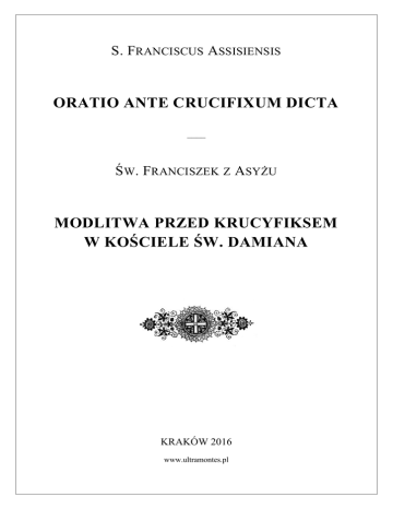 S. FRANCISCUS ASSISIENSIS ORATIO ANTE CRUCIFIXUM DICTA –––– ŚW. FRANCISZEK Z ASYŻU MODLITWA PRZED KRUCYFIKSEM W KOŚCIELE ŚW. DAMIANA KRAKÓW 2016 www.ultramontes.pl Oratio ante Crucifixum dicta S. FRANCISCUS ASSISIENSIS –––– Summe, gloriose Deus, illumina tenebras cordis mei et da mihi fidem rectam, spem certam et caritatem perfectam, sensum et cognitionem, Domine, ut faciam tuum sanctum et verax mandatum. Amen. ––––––– Modlitwa przed krucyfiksem w kościele św. Damiana ŚW. FRANCISZEK Z ASYŻU –––– Najwyższy, chwalebny Boże, rozjaśnij ciemności mego serca i daj mi, Panie, prawdziwą wiarę, niezachwianą nadzieję i doskonałą miłość, jak również zrozumienie i poznanie, abym mógł wypełniać Twą świętą i nieomylną wolę. Amen. (1) 2 ––––––––––– Opuscula Sancti Patris Francisci Assisiensis, denuo edidit iuxta codices mss. Caietanus Esser O.F.M., EDITIONES COLLEGII S. BONAVENTURAE AD CLARAS AQUAS. Grottaferrata (Roma) 1978, p. 224. Pisma św. Franciszka z Asyżu. Warszawa 1976, s. 174. (a) Przypisy: (1) Przekład z tekstu łacińskiego zamieszczonego przez Kajetana Essera OFMCap., w: Studien zu den Opuscula des hl. Franziskus von Assisi, Rzym 1973, s. 83. (a) Por. 1) Św. Franciszek z Asyżu, a) List do wiernych (Epistola ad fideles). b) De vera et perfecta laetitia. O prawdziwej i doskonałej radości. c) Laudes (Pochwały). d) Salutatio Beatae Virginis. Pozdrowienie do Błogosławionej Dziewicy. e) Canticum fratris Solis vel Laudes creaturarum. Pieśń słoneczna albo pochwała stworzeń. 2) F. J. Holzwarth, Historia powszechna. Czasy Wojen Krzyżowych. Św. Dominik i św. Franciszek z Asyżu. (b) 3) Ks. Piotr Skarga SI, Żywoty Świętych Starego i Nowego Zakonu na każdy dzień przez cały rok. 4) P. Vitus a Bussum OFMCap., De spiritualitate franciscana. Aliqua capita fundamentalia. 5) Św. Bonawentura, a) Żywot Pana naszego Jezusa Chrystusa w pobożnych rozmyślaniach zawarty (Meditationes Vitae Christi). b) Declaratio terminorum theologicorum. c) Breviloquium. 3 6) P. Parthenius Minges OFM, a) Compendium theologiae dogmaticae generalis. b) Compendium theologiae dogmaticae specialis. c) Ecclesia est infallibilis. d) De religione judaica postchristiana. e) Falsa systemata de relatione inter fidem et rationem. Modernismus. 7) P. Albertus a Bulsano OFMCap., De Tolerantismo religioso. 8) Fr. Josephus Calasanctius Card. Vives OFMCap., a) Summula Summae Theologicae Angelici Doctoris S. Thomae Aquinatis. b) Manuale devotorum Beatae Mariae Virginis. (b) "Św. Franciszek z Asyżu (Franciscus), Wyznawca – święto 4 października. Jan Bernardone, syn bogatego kupca, sukiennika Piotra Bernardone, urodził się w Asyżu (Assisi) w r. 1182, zwany w domu «Francesco» = francuzik, z powodu zamiłowania do języka francuskiego; przezwisko to pozostało mu na całe życie, podczas gdy imię chrzestne poszło w zapomnienie. Początkowo był oddany beztroskiej wesołości współczesnej młodzieży. Po krótkiej niewoli w Perugii (1202) nastał przełom w jego życiu i zapatrywaniach. Franciszek ujrzał prawdziwe szczęście i swobodę człowieka w uniezależnieniu się od świata, naśladowaniu Chrystusa i w powrocie do ewangelicznego ubóstwa. Rozdał więc wszystko ubogim, a gdy go ojciec wobec biskupa miejscowego wydziedziczył, wyrzekł się i ojca i zwrócił mu ubranie, a sam przywdział wór pokutny i żył jako pustelnik pod Asyżem, gdzie odbudował trzy zniszczone kościoły, pomiędzy nimi ulubioną swą «porcjunkulę» (cząsteczkę). W r. 1209 poznał z natchnienia Bożego ostateczne swoje powołanie w ewangelizowaniu świata w ubóstwie i pokoju, stosownie do słów Zbawiciela u Mat. 10, 7-15. Wysłał więc pierwszych swych uczniów jako kaznodziejów wędrownych i dał im w r. 1210 pierwszą regułę, zatwierdzoną ustnie przez Innocentego III. Sam odbywał podróże misyjne do Francji i Hiszpanii (1213 – 1215), do Egiptu (1219), przyjęty z szacunkiem przez sułtana, choć opowiadanie ewangelii wśród mahometan okazało się bezskuteczne. Jednocześnie trwała działalność kaznodziejska we Włoszech. W r. 1220 z powodu choroby i rozpoczynających się już nieporozumień wśród braci co do rozciągłości reguły złożył przełożeństwo. W r. 1223 zatwierdził Honoriusz III ostatecznie rozszerzoną II regułę zakonu «braci mniejszych», jak odtąd zwali się zakonnicy Franciszka. 14 września r. 1224 otrzymał Franciszek na górze Alwerni stygmaty Męki Pańskiej, pierwszy znany w dziejach Kościoła fakt tego zjawiska. Umarł 3 października r. 1226 pod Asyżem. Kanonizowany w roku 1228. Franciszek, «seraficki święty», jest najpopularniejszą postacią wśród bohaterów wiary i wzorem zawsze jaśniejącym iście apostolskiego życia. Nawet innowiercy są pod urokiem tej postaci, tak iż bez przesady wolno powiedzieć, że cały świat go czci jako wysłannika Pana. 4 Były w Kościele nieraz tendencje do nawrotu ku ubóstwu apostolskiemu, często wypaczone i gubiące się w lotnych piaskach herezji. Franciszek uderzył we właściwą strunę. «Gdy świat począł stygnąć», frigescente mundo – jak mówi liturgia w święto stygmatów – umiał ten świat XIII wieku, świat żelaza i krwi, szarpany bratobójczymi walkami, świat ucisku i chciwości, zwrócić na inną drogę i przyprowadzić do jedynego Dawcy szczęścia i pokoju. Sam Franciszek nie był i nie chciał być kapłanem (pozostał diakonem). Jego działalność skierowana była głównie na odnowienie laikatu przez trzecie zakony dla świeckich. Potężny duch odrodzenia religijnego, który przeszedł przez świat chrześcijański w XIII i XIV wieku, jest dziełem reformy franciszkańskiej". – Biskup Karol Radoński, Święci i Błogosławieni Kościoła Katolickiego. Encyklopedia Hagiograficzna. Warszawa – Poznań – Lublin [1947], ss. 131-132. (Przypisy literowe od red. Ultra montes). ( HTM ) © Ultra montes
