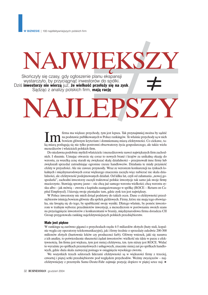 W BIZNESIE | 100 najefektywniejszych polskich firm NAJWI¢KSZY = Skoƒczy∏y si´ czasy, gdy og∏oszenie planu ekspansji wystarczy∏o, by przyciàgnàç inwestorów do spó∏ki. DziÊ inwestorzy nie wierzà ju˝, ˝e wielkoÊç prze∏o˝y si´ na zysk. Sàdzàc z analizy polskich firm, majà racj´ NAJLEPSZY Im firma ma wi´ksze przychody, tym jest lepsza. Tak przynajmniej mo˝na by sàdziç na podstawie publikowanych w Polsce rankingów. To w∏aÊnie przychody sà w nich bowiem g∏ównym kryterium i domniemanà miarà efektywnoÊci. Co ciekawe, takà miarà pos∏ugujà si´ nie tylko postronni obserwatorzy ˝ycia gospodarczego, ale tak˝e wielu mened˝erów i w∏aÊcicieli polskich firm. Do niedawna podobnie myÊleli w∏aÊciciele i mened˝erowie nawet najwi´kszych firm zachodnich. I s∏usznie. Uznajàc otwarcie si´ coraz to nowych bran˝ i krajów za unikalnà okazj´ do wzrostu, za wszelkà cen´ starali si´ zwi´kszaç skal´ dzia∏alnoÊci – przejmowali inne firmy lub zwi´kszali sprzeda˝ zatrudniajàc ogromne rzesze handlowców. Dzia∏ania te mia∏y przynieÊç efekty w przysz∏oÊci. Ale nie zawsze przynosi∏y. Wraz ze wzrostem konkurencji na rynkach lokalnych i mi´dzynarodowych coraz wi´kszego znaczenia zacz´∏a wi´c nabieraç nie skala dzia∏alnoÊci, ale efektywnoÊç podejmowanych dzia∏aƒ. Od kilku lat, czyli od za∏amania „nowej gospodarki”, zachodni inwestorzy zacz´li traktowaç polskie inwestycje tak samo jak swoje firmy macierzyste. Stawiajà spraw´ jasno – nie chcà ju˝ samego wzrostu wielkoÊci; chcà wzrostu zysku albo – jak mówià – zwrotu z kapita∏u zaanga˝owanego w spó∏k´ (ROCE – Return on Capital Employed). I kierujà swoje pieniàdze tam, gdzie zysk ten jest najwi´kszy. W Polsce inwestorzy nie mieli dotàd podstawy do takich ocen. Dane o efektywnoÊci przedsi´biorstw istniejà bowiem g∏ównie dla spó∏ek gie∏dowych. Firmy, które nie majà tego obowiàzku, nie kwapià si´ do tego, by upubliczniç swoje wyniki. Dlatego w∏aÊnie, by pomóc inwestorom w trafnym wyborze przedmiotów inwestycji, a mened˝erom w porównaniu swoich szans na przyciàgni´cie inwestorów z konkurentami w bran˝y, mi´dzynarodowa firma doradcza CII Group przygotowa∏a ranking najefektywniejszych polskich przedsi´biorstw. Ma∏e jest pi´kne ▲ W rankingu sà zarówno giganci o przychodach rz´du 4-5 miliardów z∏otych (huty stali, kopalnie w´gla czy operatorzy telekomunikacyjni), jak i firmy Êrednie o sprzeda˝y zaledwie 200-300 milionów z∏otych (hurtownie leków czy producenci farb). G∏ówny wniosek, jaki si´ nasuwa z ich analizy, to potwierdzenie s∏usznoÊci ˝àdaƒ inwestorów: wielkoÊç nie idzie w parze z efektywnoÊcià. Im firma jest wi´ksza, tym jest mniej efektywna, tzn. tym ni˝szy jest ROCE. Widaç to wyraênie po spó∏kach przemys∏owych i us∏ugowych, znacznie mniej zaÊ po spó∏kach handlowych, gdzie du˝a skala zazwyczaj pomaga w osiàgni´ciu wysokiego zwrotu. We wszystkich trzech sektorach liderami efektywnoÊci sà w wi´kszoÊci firmy z trzeciej, czwartej i piàtej setki przedsi´biorstw pod wzgl´dem przychodów. Weêmy zwyci´zców – najefektywniejszy z przemys∏u Same-Deutz-Fahr zajmuje pozycj´ dopiero w piàtej setce naj32 BUSINESSMAN grudzieƒ 2004 RANKING ROCE Lp. 1 2 3 4 5 6 7 8 9 10 11 12 13 14 15 16 17 18 19 20 21 22 23 24 25 26 27 28 29 30 31 32 33 34 35 36 37 38 39 40 41 42 43 44 45 46 47 48 49 50 51 52 53 54 55 56 57 58 59 60 61 nazwa firmy ROCE Foster Wheeler Energia Polska Sp. z o.o. 162,6% Hurtownia Materia∏ów Budowlanych BUDMAT 144,0% DaimlerChrysler Automotive Polska Sp. z o.o. 124,6% Same Deutz-Fahr Polska Sp. z o.o. 116,5% Hurtap SA 108,7% IBM Polska Sp. z o.o. 100,7% Man-Star Trucks Sp. z o.o. 82,1% Renault Polska Sp. z o.o. 78,3% Danone Sp. z o.o. 75,2% Telewizja Polsat SA 75,0% Skoda Auto Polska SA 70,1% Fabryka Farb i Lakierów Ânie˝ka SA 68,9% PHUP Andrzej Szeszycki 67,6% Silfarm Sp. z o.o. 67,6% Ball Packaging Europe Radomsko Sp. z o.o. 67,2% Kolporter SA 64,6% ThyssenKrupp Energostal SA 64,1% Faurecia Fotele Samochodowe Sp. z o.o. 60,9% Unilever Polska SA 59,8% Stalprofil SA 58,6% B.S.K. RETURN Sp. z o.o. 57,3% TRW Polska Sp. z o.o. 56,5% Tchibo Warszawa Sp. z o.o. 55,6% Konsorcjum Dystrybutorów Wyrobów Tytoniowych SA 52,3% Polski Koks SA 51,3% BOS SA 50,3% Philips Lighting Pabianice SA 48,9% Toyota Motor Poland Company Limited Sp. z o.o. 47,4% Avon Cosmetics Polska Sp. z o.o. 44,8% Grupa Polska Stal Sp. z o.o. 44,6% Rettig-Heating Sp. z o.o. 44,2% Volkswagen Motor Polska Sp. z o.o. 44,1% Alstom Power Sp. z o.o. 43,7% Profarm Sp. z o.o. 43,5% Dystrybucja Logistyka Serwis SA 40,7% Pronox Technology SA 39,5% Thomson Multimedia Polska Sp. z o.o. 38,4% Antalis Poland Sp. z o.o. 37,5% Totalizator Sportowy Sp. z o.o. 37,0% Atlas SA 36,4% Danfoss Sp. z o.o. 34,4% POSW Z∏omrex Sp. z o.o. 33,6% Frantschach Âwiecie SA 33,3% LG Electronics Sp. z o.o. 32,2% Brenntag Polska Sp. z o.o. 31,9% Faurecia Wa∏brzych Sp. z o.o. 31,9% Rafako SA 31,6% KGHM Metraco Sp. z o.o. 31,0% Stahlschmidt & Maiworm Sp. z o.o. 31,0% ZOMAR SA 30,0% Rafineria Trzebinia SA 29,8% Pfleiderer Grajewo SA 29,5% Ambra SA 29,3% GANT Sp. z o.o. 28,9% Diageo Polska Sp. z o.o. 28,4% Polska Telefonia Cyfrowa Sp. z o.o. 26,6% APOFARM GROUP Unia Hurtowni Aptekarskich Sp. z o.o. 26,1% REHAU Sp. z o.o. 26,0% Polmos Bia∏ystok SA 25,9% ELNORD SA 25,7% PSE-Electra Sp. z o.o. 25,0% 34 BUSINESSMAN grudzieƒ 2004 przychody ze sprzeda˝y sektor (mln z∏) 407,2 us∏ugi 331,5 handel 1601,5 handel 316,9 przemys∏ 517,5 handel 528,5 us∏ugi 432,3 handel 2026,3 handel 842,9 przemys∏ 717,6 us∏ugi 1677,0 handel 291,6 przemys∏ 342,5 handel 339,4 handel 465,9 przemys∏ 946,3 handel 569,3 handel 981,9 przemys∏ 2261,6 przemys∏ 879,0 handel 349,1 handel 1450,1 przemys∏ 583,5 handel 1193,8 handel 2040,7 handel 614,0 handel 447,4 przemys∏ 1880,8 handel 761,4 handel 527,0 handel 313,0 przemys∏ 3