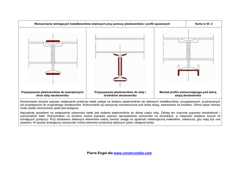 Wzmacnianie istniejących kształtowników stalowych przy pomocy płaskowników i profili spawanych Przyspawanie płaskowników do zewnętrznych stron stóp dwuteownika Przyspawanie płaskowników do stóp i środników dwuteownika Karta nr III- 2 MontaŜ profilu wzmacniającego pod dolną stopą dwuteownika Wzmacnianie stropów poprzez zwiększenie przekroju belek polega na dodaniu płaskowników lub stalowych kształtowników, przyspawanych, przykręcanych lub przyklejanych do oryginalnego dwuteownika. Wzmocnienia są zazwyczaj rozmieszczone pod dolną stopą, ewentualnie na środniku. Górna stopa równieŜ moŜe zostać wzmocniona, jeŜeli jest dostępna. Najczęściej sposobem na zwiększenie sztywności belek jest dodanie płaskowników do dolnej części stóp. Zabieg ten znacznie poprawia bezwładność i wytrzymałość belki. Wytrzymałość na ścinanie moŜna poprawić poprzez wprowadzenie wzmocnień na środnikach, w miejscach działania duŜych sił ścinających (podpory). Przy dodawaniu stalowych elementów naleŜy zwrócić uwagę na zgodność metalurgiczną materiałów, zwłaszcza, gdy mają być one spawane. W sposób analogiczny wzmacniać moŜna elementy konstrukcji stalowych (patrz następna karta). Pierre Engel dla www.constructalia.com