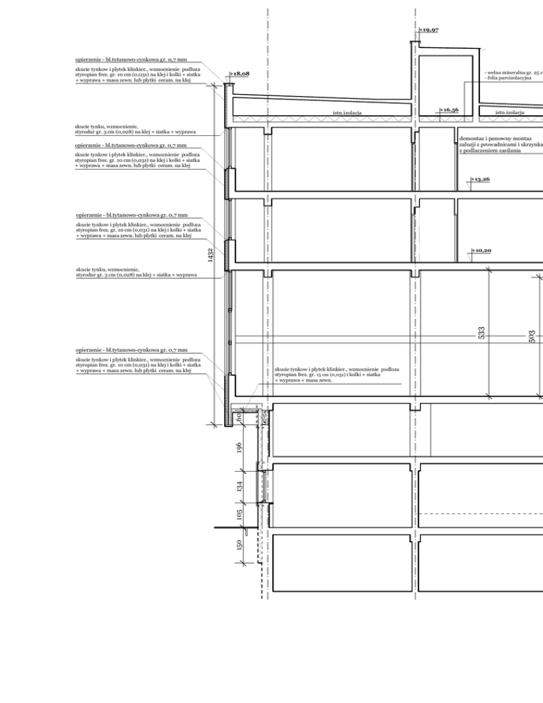 +19,97 opierzenie - bl.tytanowo-cynkowa gr. 0,7 mm skucie tynkow i plytek klinkier., wzmocnienie podloza styropian frez. gr. 10 cm (0,031) na klej i kolki + siatka + wyprawa + masa zewn. lub plytki ceram. na klej - welna mineralna gr. 25 c - folia paroizolacyjna +18,08 istn.izolacja +16,56 istn.izolacja skucie tynku, wzmocnienie, styrodur gr. 3 cm (0,028) na klej + siatka + wyprawa demontaz i ponowny montaz zaluzji z prowadnicami i skrzynka z podlaczeniem zasilania opierzenie - bl.tytanowo-cynkowa gr. 0,7 mm skucie tynkow i plytek klinkier., wzmocnienie podloza styropian frez. gr. 10 cm (0,031) na klej i kolki + siatka + wyprawa + masa zewn. lub plytki ceram. na klej +13,26 opierzenie - bl.tytanowo-cynkowa gr. 0,7 mm skucie tynkow i plytek klinkier., wzmocnienie podloza styropian frez. gr. 10 cm (0,031) na klej i kolki + siatka + wyprawa + masa zewn. lub plytki ceram. na klej 1432 +10,20 opierzenie - bl.tytanowo-cynkowa gr. 0,7 mm skucie tynkow i plytek klinkier., wzmocnienie podloza styropian frez. gr. 10 cm (0,031) na klej i kolki + siatka + wyprawa + masa zewn. lub plytki ceram. na klej 150 105 134 196 60 skucie tynkow i plytek klinkier., wzmocnienie podloza styropian frez. gr. 15 cm (0,031) i kolki + siatka + wyprawa + masa zewn. 503 533 skucie tynku, wzmocnienie, styrodur gr. 3 cm (0,028) na klej + siatka + wyprawa opierzenie - bl.tytanowo-cynkowa gr. 0,7 mm skucie tynkow, wzmocnienie podloza styrodur gr. 3 cm (0,028) i kolki + siatka + wyprawa + masa zewn. m (0,039) +17,23 skucie tynkow, wzmocnienie podloza styrodur gr. 3 cm (0,028) i kolki + siatka + wyprawa + masa zewn. ami skucie tynkow i plytek klinkier., wzmocnienie podloza styropian frez. gr. 15 cm (0,031) na klej i kolki + siatka + wyprawa + masa zewn. lub plytki ceram. na klej opierzenie - bl.tytanowo-cynkowa gr. 0,7 mm demontaz i ponowny montaz krat +10,85 opierzenie - bl.tytanowo-cynkowa gr. 0,7 mm 18 65 skucie tynku gzymsu, wzmocnienie, styropianu gr. 3 cm (0,021) na klej + siatka + wyprawa + masa zewn. 225 255 1119 407 278 skucie tynkow i plytek klinkier., wzmocnienie podloza styropian frez. gr. 10 cm (0,031) i kolki + siatka + wyprawa + masa zewn. 150 krata stalowa 170 -0,58 90 137 +2,41 193 60 149 +4,96 PRZEKROJ I-I -3,28 PROJEKT BUDOWLANO-WYKONAWCZY docieplenia scian zewn. czesci budynku z lat 70-tych XX w. PAN Biblioteki Gdanskiej - Etap III. Inwestor: Polska Akademia Nauk Biblioteka Gdanska ul. Walowa 15, 80-858 Gdansk Projektant: arch. Jaromir Czernichowski Sprawdzjacy: arch. Maria Czernichowska specj.archit. - nr upr. 4440/Gd/90 specj.archit. - nr upr.1140/61 Skala: Data opracow.: 14 sierpnia 2015 Nr rys.: 1:100 05