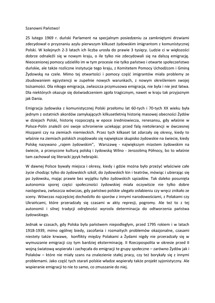 Szanowni Państwo! 25 lutego 1969 r. duński Parlament na specjalnym posiedzeniu za zamkniętymi drzwiami zdecydował o przyznaniu azylu pierwszym kilkuset żydowskim imigrantom z komunistycznej Polski. W kolejnych 2-3 latach ich liczba urosła do prawie 3 tysięcy. Ludzie ci w większości dobrze odnaleźli się w nowym kraju, o ile tylko nie zdecydowali się na dalszą emigrację. Nieocenionej pomocy udzieliło im w tym procesie nie tylko państwo i otwarte społeczeństwo duńskie, ale także rozliczne instytucje tego kraju, z Komitetem Pomocy Uchodźcom i Gminą Żydowską na czele. Mimo tej otwartości i pomocy część imigrantów miała problemy ze zbudowaniem egzystencji w zupełnie nowych warunkach, z nowym określeniem swojej tożsamości. Dla nikogo emigracja, zwłaszcza przymusowa emigracja, nie była i nie jest łatwa. Dla niektórych okazuje się doświadczeniem zgoła tragicznym, nawet w kraju tak przyjaznym jak Dania. Emigracja żydowska z komunistycznej Polski przełomu lat 60-tych i 70-tych XX wieku była jednym z ostatnich akordów zamykających kilkusetletnią historię masowej obecności Żydów w dziejach Polski, historię rozpoczętą w epoce średniowiecza, renesansu, gdy właśnie w Polsce-Polin znaleźli oni swoje schronienie uciekając przed falą nietolerancji w ówczesnej Hiszpanii czy na ziemiach niemieckich. Przez tych kilkaset lat zdarzały się okresy, kiedy to właśnie na ziemiach polskich znajdowało się największe skupisko żydowskie na świecie, kiedy Polskę nazywano „rajem żydowskim”, Warszawę - największym miastem żydowskim na świecie, a przesycone kulturą polską i żydowską Wilno - Jerozolimą Północy, bo to właśnie tam zachował się literacki język hebrajski. W dawnej Polsce bywały miejsca i okresy, kiedy i gdzie można było przeżyć właściwie całe życie chodząc tylko do żydowskich szkół, do żydowskich kin i teatrów, mówiąc i ubierając się po żydowsku, mając prawie bez wyjątku tylko żydowskich sąsiadów. Tak daleko posunięta autonomia sporej części społeczności żydowskiej miała oczywiście nie tylko dobre następstwa, zwłaszcza wówczas, gdy państwo polskie ulegało osłabieniu czy wręcz znikało ze sceny. Wówczas najczęściej dochodziło do sporów z innymi narodowościami, z Polakami czy Ukraińcami, które przeradzały się czasami w akty represji, pogromy. Ale też to z tej autonomii i silnej tradycji odrębności wyrosła determinacja do odtworzenia państwa żydowskiego. Jednak w czasach, gdy Polska była państwem niepodległym, przed 1795 rokiem i w latach 1918-1939, mimo ogólnej biedy, zacofania i rozmaitych problemów okazjonalne, czasami niestety także krwawe, konflikty między Polakami a Żydami nigdy nie przeradzały się w wymuszanie emigracji czy tym bardziej eksterminację. II Rzeczpospolita w okresie przed II wojną światową wspierała i zachęcała do emigracji te grupy społeczne – zarówno Żydów jak i Polaków – które nie miały szans na znalezienie stałej pracy, czy też borykały się z innymi problemami. Jako część tych starań polskie władze wspierały także projekt syjonistyczny. Ale wspieranie emigracji to nie to samo, co zmuszanie do niej. Trzeba było skrajnego zdziczenia hitlerowskiej okupacji w Polsce w latach 1939-45, aby przekonać się, że człowieka innej rasy, nacji czy religii można niszczyć dosłownie każdym sposobem. Ten akt historycznego barbarzyństwa dokonany z aptekarską dokładnością na ludności Polski nie tylko bezpowrotnie zniszczył zdecydowaną większość społeczności żydowskiej w moim kraju, ale także zasadniczo zmienił samą Polskę. Kraj, który od czasów dynastii Jagiellonów był państwem wieloetnicznym, wieloreligijnym, który czerpał swą wielkość właśnie z tej różnorodności, stał się niespodziewanie dla samego siebie państwem prawie monoetnicznym, z dominacją wyznawców jednej religii. Nie zmieniła tego stanu powojenna akcja powrotu do Polski ok. 200 tysięcy Żydów z terytorium Związku Radzieckiego. Większość z nich nie chciała zostawać w kraju przeoranym okrutnym doświadczeniem II wojny światowej i jej następstwami, w tym okazjonalnym antysemityzmem. Przede wszystkim jednak ludzie ci nie chcieli żyć w kolejnym kraju totalitarnym, którego to ustroju realia poznali już w ZSRR. Bez prawa do prywatnej działalności gospodarczej, bez prawa do manifestowania swej religii i tradycji. Mniejszość jednak pozostała. Byli wśród nich ludzie, którzy – czasami wręcz w fanatyczny sposób – zawierzyli radzieckiemu komunizmowi pomagali go zaprowadzać wśród ludzi, ale chyba większość stanowili tacy, którzy z Polski po prostu albo nie chcieli, albo nie mogli wyjechać. Wielu z nich odcisnęło na rozwoju powojennej Polski swój ogromny, pozytywny ślad. Dołączyli oni do długiego Panteonu wybitnych mieszkańców Polski pochodzenia żydowskiego, bez których ani historyczna, ani współczesna Polska nie byłaby tym czym jest, ze swoją samoświadomością, kulturą, gospodarką, dyplomacją, nauką, a nawet typem poczucia humoru. I to właśnie ta mała społeczność żydowska padła pod koniec lat 60-tych minionego stulecia ofiarą kolejnego zwrotu w polityce i ideologii partii komunistycznej. Tej samej partii, która od połowy lat 40-tych z prawdziwą zajadłością prześladowała, więziła i mordowała wielu polskich patriotów, wśród nich tych, którzy lata II wojny spędzili na walce z hitlerowskimi najeźdźcami, którzy czasami mieli za sobą nie tylko walkę o wolność samej Polski, ale także Francji, Wielkiej Brytanii, Norwegii, Belgii czy Holandii, którzy walczyli pod północnoafrykańskim Tobrukiem czy pod włoskim Monte Cassino, nad Londynem, pod holenderskim Arnhem. Ta sama komunistyczna partia postanowiła w 1968/69 roku ubrać się szaty obrońców polskiej godności i ducha narodowego i wystąpić przeciwko mniejszości żydowskiej. A wszystko w ramac
