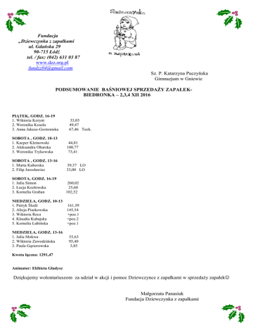 Fundacja „Dziewczynka z zapałkami ul. Gdańska 29 90-715 Łódź tel. / fax: (042) 631 03 87 www.dzz.org.pl [email protected] Sz. P. Katarzyna Puczyńska Gimnazjum w Gniewie PODSUMOWANIE BAŚNIOWEJ SPRZEDAŻY ZAPAŁEKBIEDRONKA – 2,3,4 XII 2016 PIĄTEK, GODZ. 16-19 1. Wiktoria Korynt 2. Weronika Kosela 3. Anna Jakusz-Gostomska 33,03 49,47 67,46 Tech. SOBOTA , GODZ. 10-13 1. Kacper Kleinowski 2. Aleksandra Obarska 3. Weronika Trykowska 44,81 100,77 73,41 SOBOTA , GODZ. 13-16 1. Marta Kuberska 2. Filip Jarosławiec 39,37 LO 33,00 LO SOBOTA, GODZ. 16-19 1. Julia Simon 2. Łucja Kozłowska 3. Kornelia Graban 260,02 25,60 102,52 NIEDZIELA, GODZ. 10-13 1. Patryk Śledź 2. Alicja Piaskowska 3. Wiktoria Reca 4. Klaudia Kubajska 5. Kornelia Lubińska 161,59 145,54 +poz.1 +poz.2 +poz.1 NIEDZIELA, GODZ. 13-16 1. Julia Mokwa 2. Wiktoria Zawodzińska 3. Paula Gąsiorowska 55,63 95,40 3,85 Kwota łączna: 1291,47 Animator: Elżbieta Gładysz Dziękujemy wolontariuszom za udział w akcji i pomoc Dziewczynce z zapałkami w sprzedaży zapałek Małgorzata Panasiuk Fundacja Dziewczynka z zapałkami