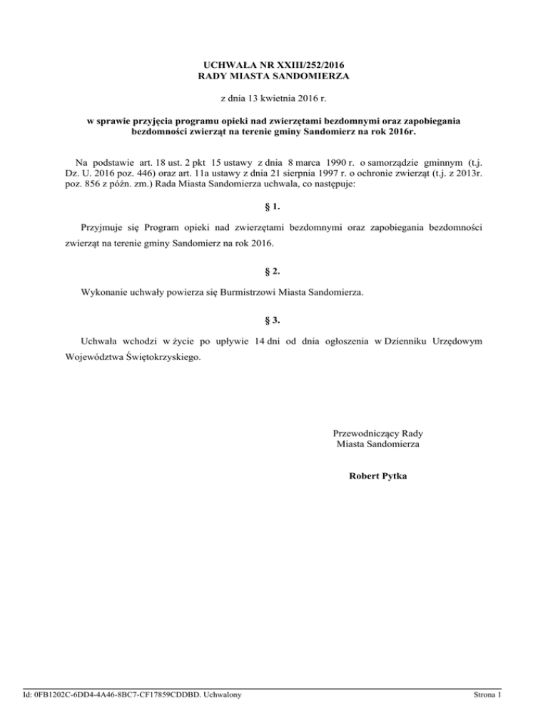 UCHWAŁA NR XXIII/252/2016 RADY MIASTA SANDOMIERZA z dnia 13 kwietnia 2016 r. w sprawie przyjęcia programu opieki nad zwierzętami bezdomnymi oraz zapobiegania bezdomności zwierząt na terenie gminy Sandomierz na rok 2016r. Na podstawie art. 18 ust. 2 pkt 15 ustawy z dnia 8 marca 1990 r. o samorządzie gminnym (t.j. Dz. U. 2016 poz. 446) oraz art. 11a ustawy z dnia 21 sierpnia 1997 r. o ochronie zwierząt (t.j. z 2013r. poz. 856 z późn. zm.) Rada Miasta Sandomierza uchwala, co następuje: § 1. Przyjmuje się Program opieki nad zwierzętami bezdomnymi oraz zapobiegania bezdomności zwierząt na terenie gminy Sandomierz na rok 2016. § 2. Wykonanie uchwały powierza się Burmistrzowi Miasta Sandomierza. § 3. Uchwała wchodzi w życie po upływie 14 dni od dnia ogłoszenia w Dzienniku Urzędowym Województwa Świętokrzyskiego. Przewodniczący Rady Miasta Sandomierza Robert Pytka Id: 0FB1202C-6DD4-4A46-8BC7-CF17859CDDBD. Uchwalony Strona 1 Załącznik do Uchwały Nr XXIII/252/2016 Rady Miasta Sandomierza z dnia 13 kwietnia 2016 r. Program opieki nad zwierzętami bezdomnymi oraz zapobiegania bezdomności zwierząt na terenie gminy Sandomierz na rok 2016. Rozdział I Postanowienia ogólne § 1. Program opieki nad zwierzętami bezdomnymi oraz zapobiegania bezdomności zwierząt na terenie miasta Sandomierza, zwany dalej Programem dotyczy zwierząt bezdomnych, o jakich mowa w art. 4 pkt 16 ustawy z dn. 21 sierpnia 1997 o ochronie zwierząt (Dz. U. z 2013 poz. 856 z późn. zm.), a w szczególności psów, kotów i zwierząt gospodarskich oraz kotów wolnożyjących, przebywających w granicach administracyjnych miasta Sandomierza. § 2. Celem Programu jest zapewnienie opieki bezdomnym zwierzętom oraz zapobieganie bezdomności zwierząt na terenie miasta Sandomierza. Rozdział II Zadania Programu § 3. Program obejmuje realizację następujących zadań: a) Odławianie bezdomnych zwierząt z terenu Miasta Sandomierza b) Zapewnienie bezdomnym zwierzętom terenu miasta Sandomierza miejsca w schronisku, prowadzonym przez firmę: „BAROS” Maciej Glijer, ul. Berezów 76 D, 26-130 Suchedniów pod adresem: ul. Berezów 85a, 26-130 Suchedniów, zwane w dalszej części Programu Schroniskiem c) Poszukiwanie właścicieli dla bezdomnych zwierząt z terenu miasta Sandomierza d) Sprawowanie opieki nad wolno żyjącymi kotami, w tym ich dokarmianie e) Obligatoryjną sterylizację lub kastrację zwierząt przebywających w Schronisku f) Usypianie ślepych miotów g) Wskazanie gospodarstwa rolnego w celu zapewnienia miejsca dla zwierząt gospodarskich h) Zapewnienie całodobowej opieki weterynaryjnej w przypadkach zdarzeń drogowych z udziałem zwierząt Rozdział III Wykonawcy Programu Id: 0FB1202C-6DD4-4A46-8BC7-CF17859CDDBD. Uchwalony Strona 1 § 4. Realizację zadań objętych Programem prowadzą: a) Gmina Miejska Sandomierz, zwana w dalszej części Gminą, poprzez Wydział Nadzoru Komunalnego Urzędu Miejskiego w Sandomierzu oraz Straż Miejską w Sandomierzu b) Sandomierskie Stowarzyszenie Przyjaciół Zwierząt c) „BAROS” Maciej Glijer, ul. Berezów 76 D, 26-130 Suchedniów, d) Przychodnia Weterynaryjna „Animals” s.c., ul. Ożarowska 13a, 27-600 Sandomierz, zwanej w dalszej części Programu Przychodnią Weterynaryjną e) Zespół Szkół Centrum Kształcenia Rolniczego im. Ziemi Sandomierskiej ul. Mokoszyńska 1, 27-600 Sandomierz, zwany dalej gospodarstwem rolnym f) Policja Rozdział IV Zapewnienie bezdomnym zwierzętom miejsca w schronisku dla zwierząt oraz wskazanie gospodarstwa rolnego w celu zapewnienia miejsca zwierzętom gospodarskim § 5. Odławianie bezdomnych zwierząt prowadzone jest przez podmiot prowadzący Schronisko. § 6. Odławianie zwierząt bezdomnych na terenie miasta Sandomierza jest działaniem o charakterze stałym i podejmowane jest na podstawie zgłoszeń interwencyjnych do Straży Miejskiej. § 7. Odłowione zwierzęta domowe z terenu miasta Sandomierza, co do których nie ma możliwości jednoznacznego ustaleniach właściciela lub innej osoby, pod opieką której trwale dotąd pozostawały są przewożone do Schroniska. § 8. Bezdomne zwierzęta gospodarskie podlegają przewiezieniu do Zespołu Szkół Centrum Kształcenia Rolniczego im. Ziemi Sandomierskiej w Sandomierzu, ul. Mokoszyńska 1. § 9. Zwierzęta przyjmowane do Schroniska poddawane są kwarantannie oraz zabiegom odrobaczania, obligatoryjnej sterylizacji/kastracji, czipowaniu, kompleksowym szczepieniom oraz koniecznemu leczeniu. § 10. Zapewnienie opieki odłowionym zwierzętom w schronisku do czasu przekazania do adopcji lub koniecznej eutanazji lub naturalnego zakończenia życia zwierzęcia obejmuje zabezpieczenie warunków właściwych do przetrzymywania zwierząt, opiekę weterynaryjną, oraz zapewnienie pożywienia. § 11. W przypadku ustalenia właściciela zwierzęcia bezdomnego, które zostało umieszczone w schronisku, gospodarstwie rolnym lub udzielono pomocy weterynaryjnej jako bezdomnemu, właściciel obowiązany jest zwrócić Gminie poniesione koszty związane z odłowieniem, pobytem i ewentualną opieką weterynaryjną, zgodnie z umowami zawartymi przez Gminę Sandomierz z tymi podmiotami. Rozdział V Poszukiwanie właścicieli dla bezdomnych zwierząt Id: 0FB1202C-6DD4-4A46-8BC7-CF17859CDDBD. Uchwalony Strona 2 § 12. Poszukiwanie właścicieli dla bezdomnych zwierząt z terenu miasta Sandomierza jest realizowane przez podmiot prowadzący Schronisko oraz Sandomierskie Stowarzyszenie Przyjaciół Zwierząt m.in. poprzez umieszczanie na stronach internetowych Schroniska oraz Sandomierskiego Stowarzyszenia Przyjaciół Zwierząt aktualnych informacji dot. zwierząt przeznaczonych do adopcji. Rozdział VI Opieka nad wolno żyjącymi kotami, w tym ich dokarmianie § 13. Sprawowanie opieki nad wolno żyjącymi kotami jest realizowane przy współpracy Gminy z Przychodnią Weterynaryjną oraz Sandomierskim Stowarzyszeniem Przyjaciół Zwierząt i obejmuje: a) Zakup karmy i zapewnieni