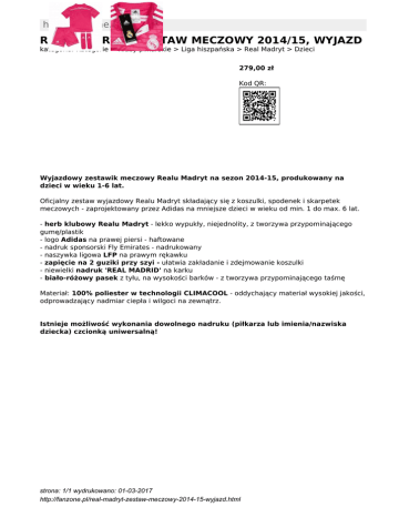 http://fanzone.pl REAL MADRYT - ZESTAW MECZOWY 2014/15, WYJAZD > Kluby piłkarskie > Liga hiszpańska > Real Madryt > Dzieci kategoria: Kategorie 279,00 zł Kod QR: Wyjazdowy zestawik meczowy Realu Madryt na sezon 2014-15, produkowany na dzieci w wieku 1-6 lat. Oficjalny zestaw wyjazdowy Realu Madryt składający się z koszulki, spodenek i skarpetek meczowych - zaprojektowany przez Adidas na mniejsze dzieci w wieku od min. 1 do max. 6 lat. - herb klubowy Realu Madryt - lekko wypukły, niejednolity, z tworzywa przypominającego gumę/plastik - logo Adidas na prawej piersi - haftowane - nadruk sponsorski Fly Emirates - nadrukowany - naszywka ligowa LFP na prawym rękawku - zapięcie na 2 guziki przy szyi - ułatwia zakładanie i zdejmowanie koszulki - niewielki nadruk 'REAL MADRID' na karku - biało-różowy pasek z tyłu, na wysokości barków - z tworzywa przypominającego taśmę Materiał: 100% poliester w technologii CLIMACOOL - oddychający materiał wysokiej jakości, odprowadzający nadmiar ciepła i wilgoci na zewnątrz. Istnieje możliwość wykonania dowolnego nadruku (piłkarza lub imienia/nazwiska dziecka) czcionką uniwersalną! strona: 1/1 wydrukowano: 01-03-2017 http://fanzone.pl/real-madryt-zestaw-meczowy-2014-15-wyjazd.html