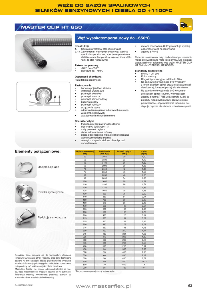 WĘŻE DO GAZÓW SPALINOWYCH SILNIKÓW BENZYNOWYCH I DIESLA DO +1100OC MASTER CLIP HT 650 Wąż wysokotemperaturowy do +6500C Konstrukcja 1. Spirala zewnętrzna: stal ocynkowana 2.- 3. Zewnętrzna i wewnętrzna warstwa: tkanina wysokotemperaturowa, specjalnie powlekana stabilizatorami temperatury, wzmocniona włóknami ze stali nierdzewnej Zakres temperatury • -200C do +6500C • chwilowo do +7500C Odporność chemiczna Patrz tabela odporności Zastosowanie • budowa pojazdów i silników • instalacje wyciągowe • przemysł okrętowy • przemysł lotniczy • przemysł samochodowy • budowa pieców • przemysł hutniczy • urządzenia ssące • odprowadzanie gazów odlotowych ze stanowisk prób silnikowych • zastosowania niskociśnieniowe • • metoda mocowania CLIP gwarantuje wysoką odporność węża na rozerwanie zgodny z RoHS Podczas stosowania przy podwyższonym ciśnieniu mogą być wydzielane małe ilości dymu. Dla instalacji gazoszczelnych zalecamy typy węży: MASTER-CLIP HT 500 lub HT-PRESSURE HOSES. Standardy produkcyjne • DN 50 – DN 900 • Kolor: srebrny • Długości produkcyjne: od 3m do 10m • Na zamówienie wąż może być wykonany z innym skokiem spirali oraz ze spiralą ze stali nierdzewnej, kwasoodpornej lub aluminium • Na zamówienie wąż może być wykonany ze skokiem spirali <30mm, wówczas jest zgodny z normą TRBS 2153 (strefa 1, 21) do przesyłu niepalnych pyłów i gazów o niskiej przewodności, odprowadzenie ładunków następuje poprzez obustronne uziemienie spirali Charakterystyka • trudnopalny bez zawartości silikonu • elastyczny, ściśliwość 1:3 • mały promień zagięcia • dobra odporność na próżnię • dobra odporność na wibracje dzięki dodatkowemu wzmocnieniu tkaniny • zewnętrzna spirala stalowa chroni przed uszkodzeniem Elementy połączeniowe: Obejma Clip Grip Prostka symetryczna Redukcja symetryczna Powyższe dane odnoszą się do temperatury otoczenia i medium wynoszącej 200C. Produkty oraz dane techniczne zawarte w tym katalogu zostały przedstawione wyłącznie w celach informacyjnych, mogą ulec zmianie bez uprzedzenia i nie powinny być traktowane jako oferta handlowa. Masterflex Polska nie ponosi odpowiedzialności za błędy, bądź niedokładności mogące pojawić się w publikacji. Tolerancja średnicy wewnętrznej przewodu stanowi od +1mm do +3mm w zależności od średnicy. Fot. MASTERFLEX SE DN (średnica wewnętrzna) [mm] 50 55 60 65 70 75 80 90 100 110 120 125 130 140 150 160 170 175 180 200 215 225 250 275 300 315 325 350 375 400 450 500 550 600 700 800 900 Podciśnienie [mm H2O] 3950 3500 3180 2990 2640 2550 2280 2090 1680 1390 1180 1050 990 880 760 670 590 560 520 420 380 350 290 230 190 180 170 150 130 110 90 70 60 50 40 30 25 Promień zagięcia [mm*] 30 33 36 39 42 45 48 54 60 66 72 75 78 84 90 96 102 105 108 120 151 158 175 193 210 221 228 245 263 280 360 400 440 480 560 640 720 Ciężar [kg/m] 1,10 1,19 1,29 1,38 1,47 1,57 1,66 1,85 1,57 1,71 1,85 1,93 2,00 2,14 2,29 2,43 2,57 2,65 2,72 3,01 3,22 3,36 3,72 4,08 4,44 4,66 4,80 5,16 5,55 5,91 6,63 7,35 8,07 8,79 10,23 11,67 13,11 * Dotyczy wewnętrznej strony kolana węża. www.masterflex.pl 63