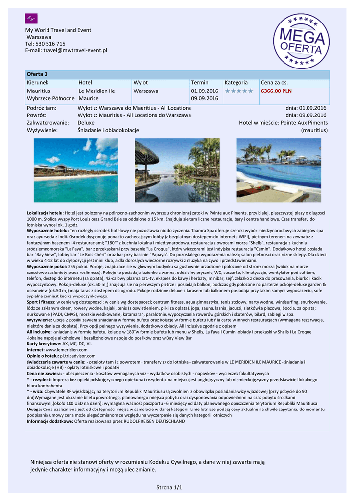 My World Travel and Event Warszawa Tel: 530 516 715 E-mail: [email protected] Oferta 1 Kierunek Hotel Mauritius Le Meridien Ile Wybrzeże Północne Maurice Podróż tam: Powrót: Zakwaterowanie: Wyżywienie: Wylot Warszawa Wylot z: Warszawa do Mauritius - All Locations Wylot z: Mauritius - All Locations do Warszawa Deluxe Śniadanie i obiadokolacje Termin 01.09.2016 09.09.2016 Kategoria Cena za os. 6366.00 PLN dnia: 01.09.2016 dnia: 09.09.2016 Hotel w mieście: Pointe Aux Piments (mauritius) Lokalizacja hotelu: Hotel jest polozony na pólnocno-zachodnim wybrzezu chronionej zatoki w Pointe aux Piments, przy bialej, piaszczystej plazy o dlugosci 1000 m. Stolica wyspy Port Louis oraz Grand Baie sa oddalone o 15 km. Znajduja sie tam liczne restauracje, bary i centra handlowe. Czas transferu do lotniska wynosi ok. 1 godz. Wyposazenie hotelu: Ten rozlegly osrodek hotelowy nie pozostawia nic do zyczenia. Taamra Spa oferuje szeroki wybór miedzynarodowych zabiegów spa oraz ayurveda z Indii. Osrodek dysponuje ponadto zachecajacym lobby (z bezplatnym dostepem do internetu WIFI), pieknym terenem na zewnatrz z fantazyjnym basenem i 4 restauracjami; "180°" z kuchnia lokalna i miedzynarodowa, restauracja z owocami morza "Shells", restauracja z kuchnia sródziemnomorska "La Faya", bar z przekaskami przy basenie "La Croque", który wieczorami jest indyjska restauracja "Cumin". Dodatkowo hotel posiada bar "Bay View", lobby bar "Le Bois Chéri" oraz bar przy basenie "Papaya". Do pozostalego wyposazenia naleza; salon pieknosci oraz rózne sklepy. Dla dzieci w wieku 4-12 lat do dyspozycji jest mini klub, a dla doroslych wieczorne rozrywki z muzyka na zywo i przedstawieniami. Wyposazenie pokoi: 265 pokoi. Pokoje, znajdujace sie w glównym budynku sa gustownie urzadzone i polozone od strony morza (widok na morze czesciowo zasloniety przez roslinnosc). Pokoje te posiadaja lazienke z wanna, oddzielny prysznic, WC, suszarke, klimatyzacje, wentylator pod sufitem, telefon, dostep do internetu (za oplata), 42-calowy plazma sat.-tv, ekspres do kawy i herbaty, minibar, sejf, zelazko z deska do prasowania, biurko i kacik wypoczynkowy. Pokoje-deluxe (ok. 50 m˛) znajduja sie na pierwszym pietrze i posiadaja balkon, podczas gdy polozone na parterze pokoje-deluxe garden & oceanview (ok.50 m˛) maja taras z dostepem do ogrodu. Pokoje rodzinne deluxe z tarasem lub balkonem posiadaja przy takim samym wyposazeniu, sofe sypialna zamiast kacika wypoczynkowego. Sport i fitness: w cenie wg dostepnosci; w cenie wg dostepnosci; centrum fitness, aqua gimnastyka, tenis stolowy, narty wodne, windsurfing, snurkowanie, lódz ze szklanym dnem, rowery wodne, kajaki, tenis (z oswietleniem, pilki za oplata), joga, sauna, laznia, jacuzzi, siatkówka plazowa, boccia. za oplata; nurkowanie (PADI, CMAS), morskie wedkowanie, katamaran, paralotnie, wypozyczania rowerów górskich i skuterów, bilard, zabiegi w spa. Wyzywienie: Opcja 2 posilki zawiera sniadania w formie bufetu oraz kolacje w formie bufetu lub ŕ la carte w innych restauracjach (wymagana rezerwacja, niektóre dania za doplata). Przy opcji pelnego wyzywienia, dodatkowo obiady. All inclusive zgodnie z opisem. All inclusive: -sniadanie w formie bufetu, kolacje w 180°w formie bufetu lub menu w Shells, La Faya i Cumin -obiady i przekaski w Shells i La Croque -lokalne napoje alkoholowe i bezalkoholowe napoje do posilków oraz w Bay View Bar Karty kredytowe: AX, MC, DC, VI. Internet: www.lemeridien.com Opinie o hotelu: pl.tripadvisor.com świadczenia zawarte w cenie: - przeloty tam i z powrotem - transfery z/ do lotniska - zakwaterowanie w LE MERIDIEN ILE MAURICE - śniadania i obiadokolacje (HB) - opłaty lotniskowe i podatki Cena nie zawiera: - ubezpieczenia - kosztów wymaganych wiz - wydatków osobistych - napiwków - wycieczek fakultatywnych * - rezydent: Impreza bez opieki polskojęzycznego opiekuna i rezydenta, na miejscu jest anglojęzyczny lub niemieckojęzyczny przedstawiciel lokalnego biura kontrahenta. * - wiza: Obywatele RP wjeżdżający na terytorium Republiki Mauritiusu są zwolnieni z obowiązku posiadania wizy wjazdowej (przy pobycie do 90 dni)Wymagane jest okazanie biletu powrotnego, planowanego miejsca pobytu oraz dysponowania odpowiednimi na czas pobytu środkami finansowymi,(około 100 USD na dzień); wymagana ważność paszportu - 6 miesięcy od daty planowanego opuszczenia terytorium Republiki Mauritiusa Uwaga: Cena uzależniona jest od dostępności miejsc w samolocie w danej kategorii. Linie lotnicze podają ceny aktualne na chwile zapytania, do momentu podpisania umowy cena może ulegać zmianom ze względu na wyczerpanie się danych kategorii lotniczych Informacje dodatkowe: Oferta realizowana przez RUDOLF REISEN DEUTSCHLAND Niniejsza oferta nie stanowi oferty w rozumieniu Kodeksu Cywilnego, a dane w niej zawarte mają jedynie charakter informacyjny i mogą ulec zmianie. Strona 1/1 Powered by TCPDF (www.tcpdf.org)