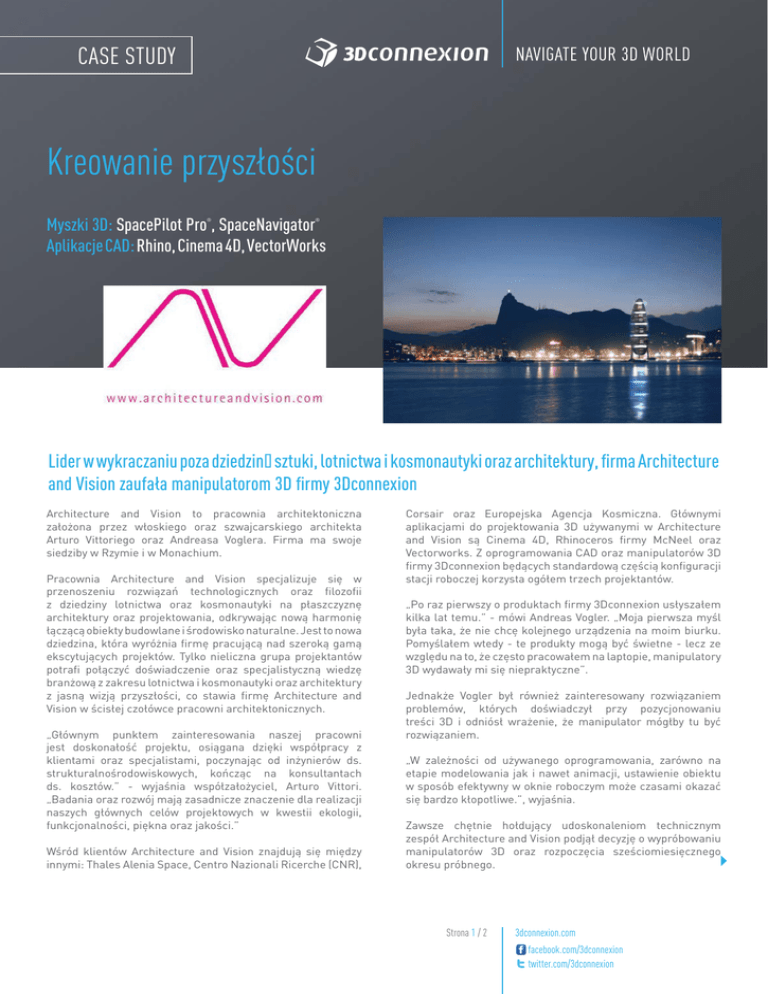 CASE STUDY Kreowanie przyszłości Myszki 3D: SpacePilot Pro , SpaceNavigator Aplikacje CAD: Rhino, Cinema 4D, VectorWorks ® ® Lider w wykraczaniu poza dziedzinę sztuki, lotnictwa i kosmonautyki oraz architektury, firma Architecture and Vision zaufała manipulatorom 3D firmy 3Dconnexion Architecture and Vision to pracownia architektoniczna założona przez włoskiego oraz szwajcarskiego architekta Arturo Vittoriego oraz Andreasa Voglera. Firma ma swoje siedziby w Rzymie i w Monachium. Pracownia Architecture and Vision specjalizuje się w przenoszeniu rozwiązań technologicznych oraz filozofii z dziedziny lotnictwa oraz kosmonautyki na płaszczyznę architektury oraz projektowania, odkrywając nową harmonię łączącą obiekty budowlane i środowisko naturalne. Jest to nowa dziedzina, która wyróżnia firmę pracującą nad szeroką gamą ekscytujących projektów. Tylko nieliczna grupa projektantów potrafi połączyć doświadczenie oraz specjalistyczną wiedzę branżową z zakresu lotnictwa i kosmonautyki oraz architektury z jasną wizją przyszłości, co stawia firmę Architecture and Vision w ścisłej czołówce pracowni architektonicznych. „Głównym punktem zainteresowania naszej pracowni jest doskonałość projektu, osiągana dzięki współpracy z klientami oraz specjalistami, poczynając od inżynierów ds. strukturalnośrodowiskowych, kończąc na konsultantach ds. kosztów.” - wyjaśnia współzałożyciel, Arturo Vittori. „Badania oraz rozwój mają zasadnicze znaczenie dla realizacji naszych głównych celów projektowych w kwestii ekologii, funkcjonalności, piękna oraz jakości.” Wśród klientów Architecture and Vision znajdują się między innymi: Thales Alenia Space, Centro Nazionali Ricerche (CNR), Corsair oraz Europejska Agencja Kosmiczna. Głównymi aplikacjami do projektowania 3D używanymi w Architecture and Vision są Cinema 4D, Rhinoceros firmy McNeel oraz Vectorworks. Z oprogramowania CAD oraz manipulatorów 3D firmy 3Dconnexion będących standardową częścią konfiguracji stacji roboczej korzysta ogółem trzech projektantów. „Po raz pierwszy o produktach firmy 3Dconnexion usłyszałem kilka lat temu.” - mówi Andreas Vogler. „Moja pierwsza myśl była taka, że nie chcę kolejnego urządzenia na moim biurku. Pomyślałem wtedy - te produkty mogą być świetne - lecz ze względu na to, że często pracowałem na laptopie, manipulatory 3D wydawały mi się niepraktyczne”. Jednakże Vogler był również zainteresowany rozwiązaniem problemów, których doświadczył przy pozycjonowaniu treści 3D i odniósł wrażenie, że manipulator mógłby tu być rozwiązaniem. „W zależności od używanego oprogramowania, zarówno na etapie modelowania jak i nawet animacji, ustawienie obiektu w sposób efektywny w oknie roboczym może czasami okazać się bardzo kłopotliwe.”, wyjaśnia. Zawsze chętnie hołdujący udoskonaleniom technicznym zespół Architecture and Vision podjął decyzję o wypróbowaniu manipulatorów 3D oraz rozpoczęcia sześciomiesięcznego okresu próbnego. Strona 1 / 2 3dconnexion.com facebook.com/3dconnexion twitter.com/3dconnexion CASE STUDY Według Arturo Vittoriego, osiągnięcie biegłości w posługiwaniu się manipulatorami 3D zajęło zespołowi projektowemu zaledwie kilka dni: „Po tygodniu ciągłego użytkowania oraz eksperymentowania, byliśmy pewni ich wartości i wiedzieliśmy, że zaopatrzymy się w te urządzenia. Po miesiącu ciągłego użytkowania, praca bez manipulatora 3D okazała się nieco kłopotliwa, gdyż ręka mimowolnie go szukała podczas fazy modelowania.” Obecnie w firmie wykorzystywana jest kombinacja manipulatorów 3D z serii SpacePilot Pro oraz SpaceNavigator firmy 3Dconnexion. „W końcu przekonała nas oszczędność czasu, którą gwarantuje użytkowanie manipulatora 3D. Kiedy jedna z twoich dłoni spoczywa na tym niezwykłym urządzeniu, nawet wówczas, gdy nawigacja 3D nie jest wymagana, tok pracy zostaje znacznie przyspieszony dzięki pozostałym funkcjom, takim jak klawisze skrótów używane do wywoływania poleceń oprogramowania lub po prostu do nawigowania z jednego widoku do drugiego.” - wyjaśnia Arturo Vittori. „Próby uzyskania niektórych widoków bez użycia manipulatora 3D mogą okazać się niemal niemożliwe lub co najmniej niezwykle czasochłonne.” Arturo Vittori przytacza wiele innych zalet i korzyści wynikających z użytkowania manipulatora 3D, obejmujących zoptymalizowany tok prac oraz udogodnienia ergonomiczne. „Dzięki manipulatorowi 3D SpacePilot Pro oraz przyciskom skrótów, w które został wyposażony, uzyskano zauważalny przyrost produktywności wraz z opanowaniem przez operatorów CAD położenia tychże klawiszy skrótów”. Najnowszym projektem zrealizowanym przy użyciu manipulatora 3D był AtlasCoelestisZeroG; ruchoma rzeźba przestrzenna, która poleciała na pokładzie promu kosmicznego Endeavor na Międzynarodową Stację Kosmiczną (MSK) w ramach ostatniego lotu, w maju 2011 roku. Przy projekcie wykorzystywano trzy manipulatory SpaceNavigator oraz jeden manipulator SpacePilot Pro. Vittori podsumowuje: „Manipulatory 3D oferują najnowocześniejszą technologię dostosowaną do naszego podejścia. Zapewniają również poprawę komfortu oraz łatwiejszy dostęp do kluczowych funkcji używanych przez nas programów, co owocuje możliwością poświęcenia znacznie dłuższego czasu na projektowanie oraz odpowiednio niższymi kosztami, gdyż sam proces projektowania został uproszczony i usprawniony.” Strona 2 / 2 3dconnexion.com facebook.com/3dconnexion twitter.com/3dconnexion
