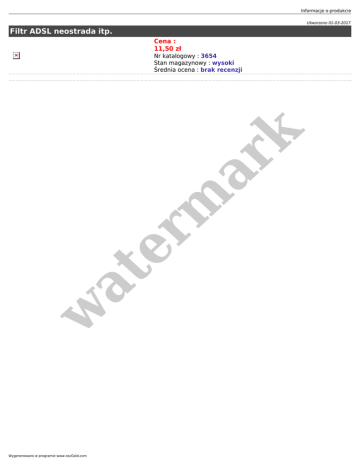 Informacje o produkcie Utworzono 01-03-2017 Filtr ADSL neostrada itp. Cena : 11,50 zł w at er m ar k Nr katalogowy : 3654 Stan magazynowy : wysoki Średnia ocena : brak recenzji Wygenerowano w programie www.oscGold.com