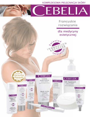 KOMPLEKSOWA PIELĘGNACJA SKÓRY Francuskie rozwiązania dla medycyny estetycznej KOMPLEKSOWA PIELĘGNACJA SKÓRY Naprawia MULTI-ACTIVE CREAM L.C.E. BALM BALSAM L.C.E. Przed i pozabiegowy krem naprawczy. Przeciwdziała krwiakom i opuchliźnie. Przyspiesza gojenie (opatentowana formuła). Po zabiegach laserowych (szczególnie polecany przy waskularnych i na przebarwienia) Przed i po iniekcjach (typu kwas hialuronowy, mezoterapia itp.) Na blizny pooperacyjne (m.in. piersi, face lift, rhinoplastyka nosa, blefaroplastyka) 15 ml KREM O SZEROKIM SPEKTRUM DZIAŁANIA DŁONIE I PAZNOKCIE Działa leczniczo i naprawczo, dając ukojenie suchej i popękanej skórze dłoni. Skóra odzyskuje gładkość i sprężystość. Odżywia rozwarstwione, łamliwe paznokcie, osłabione szczególnie po ciąży lub zniszczone po zabiegach manicure. Wzmocnienie bariery ochronnej skóry. Skóra jest ukojona i nawilżona, staje się gładka, miękka i sprężysta. 75 ml Łagodzi SOOTHING MILK MLECZKO ŁAGODZĄCE CIAŁO I NOGI Przeciw wysuszeniu, swędzeniu i zaczerwienieniu. Mleczko łagodzące i odżywcze. Koi uczucie dyskomfortu przegrzania, szczypania i swędzenia. Stosowane po zabiegach chirurgicznych, takich jak liposukcja i operacja piersi oraz depilacja laserowa. 290 ml COMFORT CREAM KOMFORTOWY KREM TWARZ I SZYJA Zapewnia komfort osłabionej skórze. Bogata kremowa formuła penetruje szybko nadając pozytywne odczucie nawilżenia, nie pozostawiając efektu błyszczenia. Przeznaczony do stosowania po zabiegach mechanicznie oddziałujących na skórę, np.: peeling, laser itp. Przeciwdziała wysuszeniu skóry w okresie menopauzy. 40 ml EXTREME CARE EKSTREMALNA PIELĘGNACJA Wygładza, odświeża, nawilża i naprawia. Przygotowuje i regeneruje skórę w przypadku zabiegów typu laser, fala radiowa, peeling, mikrodermabrazja. Polecany przy: rumieniu, rozszerzonych naczynkach, trądziku różowatym, łuszczycy, łojotokowym zapaleniu skóry i egzemie, nadwrażliwej i reaktywnej skórze, radioterapii, fototerapii dynamicznej, oparzeniach termicznych. 75 ml KOMPLEKSOWA PIELĘGNACJA SKÓRY Przedłuża efekt REINFORCED DEPIGMENTING INTENSIVE ANTI-AGING WZMOCNIONY PROCES DEPIGMENTACJI TWARZ I DŁONIE INTENSYWNY KREM PRZECIWSTARZENIOWY TWARZ I SZYJA Skóra wrażliwa. Zwalcza przebarwienia i przeciwdziała ich powstawaniu. Przywraca koloryt skóry. Wpływa na proces tworzenia melaniny i redukuje nieprawidłowości związane z pigmentacją. Zawiera aktywne składniki, w tym opatentowany - Pekaline. Wskazania m.in. melasma, "plamy wątrobowe", znamiona barwnikowe itp. Zalecany przed i po zabiegach pilingujących, po laserach i zabiegach z użyciem azotu. 30 ml Łagodzi i ujędrnia. Do stosowania po zabiegach tj. peeling czy laseroterapia. Zwiększa i podtrzymuje efekt zabiegów estetycznych. Mikrostruktura skóry zostaje odbudowana, skóra staje się gładsza, bardziej jędrna i gęsta. 30 ml Oczyszcza CLEANSING MILK SOFTENING SOAP MLECZKO OCZYSZCZAJĄCE TWARZ I SZYJA MYDŁO ZMIĘKCZAJĄCE TWARZ I CIAŁO Bardzo kremowe mydło do twarzy i ciała. Zapewnia komfort osłabionej skórze. Wzbogacone o masło shea oraz wyciąg ze słodkiego oleju migdałowego, oczyszcza skórę bez zachwiania jej naturalnego balansu. Doskonałe do codziennego oczyszczania twarzy i ciała, nawet skóry najbardziej wrażliwej, kobiet i mężczyzn. Idealne także po zabiegach medycyny estetycznej. 150 gr Mleczko do demakijażu twarzy i szyi, eliminuje zanieczyszczenia oraz ślady makijażu nawet okolic oczu, bez efektu wysuszania skóry. Skóra jest czysta, jasna i miękka, gotowa do aplikacji produktów pielęgnacyjnych. 150 ml L.C.E. REGARD MEDYCZNY KOREKTOR ZABIEG NA KONTUR OCZU Lecznicza formuła o podwójnym przeznaczeniu: koryguje worki pod oczami, podkrążenia i zmarszczki oraz kryje i tuszuje niedoskonałości. Oczy stają się natychmiast odmłodzone i ożywione, a objawy starzenia stopniowo zmniejszają się w miarę stosowania. Zawiera wygodny aplikator z pędzelkiem. 1,6 ml KOMPLEKSOWA PIELĘGNACJA SKÓRY EKSKLUZYWNE PATENTY Patent CNRS/CEBELIA Wynik pracy zespołu CNRS, pod kierownictem Patricii Rousselle, światowej sławy specjalistki w badaniach dotyczących lamininy 5 (LN5). Laboratoires d’Anjou przeprowadziło badania naukowe dotyczące właściwości adhezyjnych fragmentu peptydu LN-5. W rezultacie po raz pierwszy udało się zaprezentować oraz opatentować właściwości wyciągu z LN-5, pozwalające na zastąpienie jego natywnej formy, braku lub niedoboru specjalnym odpowiednikiem. Peptyd posiada zdolność osiągania szybkiej aktywności biologicznej, skutkiem czego jest wzmacnianie połączeń pomiędzy skórą i naskórkiem. Jest zatem w stanie stymulować proces regeneracji tkanki. Peptyd jest składnikiem L.C.E. BALM (w celu przyspieszenia regeneracji naskórka) oraz INTENSIVE ANTI-AGING CREAM (w celu wygładzenia i ujędrnienia skóry). 0% 1,25% 0,6% RYS. Właściwości adherencyjne fragmentu peptydu wyrażone w procentach. Patent INSERM/CEBELIA Badanie przeprowadzone przez Profesora ORTONNE i Doktora BALLOTTI (oddział INSERM). Pekaline, to opatentowany składnik, który działa na: • PKA, gdzie odpowiada za wytwarzanie tyrozynazy • pH melanosomów, przez co zakłóca ich działanie. Ten nowy regulator melanogenezy, hamuje indukowaną pigmentację: redukuje zawartość melaniny w komórkach odpowiedzialnych za pigmentację o 40% oraz sześciokrotnie w tych, które aktywowane są promieniami UV. Pekaline zmniejsza także istniejące przebarwienia o 50%. Pekaline : figure 1 5 4,5 4 3,5 3 2, 2 1,5 1 0,5 0 figure 2 1 0,8 0,6 0,4 0,2 Cont UV Pekaline UV +Pekaline Hamuje indukowane przebarwienia 0 Cont Pekaline Zmniejsza istniejące przebarwienie WWW.AESTHETICCONCEPT.PL Wyłączny Dystrybutor w Polsce: AESTHETIC CONCEPT | ul. Hanki Czaki 2/69 | 01-588 Warszawa | tel. +48 22 415 67 92 |