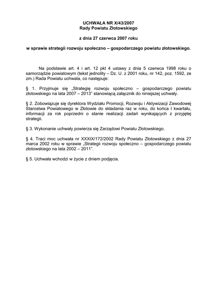 UCHWAŁA NR X/43/2007 Rady Powiatu Złotowskiego z dnia 27 czerwca 2007 roku w sprawie strategii rozwoju społeczno – gospodarczego powiatu złotowskiego. Na podstawie art. 4 i art. 12 pkt 4 ustawy z dnia 5 czerwca 1998 roku o samorządzie powiatowym (tekst jednolity – Dz. U. z 2001 roku, nr 142, poz. 1592, ze zm.) Rada Powiatu uchwala, co następuje: § 1. Przyjmuje się „Strategię rozwoju społeczno – gospodarczego powiatu złotowskiego na lata 2007 – 2013” stanowiącą załącznik do niniejszej uchwały. § 2. Zobowiązuje się dyrektora Wydziału Promocji, Rozwoju i Aktywizacji Zawodowej Starostwa Powiatowego w Złotowie do składania raz w roku, do końca I kwartału, informacji za rok poprzedni o stanie realizacji zadań wynikających z przyjętej strategii. § 3. Wykonanie uchwały powierza się Zarządowi Powiatu Złotowskiego. § 4. Traci moc uchwała nr XXXIX/172/2002 Rady Powiatu Złotowskiego z dnia 27 marca 2002 roku w sprawie „Strategii rozwoju społeczno – gospodarczego powiatu złotowskiego na lata 2002 – 2011”. § 5. Uchwała wchodzi w Ŝycie z dniem podjęcia. UZASADNIENIE do Uchwały nr X/43/2007 Rady Powiatu Złotowskiego z dnia 27 czerwca 2007 roku. Opracowana w roku 2002 „Strategia Rozwoju Powiatu Złotowskiego” przewidywała jej realizację w latach 2002 – 2011. Jednocześnie otrzymała status dokumentu otwartego, a tym samym dokumentu, który moŜe, a nawet powinien być modyfikowany. Nie powinien jednak odbiegać od realizacji najwaŜniejszego załoŜenia, jakie sam sobą niósł. Tym załoŜeniem jest bardzo szeroko rozumiany rozwój powiatu złotowskiego. Twórcy strategii są w pełni świadomi faktu, iŜ czynniki społeczne, ekonomiczne, a nawet naturalne ulegają ciągłym zmianom, w związku z czym naleŜy uaktualniać istniejącą juŜ Strategię. Modyfikacja Strategii nie jest opracowaniem w pełni nowym. Za dokonaniem modyfikacji przemawia potrzeba: − rozszerzenia struktury dokumentu, − doprowadzenia do spójności z unijną zasadą programowania, tj. dostosowania Strategii do siedmioletniego okresu programowania pomocy strukturalnej UE (przypomnijmy, Ŝe dotychczasowa Strategia opracowana była nie do 2013r., ale do 2011r.), − wprowadzenia dalszych, nowych zadań i projektów. Powiat Złotowski powstał w wyniku reformy administracyjnej kraju, jako jeden z kilkuset nowych podmiotów samorządu terytorialnego szczebla powiatowego. Obecny kształt powiatów, jego kompetencje i zadania, niezaleŜnie od ograniczonych kompetencji finansowych, powodują konieczność wypracowania zarówno trwałych kierunków jak i sposobów działań nowych struktur dla zapewnienia rozwoju powiatu oraz podniesienia jakości Ŝycia jego mieszkańców. Strategia Rozwoju Społeczno – Gospodarczego Powiatu Złotowskiego na lata 2007 – 2013 jest dokumentem planistycznym określającym misję, kierunki i cele jego rozwoju w róŜnych płaszczyznach Ŝycia naszej społeczności. W tym aspekcie jest zgodna z art. 9 ust. 4 ustawy nr 227 z dnia 6 grudnia 2006 r. „O zasadach prowadzenia polityki rozwoju”, który stanowi, Ŝe podstawą rozwoju jest Strategia. Działalność społeczno – gospodarczą podzielono na pięć obszarów: gospodarkę, przestrzeń, społeczność, ekologię i infrastrukturę. Dla kaŜdego celu wyznaczono cele niezbędne, bez których dany obszar nie ma moŜliwości dalszego rozwoju. Jednocześnie wskazano na cele pierwszorzędne, które powinny znacznie przyspieszyć rozwój w danym obszarze. Na podstawie tak zhierarchizowanych celów określono priorytety w poszczególnych obszarach Ŝycia społeczno – gospodarczego. Strategia określa kierunki działań na lata 2007 – 2013, a więc dla obecnej Rady Powiatu jak i dla następnych Rad. Zaznacza się, Ŝe zgodnie z zasadami finansowania przedsięwzięć współfinansowanych środkami unijnymi, a takie się przewiduje – zadania wynikające ze Strategii mogą być realizowane do 2015r. (zasada n+2). Integralną częścią, niejako zwieńczeniem Strategii, jest Plan Rozwoju Lokalnego przyjęty uchwałą Nr XLIV/219/2006 Rady Powiatu Złotowskiego z dn. 26.09.2006r. będący quasi programem operacyjnym, przy pomocy którego Strategia jest realizowana. ZałoŜenia Strategii opracowywanej w 2002r. były poddane konsultacji wielu osobom i instytucjom opiniotwórczym, a wynik ich pracy nad nową Strategią Rozwoju Społeczno –Gospodarczego zyskał szeroką akceptację społeczną. 2 STRATEGIA ROZWOJU SPOŁECZNOGOSPODARCZEGO POWIATU ZŁOTOWSKIEGO NA LATA 2007 – 2013 Złotów 2007r. 3 Spis treści Część I Wprowadzenie…………………………………………………………………… 6 Część II Aktualna sytuacja społeczno–gospodarcza na obszarze objętym wdraŜaniem Strategii społeczno–gospodarczej powiatu złotowskiego…………………… 1. Podstawowe informacje o powiecie złotowskim……………………… 2. Urząd bliŜej obywatela…………………………………………………… 3. Diagnoza stanu powiatu………………………………………………… 11 11 36 37 Część III Analiza SWOT…………………………………………………………………….. 40 MISJA………………………………………………………………………………. 43 Część IV Priorytety, cele i kierunki działania…………………………………………..… 1. Priorytety………………………………………………………………… 44 44 2. Cele i kierunki działania…………………………………………………… Przestrzeń……………………………………………………………. Infrastruktura………………………………………………………. Społeczność…………………………………………………………. Gospodarka…………………………………………………………... Ekologia…………………………………