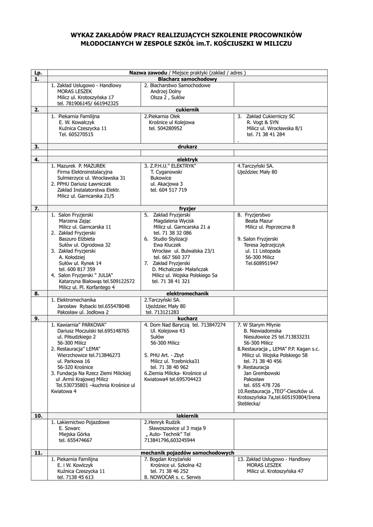WYKAZ ZAKŁADÓW PRACY REALIZUJĄCYCH SZKOLENIE PROCOWNIKÓW MŁODOCIANYCH W ZESPOLE SZKÓŁ im.T. KOŚCIUSZKI W MILICZU Lp. 1. 1. Zakład Usługowo - Handlowy MORAS LESZEK Milicz ul. Krotoszyńska 17 tel. 781906145/ 661942325 Nazwa zawodu / Miejsce praktyki (zakład / adres ) Blacharz samochodowy 2. Blacharstwo Samochodowe Andrzej Dolny Olsza 2 , Sułów 2. 1. Piekarnia Familijna E. W. Kowalczyk Kuźnica Czeszycka 11 Tel. 605270515 3. cukiernik 2.Piekarnia Olek Krośnice ul Kolejowa tel. 504280952 3. Zakład Cukierniczy SC R. Vogt & SYN Milicz ul. Wrocławska 8/1 tel. 71 38 41 284 . drukarz 4. 1. Mazurek P. MAZUREK Firma Elektroinstalacyjna Sulmierzyce ul. Wrocławska 31 2. PPHU Dariusz Ławniczak Zakład Instalatorstwa Elektr. Milicz ul. Garncarska 21/5 7. 1. Salon Fryzjerski Marzena Zając Milicz ul. Garncarska 11 2. Zakład Fryzjerski Baszuro Elżbieta Sułów ul. Ogrodowa 32 3. Zakład Fryzjerski A. Kołodziej Sułów ul. Rynek 14 tel. 600 817 359 4. Salon Fryzjerski " JULIA" Katarzyna Białowąs tel.509122572 Milicz ul. Pl. Korfantego 4 8. 1. Elektromechanika Jarosław Rybacki tel.655478048 Pakosław ul. Jodłowa 2 9. 1. Kawiarnia” PARKOWA” Dariusz Moczulski tel.695148765 ul. Piłsudzkiego 2 56-300 Milicz 2. Restauracja” LEMA” Wierzchowice tel.713846273 ul. Parkowa 16 56-320 Krośnice 3. Fundacja Na Rzecz Ziemi Milickiej ul .Armii Krajowej Milicz Tel.530735801 –kuchnia Krośnice ul Kwiatowa 4 10. 1. Lakiernictwo Pojazdowe E. Szwarc Miejska Górka tel. 655474667 11. 1. Piekarnia Familijna E. i W. Kowlczyk Kuźnica Czeszycka 11 tel. 7138 45 613 elektryk 3. Z.P.H.U." ELEKTRYK" T. Cyganowski Bukowice ul. Akacjowa 3 tel. 604 517 719 fryzjer 5. Zakład Fryzjerski Magdalena Wycisk Milicz ul. Garncarska 21 a tel. 71 38 32 086 6. Studio Stylizacji Ewa Kluczek Wrocław ul. Bulwalska 23/1 tel. 667 560 377 7. Zakład Fryzjerski D. Michalczak- Małańczak Milicz ul. Wojska Polskiego 5a tel. 71 38 41 321 elektromechanik 2.Tarczyński SA. Ujeździec Mały 80 tel. 713121283 kucharz 4. Dom Nad Baryczą tel. 713847274 Ul. Kolejowa 43 Sułów 56-300 Milicz 5. PHU Art. - Zbyt Milicz ul. Trzebnicka31 tel. 71 38 40 962 6.Ziemia Milicka- Krośnice ul Kwiatowa4 tel.695704423 4.Tarczyński SA. Ujeździec Mały 80 8. Fryzjerstwo Beata Mazur Milicz ul. Poprzeczna 8 9. Salon Fryzjerski Teresa Jędrzejczyk ul. 11 Listopada 56-300 Milicz Tel.608951947 7. W Starym Młynie B. Niewiadomska Niesułowice 25 tel.713833231 56-300 Milicz 8.Restauracja „ LEMA” P.P. Kagan s.c. Milicz ul. Wojska Polskiego 58 tel. 71 38 40 456 9 .Restauracja Jan Grembowski Pakosław tel. 655 478 726 10.Restauracja „TEO”-Cieszków ul. Krotoszyńska 7a,tel.605193804/Irena Steblecka/ lakiernik 2.Henryk Rudzik Sławoszowice ul 3 maja 9 „ Auto- Technik” Tel 713841796,603245944 mechanik pojazdów samochodowych 7. Bogdan Krzyżański 13. Zakład Usługowo - Handlowy Krośnice ul. Szkolna 42 MORAS LESZEK tel. 71 38 46 252 Milicz ul. Krotoszyńska 47 8. NOWOCAR s. c. Serwis 2. Mechanika Pojazdowa W. Śledzianowski Wszewilki 17 ,tel.606680476 tel. 781 906 145 4. PHU Art. - Zbyt Milicz ul. Trzebnicka31 tel. 71 38 40 962 5. SC " ISKRA " Przewozy Autobusowe Milicz ul. Poprzeczna tel. 71 38 40 306 Smok - Piskozub - Lisiak 12. Ogumienia 15. Mechanika Pojazdowa K. Arnold ,J. Nowacki Jacek Klejewski Milicz ul. Poprzeczna 8 Milicz ul. Akacjowa 20 9. „ Elektrotom” 16. Kruk - Transport Tomasz Kątnik Zduny ul. Kobylińska33 Milicz ul. Leśna5 17. Mechanika Pojazdowa tel. 508 211 63 Jan Kuźnia 10. Adam Cieślik Szymonki 22 Jutrosin Obsługa i Naprawa Pojazdów Milicz ul. Wojska Polskiego 21 tel.60561462 11. Firma Transportowo- Sprzętowa Grzyb Artur Oleśnica ul. Południowa 1 tel. 71 39 83 932 12. Zakład Mechaniczny G. Tomczyk Jeziora 9, Jutrosin tel. 655 473 954 mechanik operator pojazdów i maszyn rolniczych 1. AGRO – JET sp.zoo Włodzimierz Tarczyński Ujeździec Wielki 45 55- 100 Trzebnica 693550567 13. 1.” ITECOM” sp. z o.o. Marek Kaniewski Krotoszyn ul. Łąkowa 10 tel. 62 72 55 860 14. 1. Grzegorz Madliński Nowa Wieś tel. 71 39 87 352 / 607 657 903 15. 1. Usługi ogólnobudowlane Tyczyński Marek Milicz ul. Krzywa 1a tel. 503 089 711 2. KRYSBUD Sławomir Ugorek Milicz ul. Kopernika 29 a tel. 71 38 40 060 16. 1. Piekarnia Olek Wiesława Krośnice ul. Kolejowa 22 tel. 71 38 46 263 17. 1. Zakład Przetwórstwa Mięsnego Grzegorz Jankowski Krośnice ul. Szkolna 36 18. 1. Firma „KLK” Sławoszowice ul 3-go Maja 8A Tel.733268678 2. Brokelmann Budowa Maszyn i Urządzeń Milicz ul. Stawna 6 19. 1. Zakład Stolarski H. Wiatrak & Syn Cieszków ul. Rolnicza 3 tel. 71 38 34 961 2. Art . Furniture Jarosław Jadczyk Milicz ul. Brzozowa 1 3. Drew Box Kaczmarek tel. 71 38 30 486 4. MHM -Milicz ul. Wojska Polskiego monter elektronik 2. PHU” Jnfo-mach” Henryk Jezierski Milicz ul. Kasztanowa 5 3. „SOFTON” Dominik Tokarski ul. Ostrowskiego 13 63- 700 Krotoszyn 4.Tarczyński SA Ujeździec Mały 80 Tel. 713121283 monter instalacji i urządzeń sanitarnych 2. Władysław Skiba PPHU 3. Instalatorstwo Milicz Ul. Poziomkowa 1 Marian Matyla ul. Sienkiewicza 24 63-760 Zduny murarz-tynkarz 3. Mariusz Grochowski 5. Usługi Ogólno – Budowlane Zakład Ogólnobudowlany Tyczyński Marek Bukowice ul. Milicka 1 Sławoszowice ul. Krzywa 1a 4. Przedsiębiorstwo Produkcyjno56-300 Milicz Usługowo Budowlane KRYSBUD 6. FILAR Piotr Picher ul. Kopernika 29a ul. Wodociągowa 2 56-300 Milicz 56-300 Milicz piekarz 2. Przedsiębiorstwo Produkcyjno 3.Piekarnia” Familijna” Handlowe E. W. Kowalczyk Edward Rybka Gądkowice Kuźnica Czeszycka 11 56-300 Milicz 4.Piekarnia „Smak” Cieszków wędliniarz 2. Zakład Masarski3.Tarczyński SA. Marek Nowostawski Ujeździec Mały 80 Police 21 ,56-320 Krośnice tel.713121283 tel. 516023298 ślusarz 3. Zakład Ślusarski 5. PPU Dariusz Sobkowiak Henryk Baczkowski Sułów ul. Żmigrodzka 12 Sułów ul. Żmigrodzka 14a tel. 71 38 47 224 tel. 71 38 47 280 6. Tarczyński S. A. 4. PP" SOMET" Ujeździec Mały 80 T