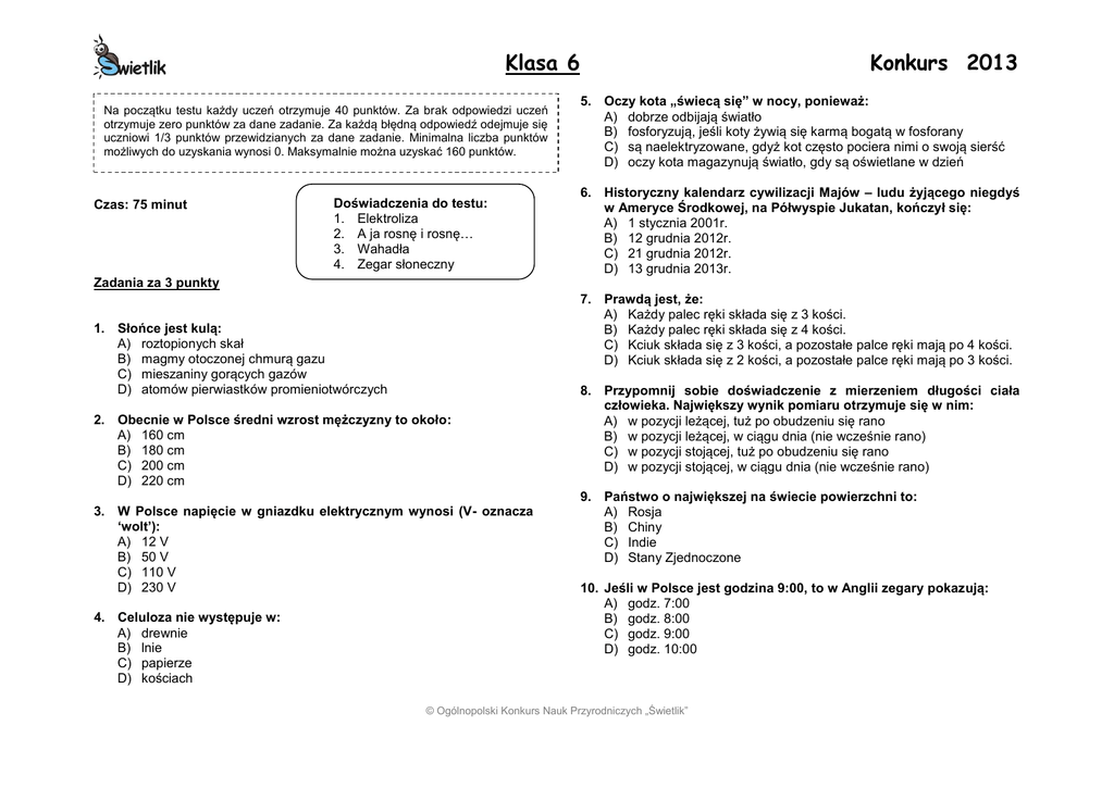 Klasa 6 Na początku testu każdy uczeń otrzymuje 40 punktów. Za brak odpowiedzi uczeń otrzymuje zero punktów za dane zadanie. Za każdą błędną odpowiedź odejmuje się uczniowi 1/3 punktów przewidzianych za dane zadanie. Minimalna liczba punktów możliwych do uzyskania wynosi 0. Maksymalnie można uzyskać 160 punktów. Czas: 75 minut Doświadczenia do testu: 1. Elektroliza 2. A ja rosnę i rosnę… 3. Wahadła 4. Zegar słoneczny Konkurs 2013 5. Oczy kota „świecą się” w nocy, ponieważ: A) dobrze odbijają światło B) fosforyzują, jeśli koty żywią się karmą bogatą w fosforany C) są naelektryzowane, gdyż kot często pociera nimi o swoją sierść D) oczy kota magazynują światło, gdy są oświetlane w dzień 6. Historyczny kalendarz cywilizacji Majów – ludu żyjącego niegdyś w Ameryce Środkowej, na Półwyspie Jukatan, kończył się: A) 1 stycznia 2001r. B) 12 grudnia 2012r. C) 21 grudnia 2012r. D) 13 grudnia 2013r. Zadania za 3 punkty 7. Prawdą jest, że: A) Każdy palec ręki składa się z 3 kości. B) Każdy palec ręki składa się z 4 kości. C) Kciuk składa się z 3 kości, a pozostałe palce ręki mają po 4 kości. D) Kciuk składa się z 2 kości, a pozostałe palce ręki mają po 3 kości. 1. Słońce jest kulą: A) roztopionych skał B) magmy otoczonej chmurą gazu C) mieszaniny gorących gazów D) atomów pierwiastków promieniotwórczych 2. Obecnie w Polsce średni wzrost mężczyzny to około: A) 160 cm B) 180 cm C) 200 cm D) 220 cm 3. W Polsce napięcie w gniazdku elektrycznym wynosi (V- oznacza ‘wolt’): A) 12 V B) 50 V C) 110 V D) 230 V 4. Celuloza nie występuje w: A) drewnie B) lnie C) papierze D) kościach 8. Przypomnij sobie doświadczenie z mierzeniem długości ciała człowieka. Największy wynik pomiaru otrzymuje się w nim: A) w pozycji leżącej, tuż po obudzeniu się rano B) w pozycji leżącej, w ciągu dnia (nie wcześnie rano) C) w pozycji stojącej, tuż po obudzeniu się rano D) w pozycji stojącej, w ciągu dnia (nie wcześnie rano) 9. Państwo o największej na świecie powierzchni to: A) Rosja B) Chiny C) Indie D) Stany Zjednoczone 10. Jeśli w Polsce jest godzina 9:00, to w Anglii zegary pokazują: A) godz. 7:00 B) godz. 8:00 C) godz. 9:00 D) godz. 10:00 © Ogólnopolski Konkurs Nauk Przyrodniczych „Świetlik” Klasa 6 Konkurs 2013 13. Na tej mapie Grenlandia znajduje się najbliżej litery: Zadania za 4 punkty 11. Nagroda Nobla to prestiżowa światowa nagroda przyznawana raz w roku w kilku dziedzinach. Wśród osób nagrodzonych w ciągu 112 lat było łącznie sześcioro Polaków. Maria Skłodowska-Curie (czytaj: kiri) otrzymała tę nagrodę w kategorii dwóch różnych dziedzin nauk przyrodniczych: za badanie promieniotwórczości materii oraz za odkrycie jednego z pierwiastków chemicznych. Władysław Reymont, Henryk Sienkiewicz, Czesław Miłosz i Wisława Szymborska – wszyscy czworo uzyskali tę nagrodę w jednej dziedzinie. Lech Wałęsa otrzymał Pokojową Nagrodę Nobla. Żaden z obywateli Polski nie otrzymał tej nagrody w dwóch pozostałych kategoriach, tj. ani z medycyny, ani z ekonomii. Nagrody Nobla nie przyznaje się z: A) fizyki B) chemii C) matematyki D) literatury 12. W tabeli przedstawiono nazwy miast leżący na różnych kontynentach. W której kolumnie popełniono błąd? A) B) C) D) Europa Azja Praga Ateny Paryż Moskwa Pekin Tokio Madryt Bagdad tylko w kolumnie państw europejskich tylko w kolumnie państw azjatyckich tylko w kolumnie państw amerykańskich w żadnej z kolumn nie popełniono błędu Ameryka Północna Nowy Jork Waszyngton San Francisco Toronto 14. Na rysunku zaznaczono położenie Słońca na niebie (okrąg o linii ciągłej) i cień, jaki rzuca wtedy patyk pionowo wbity w ziemię. Gdy Słońce znajdzie się na niebie w położeniu narysowanym linią przerywaną, cień patyka przesunie się na rysunku: A) w prawo i będzie dłuższy od tego przedstawionego na rysunku B) w prawo i będzie krótszy od tego przedstawionego na rysunku C) w lewo i będzie dłuższy od tego przedstawionego na rysunku D) w lewo i będzie krótszy od tego przedstawionego na rysunku © Ogólnopolski Konkurs Nauk Przyrodniczych „Świetlik” Klasa 6 15. W Polsce, tak jak na całym świecie, ludzie starają się ograniczyć emisję do atmosfery szkodliwych gazów i pyłów, powstających nie tylko w fabrykach, ale także w gospodarstwach domowych. W tym celu, między innymi, prowadzi się kampanię na temat ograniczenia użycia pieców węglowych do ogrzewania gospodarstw domowych. Spadek liczby takich pieców spowodowałby korzystne zmniejszenie wydzielania do atmosfery pyłów oraz: A) tlenu B) dwutlenku węgla C) azotu D) chloru 16. Uczniowie klasy 6. postanowili zbadać własności wahadła złożonego ze sznura i kamienia. W tym celu Julia zmierzyła długość sznura, Kamil zważył kamień, a Filip rozhuśtał kamień i zmierzył stoperem łączny czas, którego potrzebował kamień, aby raz oddalić się od chłopca i do niego powrócić. Wyniki powtórzono dla różnych wahadeł i zapisano w tabeli. Następnie uczniowie postanowili zrobić wahadło, które będzie się szybciej wahać. Na podstawie tabeli zdecyduj, co powinni zrobić. pomiar 1 pomiar 2 pomiar 3 pomiar 4 A) B) C) D) czas powrotu wahadła po jednym wychyleniu, (s) 1,4 2 1,4 2 masa kamienia (kg) długość liny (m) 0,5 0,5 1 1 0,5 1 0,5 1 Konkurs 2013 17. Na biegunie północnym noc polarna jest wtedy, gdy: A) w Polsce jest lato B) w Polsce jest zima C) na biegunie północnym jest lato D) na biegunie południowym jest zima 18. Przednie koło bicykla, pokazanego na rysunku obok, jest znacznie większe niż tylne. Cyklista odbył na takim rowerze krótką wycieczkę. Prawdą jest, że podczas tej przejażdżki: A) przednie koło przebyło większą odległość niż tylne, ale oba koła wykonały tyle samo obrotów B) przednie koło przebyło taką samą odległość, jak tylne i oba koła wykonały tyle samo ob