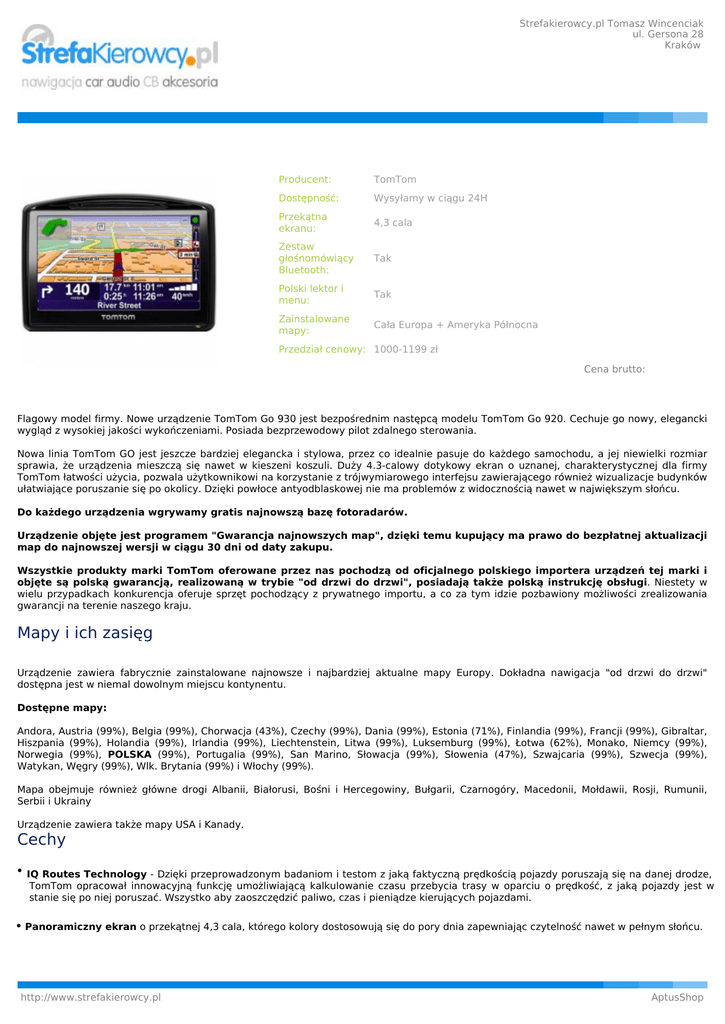 Strefakierowcy.pl Tomasz Wincenciak ul. Gersona 28 Kraków Producent: TomTom Dostępność: Wysyłamy w ciągu 24H Przekątna ekranu: 4,3 cala Zestaw głośnomówiący Bluetooth: Tak Polski lektor i menu: Tak Zainstalowane mapy: Cała Europa + Ameryka Północna Przedział cenowy: 1000-1199 zł Cena brutto: Flagowy model firmy. Nowe urządzenie TomTom Go 930 jest bezpośrednim następcą modelu TomTom Go 920. Cechuje go nowy, elegancki wygląd z wysokiej jakości wykończeniami. Posiada bezprzewodowy pilot zdalnego sterowania. Nowa linia TomTom GO jest jeszcze bardziej elegancka i stylowa, przez co idealnie pasuje do każdego samochodu, a jej niewielki rozmiar sprawia, że urządzenia mieszczą się nawet w kieszeni koszuli. Duży 4.3-calowy dotykowy ekran o uznanej, charakterystycznej dla firmy TomTom łatwości użycia, pozwala użytkownikowi na korzystanie z trójwymiarowego interfejsu zawierającego również wizualizacje budynków ułatwiające poruszanie się po okolicy. Dzięki powłoce antyodblaskowej nie ma problemów z widocznością nawet w największym słońcu. Do każdego urządzenia wgrywamy gratis najnowszą bazę fotoradarów. Urządzenie objęte jest programem "Gwarancja najnowszych map", dzięki temu kupujący ma prawo do bezpłatnej aktualizacji map do najnowszej wersji w ciągu 30 dni od daty zakupu. Wszystkie produkty marki TomTom oferowane przez nas pochodzą od oficjalnego polskiego importera urządzeń tej marki i objęte są polską gwarancją, realizowaną w trybie "od drzwi do drzwi", posiadają także polską instrukcję obsługi. Niestety w wielu przypadkach konkurencja oferuje sprzęt pochodzący z prywatnego importu, a co za tym idzie pozbawiony możliwości zrealizowania gwarancji na terenie naszego kraju. Mapy i ich zasięg Urządzenie zawiera fabrycznie zainstalowane najnowsze i najbardziej aktualne mapy Europy. Dokładna nawigacja "od drzwi do drzwi" dostępna jest w niemal dowolnym miejscu kontynentu. Dostępne mapy: Andora, Austria (99%), Belgia (99%), Chorwacja (43%), Czechy (99%), Dania (99%), Estonia (71%), Finlandia (99%), Francji (99%), Gibraltar, Hiszpania (99%), Holandia (99%), Irlandia (99%), Liechtenstein, Litwa (99%), Luksemburg (99%), Łotwa (62%), Monako, Niemcy (99%), Norwegia (99%), POLSKA (99%), Portugalia (99%), San Marino, Słowacja (99%), Słowenia (47%), Szwajcaria (99%), Szwecja (99%), Watykan, Węgry (99%), Wlk. Brytania (99%) i Włochy (99%). Mapa obejmuje również główne drogi Albanii, Białorusi, Bośni i Hercegowiny, Bułgarii, Czarnogóry, Macedonii, Mołdawii, Rosji, Rumunii, Serbii i Ukrainy Urządzenie zawiera także mapy USA i Kanady. Cechy IQ Routes Technology - Dzięki przeprowadzonym badaniom i testom z jaką faktyczną prędkością pojazdy poruszają się na danej drodze, TomTom opracował innowacyjną funkcję umożliwiającą kalkulowanie czasu przebycia trasy w oparciu o prędkość, z jaką pojazdy jest w stanie się po niej poruszać. Wszystko aby zaoszczędzić paliwo, czas i pieniądze kierujących pojazdami. Panoramiczny ekran o przekątnej 4,3 cala, którego kolory dostosowują się do pory dnia zapewniając czytelność nawet w pełnym słońcu. http://www.strefakierowcy.pl AptusShop Strefakierowcy.pl Tomasz Wincenciak ul. Gersona 28 Kraków Technologia TomTom Map Share?. Ta unikalna technologia pozwala użytkownikowi błyskawicznie wzbogacać, aktualizować i personalizować swoje mapy. Pozwala ona również udostępniać i korzystać ze zmian wprowadzanych przez innych użytkowników codziennie, automatycznie i bezproblemowo za pomocą programu TomTom HOME. Dzięki technologii TomTom Map Share? użytkownicy urządzeń TomTom mają najbardziej aktualne mapy w zasięgu ręki. Gwarancja aktualności map. Jeżeli zostanie wydana nowa wersja mapy do urządzenia w ciągu 30 dni od zakupu, można ją pobrać bezpłatnie za pomocą programu TomTom HOME.. Technologia Enhanced Positioning. Zapewnia ciągłą nawigację, nawet gdy nawigator nie ma możliwości odbioru sygnału GPS (np. w tunelach lub pomiędzy wysokimi budynkami). Duża liczba fabrycznie ładowanych użytecznych miejsc (POI). Zawierają one dodatkowe informacje o miejscach docelowych, np. zdjęcia, mapy ogólne, numery telefonów i opisy. Zaawansowany asystent pasa ruchu - Urządzenia serii GOx30, chcąc sprostać wymaganiom klientów, mają dokładny podział na pasy ruchu, co znacznie ułatwia nawigację i poruszanie się po drodze. Szybka i dokładna nawigacja - Dzięki QuickGPSfix? i odbiornikowi wysokiej czułości nawigowanie rozpoczyna się od razu po wyjęciu urządzenia z pudełka. W przypadku zjechania z wyznaczonej trasy system natychmiast wyznacza nową trasę. Możliwość wyboru różnych rodzajów trasy: najszybszej, najkrótszej, pieszej, rowerowej, z ograniczoną prędkością oraz omijającej drogi ekspresowe, przy jednoczesnym uwzględnieniu jakości nawierzchni i klasy drogi. Funkcje dodatkowe: odtwarzacz plików mp3, przeglądarka zdjęć, przeglądarka dokumentów (html, txt, doc). Szybkie wytyczenie trasy alternatywnej w wypadku napotkania przeszkody na drodze. Ulepszony zestaw głośnomówiący Bluetooth - Ulepszony zestaw głośnomówiący posiada nowy, wysokiej jakości system dźwięku oferujący użytkownikom głośnomówiące dzwonienie poprzez technologię Bluetooth?. Zoptymalizowana akustyka, ulepszona redukcja szumów i echa oraz funkcja automatycznej odpowiedzi w TomTom GO 930 zapewniają kierowcy wykonywanie i odbieranie telefonów łatwiejsze niż kiedykolwiek. Ponadto, uwaga kierowcy pozostaje skupiona wyłącznie na drodze. Opcje audio i wbudowany nadajnik FM - Nowa linia produktów TomTom GO jest wyposażona w funkcje audio w celu bezbłędnej integracji z systemem stereo w samochodzie i telefonem użytkownika. Kierowcy mogą słuchać swoich ulubionych piosenek poprzez zintegrowany odtwarzacz MP3 albo za pomocą iPoda podłączonego do TomTom GO. Ponadto, muzyka i instrukcje nawigacji mogą być odtwarzane 