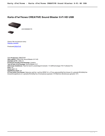 Karty d?wi?kowe : Karta d?wi?kowa CREATIVE Sound Blaster X-Fi HD USB Karta d?wi?kowa CREATIVE Sound Blaster X-Fi HD USB AVCVKD000170 Ocena: Nie ma jeszcze oceny Zapytaj o produkt ProducentCREATIVE Opis Producent: CREATIVE Opis ogólny: CREATIVE Sound Blaster X-Fi HD Interfejs do PC: USB 2.0 Producent uk?adu d?wi?kowego: Creative Typ uk?adu d?wi?kowego: Sound Blaster X-Fi Informacje dodatkowe: Wyj?cie kana?u przedniego/s?uchawki: 114 dBTechnologia THX TruStudio Pro Pilot: nie Game port: nie Dodatkowy panel: nie Z??cza karty d?wi?kowej: Optyczne wej?cie i wyj?cie SPDIF (2 x z??cza optyczne)Wyj?cie liniowe (2 x gniazda RCA)Wej?cie liniowe/fonograficzne (2 x gniazda RCA)Wyj?cie s?uchawkowe (gniazdo 1/4")Wej?cie mikrofonowe (gniazdo 1/4") 1 / 1 Powered by TCPDF (www.tcpdf.org)