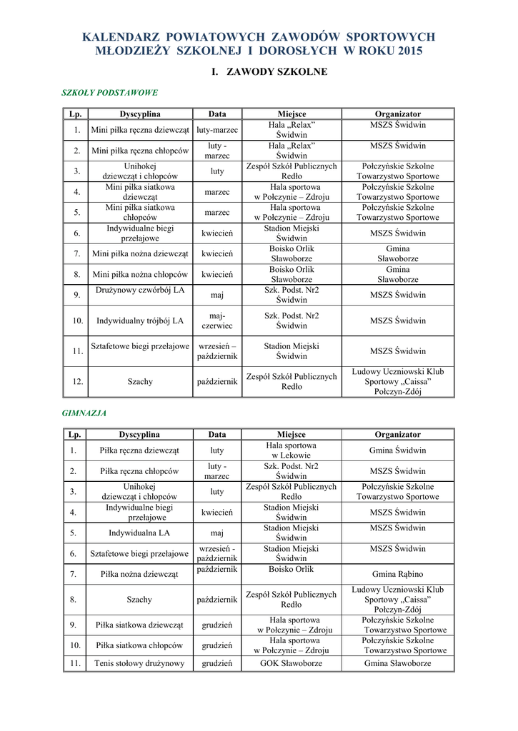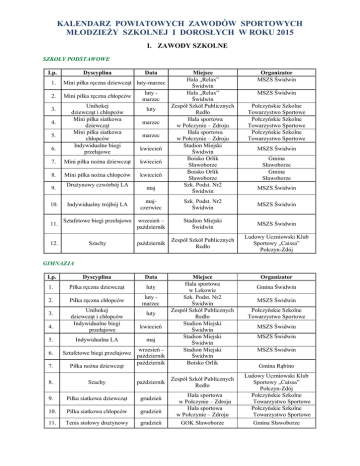 KALENDARZ POWIATOWYCH ZAWODÓW SPORTOWYCH MŁODZIEŻY SZKOLNEJ I DOROSŁYCH W ROKU 2015 I. ZAWODY SZKOLNE SZKOŁY PODSTAWOWE Lp. 1. 2. 3. 4. 5. 6. 7. 8. 9. 10. 11. Dyscyplina Data Miejsce Hala „Relax” Mini piłka ręczna dziewcząt luty-marzec Świdwin luty Hala „Relax” Mini piłka ręczna chłopców marzec Świdwin Unihokej Zespół Szkół Publicznych luty dziewcząt i chłopców Redło Mini piłka siatkowa Hala sportowa marzec dziewcząt w Połczynie – Zdroju Mini piłka siatkowa Hala sportowa marzec chłopców w Połczynie – Zdroju Indywidualne biegi Stadion Miejski kwiecień przełajowe Świdwin Boisko Orlik Mini piłka nożna dziewcząt kwiecień Sławoborze Boisko Orlik Mini piłka nożna chłopców kwiecień Sławoborze Drużynowy czwórbój LA Szk. Podst. Nr2 maj Świdwin Organizator MSZS Świdwin MSZS Świdwin Połczyńskie Szkolne Towarzystwo Sportowe Połczyńskie Szkolne Towarzystwo Sportowe Połczyńskie Szkolne Towarzystwo Sportowe MSZS Świdwin Gmina Sławoborze Gmina Sławoborze MSZS Świdwin Indywidualny trójbój LA majczerwiec Szk. Podst. Nr2 Świdwin MSZS Świdwin Sztafetowe biegi przełajowe wrzesień – październik Stadion Miejski Świdwin MSZS Świdwin Szachy październik Zespół Szkół Publicznych Redło Ludowy Uczniowski Klub Sportowy „Caissa” Połczyn-Zdój Dyscyplina Data 12. GIMNAZJA Lp. 1. 2. 3. 4. 5. 6. 7. Miejsce Hala sportowa Piłka ręczna dziewcząt luty w Lekowie luty Szk. Podst. Nr2 Piłka ręczna chłopców marzec Świdwin Unihokej Zespół Szkół Publicznych luty dziewcząt i chłopców Redło Indywidualne biegi Stadion Miejski kwiecień przełajowe Świdwin Stadion Miejski Indywidualna LA maj Świdwin wrzesień Stadion Miejski Sztafetowe biegi przełajowe październik Świdwin październik Boisko Orlik Piłka nożna dziewcząt 8. Szachy październik 9. Piłka siatkowa dziewcząt grudzień 10. Piłka siatkowa chłopców grudzień 11. Tenis stołowy drużynowy grudzień Zespół Szkół Publicznych Redło Hala sportowa w Połczynie – Zdroju Hala sportowa w Połczynie – Zdroju GOK Sławoborze Organizator Gmina Świdwin MSZS Świdwin Połczyńskie Szkolne Towarzystwo Sportowe MSZS Świdwin MSZS Świdwin MSZS Świdwin Gmina Rąbino Ludowy Uczniowski Klub Sportowy „Caissa” Połczyn-Zdój Połczyńskie Szkolne Towarzystwo Sportowe Połczyńskie Szkolne Towarzystwo Sportowe Gmina Sławoborze SZKOŁY PONADGIMNAZJALNE Lp. Dyscyplina Data Miejsce 1. Koszykówka dziewcząt luty Hala „Relax” Świdwin 2. Koszykówka chłopców luty Hala „Relax” Świdwin luty Hala sportowa w Połczynie – Zdroju luty Hala sportowa w Połczynie – Zdroju 3. 4. 5. 6. 7. 8. Piłka siatkowa dziewcząt Piłka siatkowa chłopców Tenis stołowy Mistrzostwa Powiatu Szkół Ponadgimnazjalnych w Pływaniu Sztafetowe biegi przełajowe Piłka noża dziewcząt luty marzec wrzesień październik wrzesień października 9. Piłka nożna chłopców październik 10. Szachy październik 11. fPiłka ręczna dziewcząt grudzień 12. Piłka ręczna chłopców grudzień Hala „Relax” w Świdwinie Organizator Zespół Szkół Rolniczych CKP w Świdwinie Zespół Szkół Rolniczych CKP w Świdwinie Zespół Szkół Ponadgimnazjalnych w Połczynie-Zdroju Zespół Szkół Ponadgimnazjalnych w Połczynie-Zdroju MSZS Świdwin Park Wodny „Relax” Świdwin Park Wodny „Relax” Świdwin Stadion Miejski Świdwin Stadion Miejski Świdwin Stadion Miejski Świdwin MSZS Świdwin Zespół Szkół Publicznych Redło Ludowy Uczniowski Klub Sportowy „Caissa” Połczyn-Zdój Zespół Szkół Rolniczych CKP w Świdwinie Zespół Szkół Rolniczych CKP w Świdwinie MSZS Świdwin MSZS Świdwin ZSR CKP w Świdwinie ZSR CKP w Świdwinie