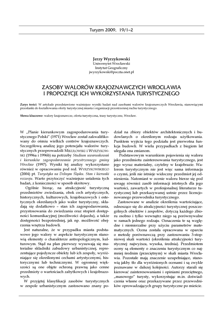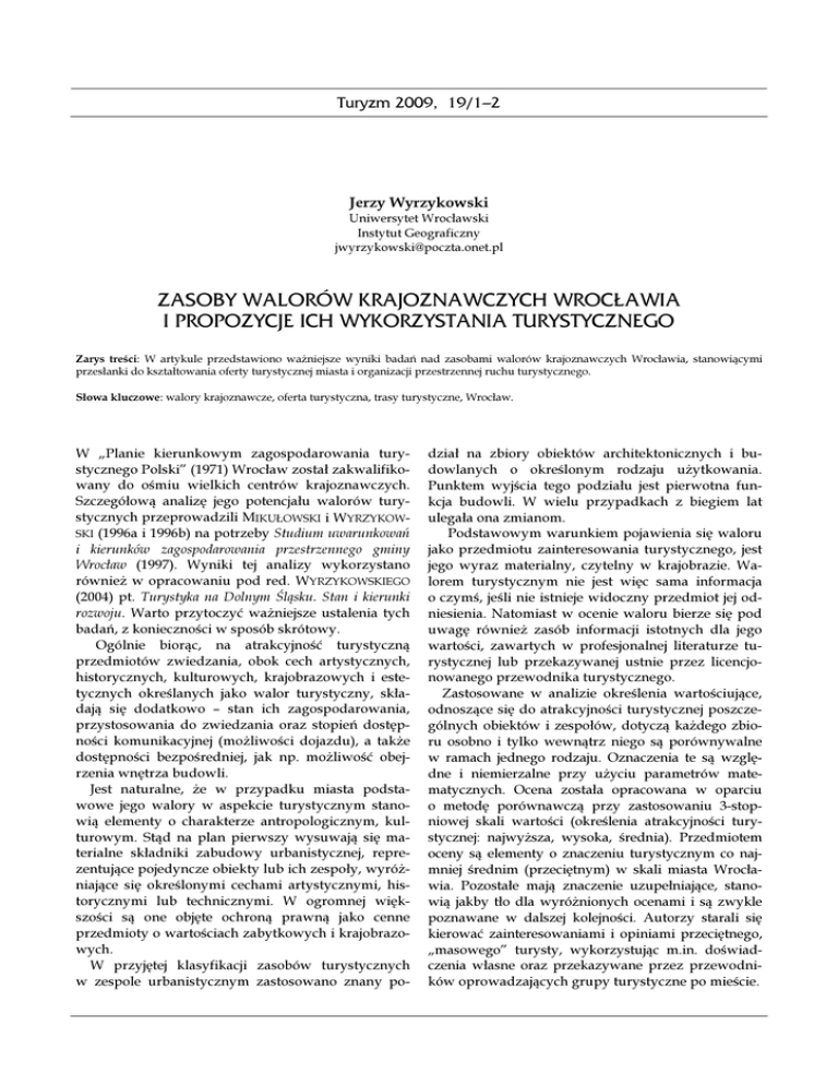 Turyzm 2009, 19/1–2 Jerzy Wyrzykowski Uniwersytet Wrocławski Instytut Geograficzny [email protected] ZASOBY WALORÓW KRAJOZNAWCZYCH WROCŁAWIA I PROPOZYCJE ICH WYKORZYSTANIA TURYSTYCZNEGO Zarys treści: W artykule przedstawiono ważniejsze wyniki badań nad zasobami walorów krajoznawczych Wrocławia, stanowiącymi przesłanki do kształtowania oferty turystycznej miasta i organizacji przestrzennej ruchu turystycznego. Słowa kluczowe: walory krajoznawcze, oferta turystyczna, trasy turystyczne, Wrocław. W „Planie kierunkowym zagospodarowania turystycznego Polski” (1971) Wrocław został zakwalifikowany do ośmiu wielkich centrów krajoznawczych. Szczegółową analizę jego potencjału walorów turystycznych przeprowadzili MIKUŁOWSKI i WYRZYKOWSKI (1996a i 1996b) na potrzeby Studium uwarunkowań i kierunków zagospodarowania przestrzennego gminy Wrocław (1997). Wyniki tej analizy wykorzystano również w opracowaniu pod red. WYRZYKOWSKIEGO (2004) pt. Turystyka na Dolnym Śląsku. Stan i kierunki rozwoju. Warto przytoczyć ważniejsze ustalenia tych badań, z konieczności w sposób skrótowy. Ogólnie biorąc, na atrakcyjność turystyczną przedmiotów zwiedzania, obok cech artystycznych, historycznych, kulturowych, krajobrazowych i estetycznych określanych jako walor turystyczny, składają się dodatkowo – stan ich zagospodarowania, przystosowania do zwiedzania oraz stopień dostępności komunikacyjnej (możliwości dojazdu), a także dostępności bezpośredniej, jak np. możliwość obejrzenia wnętrza budowli. Jest naturalne, że w przypadku miasta podstawowe jego walory w aspekcie turystycznym stanowią elementy o charakterze antropologicznym, kulturowym. Stąd na plan pierwszy wysuwają się materialne składniki zabudowy urbanistycznej, reprezentujące pojedyncze obiekty lub ich zespoły, wyróżniające się określonymi cechami artystycznymi, historycznymi lub technicznymi. W ogromnej większości są one objęte ochroną prawną jako cenne przedmioty o wartościach zabytkowych i krajobrazowych. W przyjętej klasyfikacji zasobów turystycznych w zespole urbanistycznym zastosowano znany po- dział na zbiory obiektów architektonicznych i budowlanych o określonym rodzaju użytkowania. Punktem wyjścia tego podziału jest pierwotna funkcja budowli. W wielu przypadkach z biegiem lat ulegała ona zmianom. Podstawowym warunkiem pojawienia się waloru jako przedmiotu zainteresowania turystycznego, jest jego wyraz materialny, czytelny w krajobrazie. Walorem turystycznym nie jest więc sama informacja o czymś, jeśli nie istnieje widoczny przedmiot jej odniesienia. Natomiast w ocenie waloru bierze się pod uwagę również zasób informacji istotnych dla jego wartości, zawartych w profesjonalnej literaturze turystycznej lub przekazywanej ustnie przez licencjonowanego przewodnika turystycznego. Zastosowane w analizie określenia wartościujące, odnoszące się do atrakcyjności turystycznej poszczególnych obiektów i zespołów, dotyczą każdego zbioru osobno i tylko wewnątrz niego są porównywalne w ramach jednego rodzaju. Oznaczenia te są względne i niemierzalne przy użyciu parametrów matematycznych. Ocena została opracowana w oparciu o metodę porównawczą przy zastosowaniu 3-stopniowej skali wartości (określenia atrakcyjności turystycznej: najwyższa, wysoka, średnia). Przedmiotem oceny są elementy o znaczeniu turystycznym co najmniej średnim (przeciętnym) w skali miasta Wrocławia. Pozostałe mają znaczenie uzupełniające, stanowią jakby tło dla wyróżnionych ocenami i są zwykle poznawane w dalszej kolejności. Autorzy starali się kierować zainteresowaniami i opiniami przeciętnego, „masowego” turysty, wykorzystując m.in. doświadczenia własne oraz przekazywane przez przewodników oprowadzających grupy turystyczne po mieście. 100 Turyzm 2009, 19/1–2 Zabytki sakralne są tymi, które w przypadku Wrocławia stanowią przede wszystkim o atrakcyjności turystycznej miasta. Wynika to zarówno z ich dużej liczby, jak również wysokich wartości artystyczno-historycznych oraz reprezentatywności poszczególnych stylów architektury. Największa koncentracja kościołów występuje na terenie Starego Miasta i Ostrowa Tumskiego. Dominują kościoły gotyckie, częściowo z barokowym wystrojem wnętrz, są też przykłady wysokiej klasy obiektów barokowych. Duże zainteresowanie budzą również niektóre kościoły współczesne, pochodzące z drugiej połowy XX stulecia. Uwzględnione w analizie obiekty sakralne o łącznej liczbie 53, otrzymały następujące oceny pod względem atrakcyjności turystycznej: najwyższa – 7, wysoka – 28, średnia – 18. W grupie obiektów o najwyższej wartości znalazły się: kościół św. Marii Magdaleny, kościół św. Wojciecha, kościół Imienia Jezus, kościół św. Klary, katedra św. Jana Chrzciciela, kościół św. Krzyża i św. Bartłomieja, kościół Najświętszej Marii Panny. Stosunkowo liczne są we Wrocławiu obiekty użyteczności publicznej. W większości koncentrują się one na obszarze Starego Miasta i jego obrzeży, co wiąże się z ich funkcją usługową i potrzebą dobrej dostępności. Stanowią siedziby władz miejskich, urzędów i instytucji, usług handlowych, kulturalnych, ogólnospołecznych. Są to na ogół okazałe gmachy, o interesującym wystroju zewnętrznym i nietypowych rozwiązaniach wnętrz. Budynki użyteczności publicznej, o łącznej liczbie 46, otrzymały następujące oceny pod względem atrakcyjności turystycznej: najwyższa – 6, wysoka –19, średnia 21. Pierwszą grupę, najbardziej interesujących budynków lub zespołów, tworzą: Stary Ratusz, Opera Wrocławska, Gmach Główny Uniwersytetu, Hala Ludowa, Dworzec Główny kolejowy oraz zespół zabudowań Stadionu Olimpijskiego. Pałace, zamki, dwory cieszą się powszechnym zainteresowaniem turystów, zwłaszcza gdy pełnią funkcje muzealne i mają wyposażenie o charakterze nawi