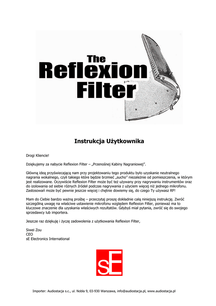 Instrukcja Użytkownika Drogi Kliencie! Dziękujemy za nabycie Reflexion Filter – „Przenośnej Kabiny Nagraniowej”. Główną ideą przyświecającą nam przy projektowaniu tego produktu było uzyskanie neutralnego nagrania wokalnego, czyli takiego które będzie brzmieć „sucho” niezależnie od pomieszczenia, w którym jest realizowane. Oczywiście Reflexion Filter może być też używany przy nagrywaniu instrumentów oraz do izolowania od siebie różnych źródeł podczas nagrywania z użyciem więcej niż jednego mikrofonu. Zastosowań może być pewnie jeszcze więcej i chętnie dowiemy się, do czego Ty używasz RF! Mam do Ciebie bardzo ważną prośbę – przeczytaj proszę dokładnie całą niniejszą instrukcję. Zwróć szczególną uwagę na właściwe ustawienie mikrofonu względem Reflexion Filter, ponieważ ma to kluczowe znaczenie dla uzyskania właściwych rezultatów. Gdybyś miał pytania, zwróć się do swojego sprzedawcy lub importera. Jeszcze raz dziękuję i życzę zadowolenia z użytkowania Reflexion Filter, Siwei Zou CEO sE Electronics International Importer: Audiostacja s.c., ul. Nobla 9, 03-930 Warszawa, [email protected], www.audiostacja.pl Czym jest Reflexion Filter? Reflexion Filter to przenośne urządzenie umożliwiające nagrywanie różnych źródeł przy użyciu mikrofonu przy znacznym lub całkowitym zredukowaniu akustyki pomieszczenia. Reflexion Filter to zaawansowana „ścianka” kompozytowa, którą montuje się na statywie mikrofonowym za pomocą dołączonego regulowanego uchwytu – pomaga to uzyskać „neutralne” i „suche” nagranie nawet w pomieszczeniach bez prawidłowej adaptacji lub izolacji akustycznej. Co więcej, Reflexion Filter to prawdziwe wybawienie dla właścicieli domowych czy projektowych studiów nagrań, gdzie często reżyserka i kabina nagraniowa to to samo pomieszczenie. Od teraz szum z komputera lub odgłosy zza okna nie będą już problemem! Trochę techniki: Reflexion Filter posiada 6 głównych warstw. Po pierwsze solidna warstwa z dziurkowanego aluminium, która przepuszcza fale dźwiękowe i kieruje je, rozproszone, do warstwy zrobionej z pochłaniającej energię akustyczną wełny. Następnie dźwięk trafia na folię aluminiową, która rozprasza energię dźwiękową i pomaga osłabić fale o niskiej częstotliwości. Potem kolejna „warstwa”, czyli pusta przestrzeń, która pracuje jak bariera akustyczna. Następnie znowu warstwa wełny i znowu dziurkowane aluminium, co umożliwia zaabsorbowanie i wchłonięcie pozostałej energii akustycznej. Główny pochłaniacz energii zrobiony jest w kawałków pianki aluminiowej, która pochłania i rozprasza fale dźwiękowe, kierując je do głównego filtra. W komplecie kupujący otrzymuje także specjalną belkę montażową, która pozwala na jednoczesne zamontowanie Reflexion Filter oraz standardowego uchwytu mikrofonowego do pojedynczego statywu. Mocowanie umożliwia na dowolne ustawienie urządzenia względem mikrofonu w celu osiągnięcia optymalnej pozycji. Jak to działa? Różne warstwy, z których zbudowany jest Reflexion Filter pochłaniają i rozpraszają fale dźwiękowe, co powoduje, że energia akustyczna stopniowo osłabia się. To z kolei sprawia, że coraz mniej „niepożądanej” energii akustycznej „uderza” w ściany pomieszczenia i inne powierzchnie, co bardzo znacznie ogranicza wpływ akustyki pomieszczenia na dźwięk trafiający do membrany mikrofonu. Kształt filtra został wnikliwie przetestowany i dobrany w celu zmaksymalizowania efektu absorpcji przy jednoczesnym ograniczeniu koloracji dźwięku (na poziomie max. 1dB) i niewpływaniu na charakterystykę kierunkową mikrofonu. Podsumowując: Reflexion Filter to bardzo nowatorskie i użyteczne urządzenie. Umożliwi Ci nagrywanie wokali, gitar i innych instrumentów bez potrzeby posiadania specjalnego pomieszczenia. Pozwoli Ci na odseparowanie dwóch lub więcej instrumentalistów nagrywających jednocześnie do różnych mikrofonów. Jest lekki. Jest bardzo nowoczesny i wykorzystuje opatentowaną technologię. Działa! I kosztuje ułamek kwoty, jaką trzeba by zainwestować w adaptację akustyczną pomieszczenia. Masz studio? Chcesz nagrywać i realizować jednocześnie? Reflexion Filter jest właśnie dla Ciebie! Importer: Audiostacja s.c., ul. Nobla 9, 03-930 Warszawa, [email protected], www.audiostacja.pl Instalacja Reflexion Filter 1. Wyjmij komplet z opakowania – zachowaj opakowanie na wypadek gdybyś chciał przechować lub przewieźć sprzęt – RF to solidny kawał metalu (i nie tylko), ale może ulec uszkodzeniu jeżeli nie będzie właściwie przechowywany lub przewożony. W opakowaniu powinieneś znaleźć następujące elementy: Reflexion Filter oraz system mocujący RF do statywu: uchwyt do statywu, pręt mocujący oraz klucz do przykręcenie pręta do RF. 1. 2. Przykręć uchwyt mocujący do statywu mikrofonowego. Postaraj się o porządny i stabilny statyw, ponieważ uchwyt razem z RF i mikrofonem trochę waży… Jeżeli to możliwe przymocuj uchwyt do pionowej rurki statywu (a nie do regulowanej rurki, do której zwykle mocujesz mikrofon). Uchwyt mocujący wyposażony jest w sprężynę, która ułatwia prawidłowe mocowanie uchwytu do statywu. Statywy mają różne wymiary i średnice rurek, ale uchwyt skonstruowany jest w taki sposób, aby możliwe było zamocowanie go do większości statywów. Ważne jest, aby dwie części uchwytu które obejmują rurkę statywu były do siebie równoległe – wtedy „chwyt” jest najlepszy. 3. Przykręć pręt mocujący do Reflexion Filter. Dokręć go przy użyciu załączonego klucza płaskiego. Importer: Audiostacja s.c., ul. Nobla 9, 03-930 Warszawa, [email protected], www.audiostacja.pl 4. Następnie przymocuj Reflexion Filter do uchwytu mocującego – włóż pręt mocujący do otworu w uchwycie i dokręć go porządnie za pomocą metalowej „rączki”. 5. Możesz teraz poeksperymentować z usta