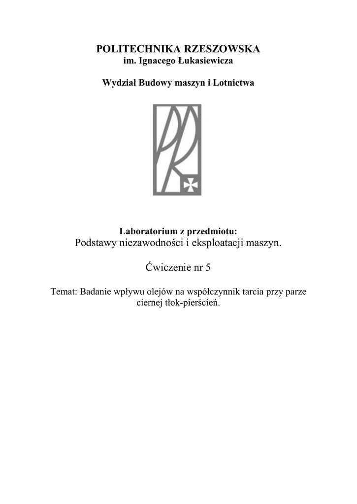 POLITECHNIKA RZESZOWSKA im. Ignacego Łukasiewicza Wydział Budowy maszyn i Lotnictwa Laboratorium z przedmiotu: Podstawy niezawodności i eksploatacji maszyn. Ćwiczenie nr 5 Temat: Badanie wpływu olejów na współczynnik tarcia przy parze ciernej tłok-pierścień. Ćwiczenie: 5 Temat: Badanie wpływu olejów na współczynnik tarcia przy parze ciernej tłok-pierścień. 1. Cel ćwiczenia. Celem ćwiczenia jest ustalenie wpływu różnych olejów na współczynnik tarcia przy zastosowaniu testera do ruchu posuwisto-zwrotnego. 2. Obsługa testera. 2 3 1 Rys.1. Widok testera do badań w ruchu posuwisto zwrotnym, 1- klatkowy silnik indukcyjny; 2- układ obciążający; 3- wózek wykonujący ruch posuwisto zwrotny. Badania podczas ćwiczenia będą realizowane na testerze do ruchu posuwisto zwrotnego wykonanego na Politechnice Rzeszowskiej. Badane próbki to wycinek tulei cylindrowej dla silnika typu DIESEL wykonane przez firmę VOLVO, jako przeciwpróbkę zastosowano wycinek pierścienia przeznaczono do współpracy z tulejami tego typu. Próby będą przeprowadzane przy zastosowaniu tych samych powierzchni współpracujących ze sobą aby móc porównać możliwości stosowanych olejów. Oleje należy podawać w miejsce współpracy przy wyłączonym silniku. Należy pamiętać aby przed zastosowaniem kolejnego badanego oleju zetrzeć z miejsca współpracy poprzedni olej. 5 4 Rys.2. Widok zamontowanej próbki wraz z układem obciążającym. 4- płytka wycięta z tulei cylindrowej na którą podajemy olej; 5- nakrętka przy pomocy której zdejmowane jest obciążenie. Procedura czyszczenia próbek z oleju: a) Przy pomocy nakrętki (5) odciążamy próbkę odkręcając ją b) Wycieramy olej z dostępnych miejsc próbki c) Przy pomocy falownika włączamy silnik aby wykonał kilka obrotów a następnie zatrzymujemy silnik d) Ponownie wycieramy dostępne miejsca próbki e) Następnie w odsłonięte miejsce (4) nanosimy 5 kropli badanego oleju UWAGA: Wszelkie operacje dotyczące czyszczenia próbki z oleju wykonujemy bezwzględnie przy WYŁĄCZONYM silniku. Niestosowanie się do tej zasady grozi obcięciem palców bądź innymi obrażeniami ciała. Sterowanie parametrami ruchu. Ustawianie prędkości obrotowej silnika odbywa się przez falownik SJ300 firmy HITACHI. Rys.3. Panel przedni falownika SJ300 firmy HITACHI Opis przycisków: RUN (zielony)– start silnika STOP (czerwony)- stop STRZAŁKI „1” i „2” - regulacja prędkości obrotowej ( możliwa jedynie podczas pracy silnika) Odczyt siły tarcia. 5 Rys.4. Panel przedni przetwornika MECMESIN Przycisk POWER – uruchomienie urządzenia ZERO- zerowanie wskazań urządzenia (należy wykonać zerowanie przy wyłączonym silniku) RESET- kasacja zapamiętanych przez urządzenie maksymalnej i minimalnej siły tarcia w trakcie testu 5 – wskazania czujnika; od góry: maksymalna siła tarcia, minimalna siła tarcia, chwilowa siła tarcia ( siła tarcia jest podana w [N]) 3. Procedura wykonania ćwiczenia: a) Czyszczenie próbki (opisane powyżej; wykonać tylko przy konieczności wymiany oleju) b) Mocowanie zadanego obciążenia c) Start silnika d) Regulacja prędkości obrotowej e) Stop silnika f) Zwolnienie obciążenia przy pomocy nakrętki (5) g) Zerowanie przetwornika MECMESIN h) Start silnika i) Odczyt siły tarcia (po około 120 s od uruchomienia testera) j) Stop silnika Podczas wykonywania testów dla tego samego oleju, ale przy różnych prędkościach obrotowych, stosujemy dla kolejnych prędkości obrotowych procedurę z pominięciem czyszczenia próbki. 4. Zadania do wykonania a) Dla 3 zadanych olejów i zadanego obciążenia (5kg i 10kg) wykonać pomiary siły tarcia przy prędkościach do 100 do 300 obr/min z krokiem 50 obr/min. b) Na podstawie uzyskanych danych wykreślić krzywe zależności siły tarcia od prędkości obrotowej c) Z kart charakterystyk podanego oleju określić jego lepkość oraz stosowane dodatki i wyjaśnić jakie mogą one mieć wpływ na uzyskane wyniki. Rok: Członkowie grupy: 1…………………. 2…………………. 3…………………. Laboratorium z przedmiotu: Podstawy niezawodności i eksploatacji maszyn. Ćwiczenie nr 5 Grupa: Temat: Badanie wpływu olejów na współczynnik tarcia przy parze ciernej tłok-pierścień. Data: Prędkości obrotowe [obr/min] Olej: Obciążenie [kg] 5 100 Średnia max Średnia 250 300 max Średnia min Średnia max min Średnia min 150 Średnia max Średnia min Średnia max min 200 max max Średnia min 250 300 Siły tarcia podczas testu [N] max Średnia max max Średnia min Średnia max 100 max Średnia min Średnia min max min Średnia min 150 Średnia max Średnia min Średnia max min 200 max max Średnia min 250 300 Siły tarcia podczas testu [N] max Średnia min 10 max 100 min Prędkości obrotowe [obr/min] Olej: Obciążenie [kg] 5 Średnia min min 10 max min min Prędkości obrotowe [obr/min] Olej: Obciążenie [kg] 5 200 Siły tarcia podczas testu [N] max min 10 150 max min max Średnia min Średnia max min max Średnia min Średnia max min max Średnia min Średnia max min max Średnia min Średnia max min Średnia