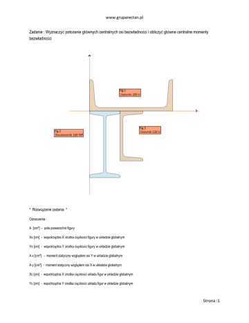 www.gruparectan.pl Zadanie : Wyznaczyć położenie głównych centralnych osi bezwładności i obliczyć główne centralne momenty bezwładności * Rozwiązanie zadania * Oznaczenia : A [cm²] - pole powierzchni figury Xo [cm] - współrzędna X środka ciężkości figury w układzie globalnym Yo [cm] - współrzędna Y środka ciężkości figury w układzie globalnym A·x [cm³] - moment statyczny względem osi Y w układzie globalnym A·y [cm³] - moment statyczny względem osi X w układzie globalnym Xc [cm] - współrzędna X środka ciężkości układu figur w układzie globalnym Yc [cm] - współrzędna Y środka ciężkości układu figur w układzie globalnym Strona :1 www.gruparectan.pl xc [cm] - odległość X pomiędzy środkiem ciężkości figury a środkiem ciężkości układu yc [cm] - odległość Y pomiędzy środkiem ciężkości figury a środkiem ciężkości układu Jx [cm4] - moment bezwładności figury względem osi X Jy [cm4] - moment bezwładności figury względem osi Y Dxy [cm4] - dewiacyjny moment bezwładności figury A·x·x [cm4] - element do wzoru Steinera A·y·y [cm4] - element do wzoru Steinera A·x·y [cm4] - element do wzoru Steinera ............................................................................................................................................................................................................................... Tabela 1 Środki ciężkości Figur Fig. Xo [cm] Yo [cm] A [cm²] A·x [cm³] A·y [cm³] 1 10,000 2,010 32,200 322,000 64,722 2 3,700 -8,000 22,800 84,360 -182,400 3 9,000 -6,000 17,000 153,000 -102,000 72,000 559,360 -219,678 Sumy 1. Położenie XcYc głównych centralnych osi bezwładności względem układu XY Tabela 2 Momenty i Dewiacje Strona :2 www.gruparectan.pl Fig. xc [cm] yc [cm] Jx [cm4] 1 2,231 5,061 148,000 1910,000 0,000 160,287 824,789 363,597 2 -4,069 -4,949 935,000 54,700 0,000 377,474 558,412 459,114 3 1,231 -2,949 364,000 43,200 0,000 25,766 147,834 -61,718 1447,000 2007,900 0,000 563,526 1531,035 760,994 Sumy Jy [cm4] Dxy [cm4] A·x·x [cm4] A·y·y [cm4] A·x·y [cm4] 1. Momenty bezwładności ............................................................................................................................................................................................................................... 1.1.Figura Ceownik 200 U kąt OX : -90 [stopnie] 1.1.1. Odległości środka ciężkości figury od osi X i Y 1.1.2. Wartości Jxo, Jyo, Dxyo w układzie XoYo pierwsza ćwiartka bez obrotu figury 1.1.3. Obliczenie nowych wartości środka ciężkości figury po obrocie o kąt dla uproszczenia obliczeń najpierw dokonamy obrotu figury w układzie lokalnym o kąt a potem przemieszczenia o wektor do punktu docelowego figura znajduje się teraz w takim położeniu jak wzory podane na obliczanie momentów układ taki nazywamy układem lokalnym figury współrzędne X i Y obliczamy ze wzorów na obrót układu : Strona :3 www.gruparectan.pl gdzie X i Y to punkt po transformacji a X' i Y' punkt przed transformacją gdzie φ to kąt obrotu figury układ X'Y' względem układu XY i jeżeli jest on zgodny z ruchem wskazówek zegara to jest on ujemny transformacja figury obróconej do punktu docelowego o wektor dX i dY Gdzie dX i dY to współrzędne początku figury w nowym położeniu 1.1.4. Momenty i dewiacje dla układu nachylonego względem naszego układu XY (ponieważ kąt nachylenia analizowanej figury jest różny od zera i wynosi jak poniżej to należy obliczyć układ nachylony ) Strona :4 www.gruparectan.pl Momenty wejściowe do obliczenia układu nachylonego 1.1.5. Jx w układzie nachylonym 1.1.6. Jy w układzie nachylonym 1.1.7. Dxy w układzie nachylonym Strona :5 www.gruparectan.pl 1.1.8. Ocena czy figura podana została jako ujemna pole dodatnie : figura została podana jako dodatnia wartości : Jxo, Jyo, Dxyo zostaną przy swoich znakach 1.1.9. Odległości od środka ciężkości figury do środka ciężkości układu ............................................................................................................................................................................................................................... 1.2.Figura Dwuteownik 160 INP kąt OX : 0 [stopnie] 1.2.1. Odległości środka ciężkości figury od osi X i Y 1.2.2. Wartości Jxo, Jyo, Dxyo w układzie XoYo pierwsza ćwiartka bez obrotu figury 1.2.3. Układ nachylony nie występuje (kąt nachylenia jest równy zero względem naszego układu XY) 1.2.4. Ocena czy figura podana została jako ujemna pole dodatnie : figura została podana jako dodatnia wartości : Jxo, Jyo, Dxyo zostaną przy swoich znakach Strona :6 www.gruparectan.pl 1.2.5. Odległości od środka ciężkości figury do środka ciężkości układu ............................................................................................................................................................................................................................... 1.3.Figura Ceownik 120 U kąt OX : 0 [stopnie] 1.3.1. Odległości środka ciężkości figury od osi X i Y 1.3.2. Wartości Jxo, Jyo, Dxyo w układzie XoYo pierwsza ćwiartka bez obrotu figury 1.3.3. Układ nachylony nie występuje (kąt nachylenia jest równy zero względem naszego układu XY) 1.3.4. Ocena czy figura podana została jako ujemna pole dodatnie : figura została podana jako dodatnia wartości : Jxo, Jyo, Dxyo zostaną przy swoich znakach 1.3.5. Odległości od środka ciężkości figury do środka ciężkości układu Strona :7 www.gruparectan.pl ............................................................................................................................................................................................................................... ...............................................................................................................................................................