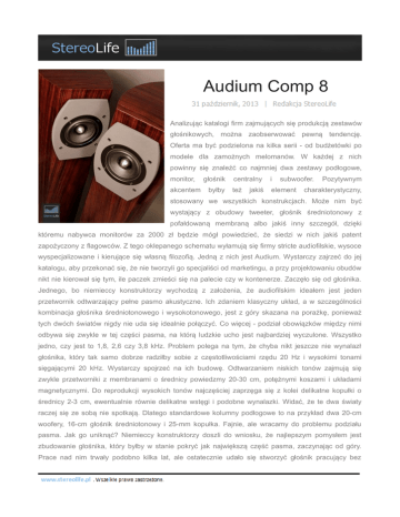 Audium Comp 8 Analizując katalogi firm zajmujących się produkcją zestawów głośnikowych, można zaobserwować pewną tendencję. Oferta ma być podzielona na kilka serii - od budżetówki po modele dla zamożnych melomanów. W każdej z nich powinny się znaleźć co najmniej dwa zestawy podłogowe, monitor, akcentem głośnik byłby centralny i też element jakiś subwoofer. Pozytywnym charakterystyczny, stosowany we wszystkich konstrukcjach. Może nim być wystający z obudowy tweeter, głośnik średniotonowy z pofałdowaną membraną albo jakiś inny szczegół, dzięki któremu nabywca monitorów za 2000 zł będzie mógł powiedzieć, że siedzi w nich jakiś patent zapożyczony z flagowców. Z tego oklepanego schematu wyłamują się firmy stricte audiofilskie, wysoce wyspecjalizowane i kierujące się własną filozofią. Jedną z nich jest Audium. Wystarczy zajrzeć do jej katalogu, aby przekonać się, że nie tworzyli go specjaliści od marketingu, a przy projektowaniu obudów nikt nie kierował się tym, ile paczek zmieści się na palecie czy w kontenerze. Zaczęło się od głośnika. Jednego, bo niemieccy konstruktorzy wychodzą z założenia, że audiofilskim ideałem jest jeden przetwornik odtwarzający pełne pasmo akustyczne. Ich zdaniem klasyczny układ, a w szczególności kombinacja głośnika średniotonowego i wysokotonowego, jest z góry skazana na porażkę, ponieważ tych dwóch światów nigdy nie uda się idealnie połączyć. Co więcej - podział obowiązków między nimi odbywa się zwykle w tej części pasma, na którą ludzkie ucho jest najbardziej wyczulone. Wszystko jedno, czy jest to 1,8, 2,6 czy 3,8 kHz. Problem polega na tym, że chyba nikt jeszcze nie wynalazł głośnika, który tak samo dobrze radziłby sobie z częstotliwościami rzędu 20 Hz i wysokimi tonami sięgającymi 20 kHz. Wystarczy spojrzeć na ich budowę. Odtwarzaniem niskich tonów zajmują się zwykle przetworniki z membranami o średnicy powiedzmy 20-30 cm, potężnymi koszami i układami magnetycznymi. Do reprodukcji wysokich tonów najczęściej zaprzęga się z kolei delikatne kopułki o średnicy 2-3 cm, ewentualnie równie delikatne wstęgi i podobne wynalazki. Widać, że te dwa światy raczej się ze sobą nie spotkają. Dlatego standardowe kolumny podłogowe to na przykład dwa 20-cm woofery, 16-cm głośnik średniotonowy i 25-mm kopułka. Fajnie, ale wracamy do problemu podziału pasma. Jak go uniknąć? Niemieccy konstruktorzy doszli do wniosku, że najlepszym pomysłem jest zbudowanie głośnika, który byłby w stanie pokryć jak największą część pasma, zaczynając od góry. Prace nad nim trwały podobno kilka lat, ale ostatecznie udało się stworzyć głośnik pracujący bez większych problemów w zakresie 150 Hz - 20 kHz. Nic dziwnego, że stał się on znakiem rozpoznawczym niemieckich kolumn, ale na tym firmowa filozofia się nie kończy. Audium dzieli wszystkie swoje konstrukcje na aktywne, półaktywne i pasywne. Mało tego - w ofercie mają się niebawem znaleźć aktywne kolumny bezprzewodowe. Jeśli interesują nas modele pasywne, do wyboru mamy podstawkowe Comp 3 i całą gamę podłogówek - Comp 5, Comp 7, Comp 8 i największe Comp 9. Różnice na pierwszy rzut oka trudno wyłapać, ale okazuje się, że nie kończą się one na gabarytach skrzynek i cenie. Comp 5 to w zasadzie takie podłogowe rozwinięcie modelu Comp 3, Comp 7 mają już podwójną podstawę i tajemniczy wewnętrzny rezonator, w opisywanych Comp 8 zastosowano natomiast głośnik szerokopasmowy z podwójnym stożkiem, a eliptyczny woofer został zastąpiony przetwornikiem wykonywanym na zlecenie przez norweskiego Seasa, natomiast Comp 9 to rozwinięcie modelu Comp 8, z podwójnym cokołem i wewnętrznym rezonatorem. Topowe modele charakteryzują się też wyższą efektywnością, co szczególnie zainteresuje właścicieli lampowych i innych konstrukcji o stosunkowo niskiej mocy. Comp 8 podobno nie były jeszcze nigdzie testowane, więc z tym większym zapałem zabraliśmy się do ich rozpakowywania. Wygląd i funkcjonalność Kartony wyglądały bardzo poważnie, więc do ich odbezpieczania zabraliśmy się ze wzmożoną ostrożnością. Na szczęście sposób pakowania kolumn jest całkiem prosty, dzięki czemu szybko udało nam się je oswobodzić. Już na tym etapie naszą uwagę zwrócił pewien detal - nagwintowane tuleje w podstawie. Niby nic szczególnego, ale tu znalazło się ich aż pięć. Najczęściej widuje się cztery tuleje na kolce, nieco rzadziej trzy, ale pięć? Wątpliwe, aby miało to zwiększyć stabilność kolumn, więc wywnioskowaliśmy, że projektanci chcieli w ten sposób pozostawić wybór użytkownikom. Jeżeli priorytetem będzie dla kogoś stabilność (dzieci, psy i inne dzikie stwory), wkręci sobie cztery kolce, a jeżeli kolumnom nie będzie groziło żadne niebezpieczeństwo, można spróbować z trzema jednocześnie zyskując możliwość delikatnego odchylenia obudów do tyłu (taki audiofilski fetysz) poprzez wkręcenie tylnego kolca na maksa i wykręcenie dwóch przednich na kilka milimetrów. Tak przynajmniej sobie to tłumaczymy. Sami w ogóle nie korzystaliśmy z tego udogodnienia, z przyczyn czysto prozaicznych - parkiet. Oczywiście w takiej sytuacji również można zastosować kolce, podkładając pod nie chociażby monety lub bardziej wymyślne podkładki (ostatnio namierzyliśmy takie w sklepie Audio Forte), ale najprostszą opcją jest przyklejenie filcowych podkładek pod meble w miejscach przeznaczonych na kolce. Dobra, koniec już o tych kolcach! Audiumy stanęły w naszym pokoju odsłuchowym, a my po raz kolejny zachwyciliśmy się ich wykończeniem. W poprzednich testach skupiliśmy się bardziej na ogólnej koncepcji kolumn tej marki i stosowanych przez nią głośnikach, ale przede wszystkim należy powiedzieć, że jakość stolarki - nawet w tańszych modelach - jest iście hi-endowa. Niemcy najwyraźniej doszli d