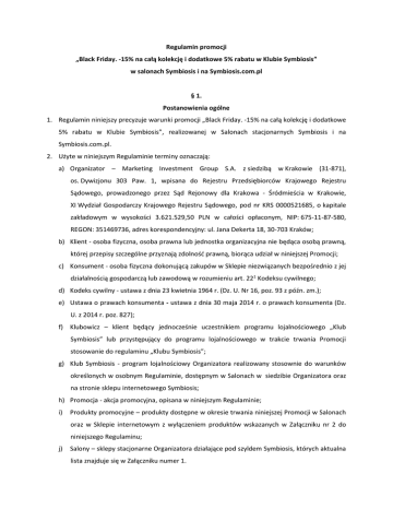 Regulamin promocji „Black Friday. -15% na całą kolekcję i dodatkowe 5% rabatu w Klubie Symbiosis” w salonach Symbiosis i na Symbiosis.com.pl § 1. Postanowienia ogólne 1. Regulamin niniejszy precyzuje warunki promocji „Black Friday. -15% na całą kolekcję i dodatkowe 5% rabatu w Klubie Symbiosis”, realizowanej w Salonach stacjonarnych Symbiosis i na Symbiosis.com.pl. 2. Użyte w niniejszym Regulaminie terminy oznaczają: a) Organizator – Marketing Investment Group S.A. z siedzibą w Krakowie (31-871), os. Dywizjonu 303 Paw. 1, wpisana do Rejestru Przedsiębiorców Krajowego Rejestru Sądowego, prowadzonego przez Sąd Rejonowy dla Krakowa - Śródmieścia w Krakowie, XI Wydział Gospodarczy Krajowego Rejestru Sądowego, pod nr KRS 0000521685, o kapitale zakładowym w wysokości 3.621.529,50 PLN w całości opłaconym, NIP: 675-11-87-580, REGON: 351469736, adres korespondencyjny: ul. Jana Dekerta 18, 30-703 Kraków; b) Klient - osoba fizyczna, osoba prawna lub jednostka organizacyjna nie będąca osobą prawną, której przepisy szczególne przyznają zdolność prawną, biorąca udział w niniejszej Promocji; c) Konsument - osoba fizyczna dokonującą zakupów w Sklepie niezwiązanych bezpośrednio z jej działalnością gospodarczą lub zawodową w rozumieniu art. 221 Kodeksu cywilnego; d) Kodeks cywilny - ustawa z dnia 23 kwietnia 1964 r. (Dz. U. Nr 16, poz. 93 z późn. zm.); e) Ustawa o prawach konsumenta - ustawa z dnia 30 maja 2014 r. o prawach konsumenta (Dz. U. z 2014 r. poz. 827); f) Klubowicz – klient będący jednocześnie uczestnikiem programu lojalnościowego „Klub Symbiosis” lub przystępujący do programu lojalnościowego w trakcie trwania Promocji stosowanie do regulaminu „Klubu Symbiosis”; g) Klub Symbiosis - program lojalnościowy Organizatora realizowany stosownie do warunków określonych w osobnym Regulaminie, dostępnym w Salonach w siedzibie Organizatora oraz na stronie sklepu internetowego Symbiosis; h) Promocja - akcja promocyjna, opisana w niniejszym Regulaminie; i) Produkty promocyjne – produkty dostępne w okresie trwania niniejszej Promocji w Salonach oraz w Sklepie internetowym z wyłączeniem produktów wskazanych w Załączniku nr 2 do niniejszego Regulaminu; j) Salony – sklepy stacjonarne Organizatora działające pod szyldem Symbiosis, których aktualna lista znajduje się w Załączniku numer 1. k) Sklep internetowy - sklep internetowy Organizatora prowadzony pod adresem: http://www.symbiosis.com.pl/ l) Regulamin – niniejszy dokument wraz z załącznikami. §2 Zasady i czas trwania Promocji 1. Promocja trwa w okresie od dnia 25 listopada 2016 r. do dnia 28 listopada 2016 r. 2. W ramach promocji Organizator umożliwia wszystkim Klientom, którzy w okresie jej trwania dokonają w Salonie lub w Sklepie internetowym zakupu Produktów promocyjnych, uzyskanie rabatu w wysokości 15% (słownie: piętnaście procent) od aktualnej ceny zakupionego Produktu promocyjnego. W Sklepie internetowym ceny z uwzględnieniem wyżej wskazanego rabatu widoczne są obok Produktów promocyjnych. 3. Wskazany rabat nie łączy się z innymi akcjami promocyjnymi Organizatora za wyjątkiem rabatu wynikającego z Regulaminu „Klub Symbiosis”. Maksymalna wysokość rabatu, jaki może uzyskać Klubowicz w niniejszej Promocji wynosi 20% (słownie: dwadzieścia procent). 4. Chęć przystąpienia do Promocji w Salonie należy zgłosić przed wystawieniem dokumentu fiskalnego. § 3. Zasady zwrotu i wymiany Produktów promocyjnych zakupionych w Sklepie internetowym 1. Zgodnie z art. 27 Ustawy o prawach konsumenta Konsumentowi przysługuje prawo do odstąpienia od Umowy Sprzedaży Produktów promocyjnych bez podania jakiejkolwiek przyczyny w terminie 14 (słownie: czternastu) dni od dnia w którym Konsument wszedł w posiadanie Produktów promocyjnych lub w którym wskazana przez Konsumenta osoba trzecia inna niż Kurier weszła w posiadanie Produktów promocyjnych. 2. Konsument ponosi odpowiedzialność za zmniejszenie wartości Produktu promocyjnego będące wynikiem korzystania z niego w sposób wykraczający poza konieczny do stwierdzenia charakteru, cech i funkcjonowania Produktu. 3. Ponad uprawnienia Konsumenta, o których mowa w § 3. ust 1 niniejszego Regulaminu Sprzedawca przyznaje wszystkim Klientom dodatkową umowną możliwość odstąpienia od Umowy Sprzedaży bez podawania przyczyn poprzez złożenie właściwego oświadczenia Sprzedawcy na piśmie w terminie do 30 dni od daty wejścia w posiadanie Produktów promocyjnych przez Klienta, pod warunkiem że zwracane Produkty są w stanie niezmienionym, chyba że zmiana była konieczna w granicach zwykłego zarządu. 4. W terminie 30 dni (słownie: trzydziestu) od dnia otrzymania Produktów promocyjnych mogą one zostać wymienione na inne Produkty promocyjne w tej samej cenie, pod warunkiem że zwracane produkty są w stanie niezmienionym (brak śladów użytkowania i/lub zniszczenia), chyba że zmiana była konieczna w granicach zwykłego zarządu. §4. Zasady zwrotu oraz wymiany Produktów promocyjnych zakupionych w Salonach 1. Klientowi przysługuje prawo do odstąpienia od umowy sprzedaży Produktów promocyjnych bez podania przyczyn poprzez złożenie oświadczenia na piśmie w terminie 30 dni (słownie: trzydziestu) od dnia otrzymania Produktów promocyjnych, pod warunkiem, ze zwracane produkty znajdują się w stanie niezmienionym (brak śladów użytkowania i/lub zniszczenia), chyba że zmiana była konieczna w granicach zwykłego zarządu. 2. W przypadku odstąpienia od umowy sprzedaży w ramach niniejszej Promocji Klientowi zwracana jest tylko i wyłącznie cena rzeczywiście przez niego uiszczona za Produkty promocyjne. 3. W terminie 30 dni (słownie: trzydziestu) od dnia otrzymania Produktów promocyjnych mogą one zostać wymienione na inne Produkty promocyjne w tej samej cenie, pod warunkiem że zwracane produkty są w stanie niezmienionym (brak śladów użytkowania i/lub zniszcz
