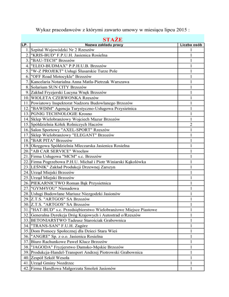 Wykaz pracodawców z którymi zawarto umowy w miesiącu lipcu 2015 : STAŻE LP. 1. 2. 3. 4. 5. 6. 7. 8. 9. 10. 11. 12. 13. 14. 15. 16. 17. 18. 19. 20. 21. 22. 23. 24. 25. 26. 27. 28. 29. 30. 31. 32. 33. 34. 35. 36. 37. 38. 39. 40. 41. 42. Nazwa zakładu pracy Szpital Wojewódzki Nr 2 Rzeszów "KRIS-BUD" F.P.U.H. Jasienica Rosielna "BAU-TECH" Brzozów "ELEO-BUDMAX" P.P.H.U.B. Brzozów "W-Z PROJEKT" Usługi Ślusarskie Turze Pole "OFF Road Motocykle" Brzozów Kancelaria Notarialna Anna Matla-Pietrzak Warszawa Solarium SUN CITY Brzozów Zakład Fryzjerski Lucyna Wnęk Brzozów WIOLETA CZERWONKA Rzeszów Powiatowy Inspektorat Nadzoru Budowlanego Brzozów "BAWDIM" Agencja Turystyczno-Usługowa Przysietnica PGNIG TECHNOLOGIE Krosno Sklep Wielobranżowy Wojciech Mazur Brzozów Spółdzielnia Kółek Rolniczych Haczów Salon Sportowy "AXEL-SPORT" Rzeszów Sklep Wielobranżowy "ELEGANT" Brzozów "BAR PITA" Brzozów Okręgowa Spółdzielnia Mleczarska Jasienica Rosielna "AB CAR SERVICE" Wrocław Firma Usługowa "MCM" s.c. Brzozów Firma Pogrzebowa P.H.U. Michał i Piotr Winiarski Kąkolówka LEŚNIK" Zakład Produkcji Drzewnej Zarszyn Urząd Miejski Brzozów Urząd Miejski Brzozów PIEKARNICTWO Roman Bąk Przysietnica "GYM4YOU" Nienadowa Usługi Budowlane Mariusz Niezgodzki Jasionów Z.T.S. "ARTGOS" SA Brzozów Z.T.S. "ARTGOS" SA Brzozów "HAT-BUD" s.c. Przedsiębiorstwo Wielobranżowe Miejsce Piastowe Generalna Dyrekcja Dróg Krajowych i Autostrad o/Rzeszów BETONIARSTWO Tadeusz Starościak Grabownica "TRANS-SAN" F.U.H. Zagórz Dom Pomocy Społecznej dla Dzieci Stara Wieś "ANGRE" Sp. z o.o. Jasienica Rosielna Biuro Rachunkowe Paweł Klucz Brzozów "JAGODA" Fryzjerstwo Damsko-Męskie Brzozów Produkcja-Handel-Transport Andrzej Piotrowski Grabownica Zespół Szkół Wesoła Urząd Gminy Nozdrzec Firma Handlowa Małgorzata Smoleń Jasionów Liczba osób 1 1 1 1 1 1 1 1 1 1 1 1 1 1 2 1 1 1 1 1 1 1 1 1 1 1 1 1 1 1 1 1 1 1 1 1 1 1 1 1 1 1 PRACE INTERWENCYJNE LP. 1. 2. 3. 4. 5. 6. 7. 8. 9. 10. Nazwa zakładu pracy Firma U.H. TRANS-SAN Zagórz Kancelaria "DORADCA" Rzeszów PEPE S-ka Jawna Sanok Firma Usł.-Handl. - J. Pająk - Blizne Firma H.U. - A. Szmyd - Korczyna Firma Budowl. BĄK-BUD Hłomcza Usług. Z-d Budow. Ogóln. Blizne Pracownia Reklamy STYL Brzozów TOM-PLAST Sp. Jawna Sanok Delikatesy Spoż. Przem. - Krościenko Wyżne Liczba osób 1 1 1 1 2 1 1 1 1 1 REFUNDACJA KOSZTÓW LUB DOPOSAŻENIA STANOWISKA PRACY DLA SKIEROWANEGO BEZROBOTNEGO LP. 1. 2. 3. 4. 5. 6. 7. 8. 9. 10. 11. 12. 13. 14. 15. 16. 17. 18. 19. Nazwa zakładu pracy "SPECSERVICE" Piotr Zając "SZNURTEX" Ryszard Szarek P.P.H.U. "EUROTERM SYSTEM" Krzysztof Lasek Firma Remontowo - Budowlana Matus Paweł Z. W. A. S. "BASTEK" Barbara Matus Salon Kosmetyczny "WENUS" Grażyna Śmigiel GRAN - PIK LIWOCZ Sp. z o. o. Spółka komandytowa Wydobywanie i Obróbka Kamienia Budowlanego Grzegorz Śnieżek Firma Produkcyjno - Handlowa J&R "WAFLEX" Robert Prajsnar Z.P.H.U. "KRISTINE" Medycyna Naturalna Studio Zdrowia Krystyna Zych Usługi Ogólnobudowlane Adam Płonka Zakład Remontowo - Budowlany Jan Ciepły "ROBEK" Szymon Chrobak Firma Budowlana "POL - BUD" Buczkowicz Grzegorz "ALTA - ŚIEĆ HANDLOWA" Sp. z o. o. "ALTA - ŚIEĆ HANDLOWA" Sp. z o. o. "MULTIDOM" Dariusz Kowalski "MULTIDOM" Dariusz Kowalski Firma Cukiernicza "CIACHO" Renata Glazer Liczba osób 4 1 2 1 1 1 1 1 3 1 1 2 1 1 6 14 1 1 1