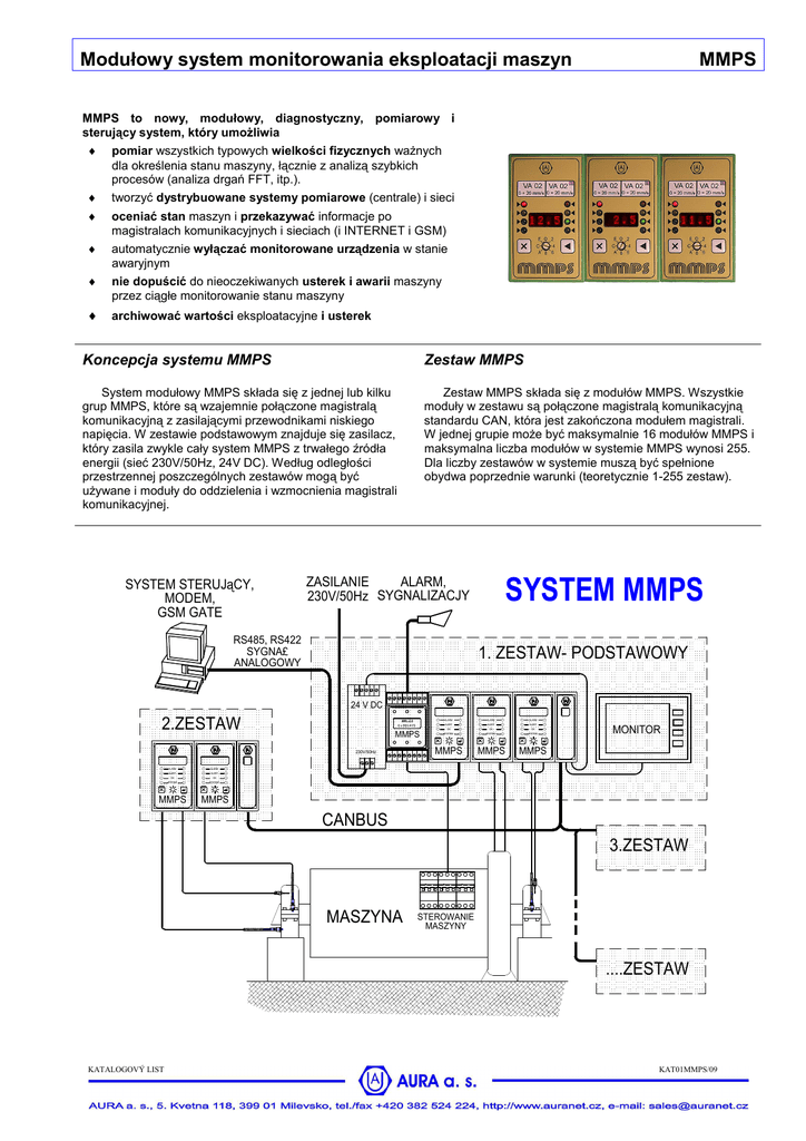 Modułowy system monitorowania eksploatacji maszyn MMPS MMPS to nowy, modułowy, diagnostyczny, pomiarowy i sterujący system, który umoŜliwia ♦ ♦ ♦ ♦ pomiar wszystkich typowych wielkości fizycznych waŜnych dla określenia stanu maszyny, łącznie z analizą szybkich procesów (analiza drgań FFT, itp.). tworzyć dystrybuowane systemy pomiarowe (centrale) i sieci oceniać stan maszyn i przekazywać informacje po magistralach komunikacyjnych i sieciach (i INTERNET i GSM) automatycznie wyłączać monitorowane urządzenia w stanie awaryjnym ♦ nie dopuścić do nieoczekiwanych usterek i awarii maszyny przez ciągłe monitorowanie stanu maszyny ♦ archiwować wartości eksploatacyjne i usterek Koncepcja systemu MMPS Zestaw MMPS System modułowy MMPS składa się z jednej lub kilku grup MMPS, które są wzajemnie połączone magistralą komunikacyjną z zasilającymi przewodnikami niskiego napięcia. W zestawie podstawowym znajduje się zasilacz, który zasila zwykle cały system MMPS z trwałego źródła energii (sieć 230V/50Hz, 24V DC). Według odległości przestrzennej poszczególnych zestawów mogą być uŜywane i moduły do oddzielenia i wzmocnienia magistrali komunikacyjnej. Zestaw MMPS składa się z modułów MMPS. Wszystkie moduły w zestawu są połączone magistralą komunikacyjną standardu CAN, która jest zakończona modułem magistrali. W jednej grupie moŜe być maksymalnie 16 modułów MMPS i maksymalna liczba modułów w systemie MMPS wynosi 255. Dla liczby zestawów w systemie muszą być spełnione obydwa poprzednie warunki (teoretycznie 1-255 zestaw). SYSTEM STERUJąCY, MODEM, GSM GATE ALARM, ZASILANIE 230V/50Hz SYGNALIZACJY RS485, RS422 SYGNA£ ANALOGOWY SYSTEM MMPS 1. ZESTAW- PODSTAWOWY 24 V DC 2.ZESTAW 230V/50Hz ALARM ALARM ALERT ALERT OK OK SYSTEM SYSTEM MMPS MMPS ALARM MRL-2.0 6 x RELAYS ALERT MMPS ALARM ALERT ALARM ALERT OK OK OK SYSTEM SYSTEM SYSTEM MMPS MMPS MMPS MONITOR CANBUS 3.ZESTAW MASZYNA STEROWANIE MASZYNY ....ZESTAW KATALOGOVÝ LIST KAT01MMPS/09 Modułowy system monitorowania eksploatacji maszyn MMPS Moduł MMPS Kanał modułu Podstawowym funkcjonalnym elementem systemu diagnostycznego MMPS jest moduł MMPS w wykonaniu szyny DIN, który moŜe zawierać dwa niezaleŜne kanały. KaŜdy moduł MMPS jest wyposaŜony w procesor, który wykonuje pełne przekazywanie i przetwarzanie informacji z / do kanału w postaci cyfrowej i za pomocą magistrali komunikacyjnej CAN przekazuje te informacje do innych modułów w zestawie. Tym jest kaŜdy moduł MMPS częścią sieci komunikacyjnej i wszystkie informacje przekazywane do / z modułu są tylko w formie cyfrowej. Moduł MMPS ma z przodu panelu wskaźniki stanu modułu lub kanałów i elementy sterujące. Potrzebne moduły z opcjonalnymi typami kanałów są umieszczone według potrzeby obok siebie tworząc tak zwany zestaw lokalny, który moŜe zawierać 16 modułów MMPS. Ta grupa lokalna posiada do dyspozycji 16x2 kanałów i moŜe tworzyć oddzielny monitor eksploatacji maszyny z ilością wejść dla mierzonych wielkości, z analogowymi, przekaźnikowymi lub komunikacyjnymi wyjściami, ewentualnie z podłączeniem panelu operatora do wyświetlania danych i moŜliwości konfiguracji uŜytkownika systemu diagnostycznego. W przypadku systemu z większą ilością zestawów odpada konieczność przeniesienia większej ilości wielkości analogowych lub o stanie po samodzielnych przewodnikach do jednostki centralnej, odpadają tak i komplikacje z trudnym łączeniem i aktywacją systemu. W kaŜdym modułu mogą być w fabryce wbudowane dwa samodzielne kanały w dowolnej kombinacji. W zaleŜności od potrzeby konfiguracji zestawu MMPS moŜe być kaŜdy z dwóch kanałów w fabryce konfigurowany, jako wejściowy, wyjściowy, komunikacyjny lub specjalny. Kanał wejściowy modułu MMPS – mierzy lub w inny sposób przetwarza sygnały z czujników podłączonych do wejścia kanału. Zaciski podłączeniowe czujników są galwanicznie oddzielone od procesora modułu, od magistrali komunikacyjnej i między kanałami wzajemnie. Kanał wyjściowy modułu MMPS z zaleŜności od typu dostarcza analogowe sygnały (prąd 0 (4)-20mA, napięcie 02.5 (10)), oraz informacji o stanie (klasyczny przekaźnik, przekaźnik SSR, tranzystory przełączeniowe). Kanał komunikacyjny modułu MMPS umoŜliwia komunikację MMPS z innymi przemysłowymi magistralami komunikacyjnymi. Obsługiwane są standardy RS232, RS422 i RS485, ze standardowymi protokołami komunikacyjnymi, na zamówienie moŜna utworzyć niestandardowy specjalny protokół. Jeden z typów kanału komunikacji z RS232C słuŜy do podłączenia panelu operatora, inny do podłączenia modemu lub modemu GSM (telefonu komórkowego), następny, jako interfejs Ethernet do połączenia z sieci Intranet / Internet. Kanał specjalny moŜe zawierać kombinację wejść, wyjść i elektronikę do podłączenia niestandardowych urządzeń peryferyjnych. Jednym ze specjalnych kanałów jest kanał zawierający kartę FLASH RAM o duŜej pojemności (kilkadziesiąt MB) wraz z obwodem realnego czasu do stałego archiwizowania informacji mierzonych przez system. Podstawowe dane techniczne Systém MMPS Liczba modułów w systemie: 1-255 Liczba modułów w 1 zestawie 1-16 Liczba zestaw w systemie:: 1-255 230V / 50Hz, 24V DC Zasilanie: Komunikacja w systemie:: Modul MMPS Liczba kanałów: Temperatura eksploatacyjna Ochrona: Wykonanie: CanOpen 2 -25 až 55 °C IP 20 na listwę DIN 35 mm 45.0 107.5 Obudowa, uporządkowanie zestawu: przemysłowa, metalowa lub w tablicy rozdzielczej odbiorcy 75.0 Zestaw modułów MoŜliwości wejścia i wyjścia systemu Kanały wejściowe Kanały wyjściowe ♦ UIx,IIx,RIx – napięcie, prąd, opór (z czujników z normalizowanym wyjściem) ♦ UOx – nap. wyjście 0 - 1V (0 - 10V) ♦ VAx,VRx – wibracje absolutne, relatywne ♦ REx – wyjścia przekaźnikowe ♦ LAx - stan zuŜycia łoŜysk ♦ TPx,TTx – temperatury (Pt termometry, termoele