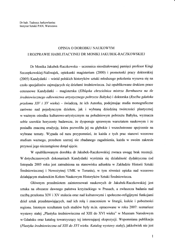 Dr hab. Tadeusz Jurkowlanięc Inst).tut Sztuki PAN, Warszawa OPINIA O DOROBKU NAUKOWYM I ROZPRAWIE HABILITACYJNEJ DR MONIKI JAKUBEK-RACZKOWSKIEJ Dr Monika Jakubek-Raczkowska - uczennica nieodŻałowanej pamięci profesor Kingi Szczepkowskiej-Naliwajek, opiekunki magisterium (2000) i promotorki pracy doktorskiej (2005) Kandydatki _ wśród polskich historyków sztuki młodszego pokolenia wysuwa się na czoŁo specjalistów zajmujących się dziełami Średniowiecza. Już opublikowane drukiem prace cenzusowe Kandydatki - magisterska (Elblqska chrzcielnica mistrza Bernhusera na tle średniowiecznego odlewnictwa artystycznego pobrzeża Bałtyku) i doktorska (Rzeźba gdańska przełomu XIV i W wieku) - świadczą, Że ich Autorka, podejmując studia monogtaficzne zarówno nad pojedynczym dziełem, jak i wybraną dziedziną twórczości plastycznej w ważnym ośrodku kulturowo-artystycznym na pofudniowym pobrzeżu Bahyku, Wznacza sobie szerokie horyzonty badawczeo Że dysponuje Sprawnym warsztatem naukowym i ze posiadła znaczną erudycję, która pozwoliła jej na głębokie i wszechstronne spojrzenie na wybrane tematy. Wypada od razu przypomnieć, Że kuŻda z tych prac stanowi wzorowe studium ważnego, przedtem szerzej nie zbadanego zagadnienia, ktŻda w swoim zakresie przynosi jego niezastąpione dotąd ujęcie. W opublikowanym dorobku dr Jakubek_Raczkowskiej zwraca uwagę brak recenzji. W dotychczasowych dokonaniach Kandydatki wyróżnia się działalnośódydaktyczna (od listopada 2005 roku jest zatrudniona na stanowisku adiunkta w Za|<ładzie Historii Sztuki Średniowiecznej i Nowoż1tnej UMK w Toruniu), w tym również opieka nad wzorowo dziaŁającym studenckim Kołem Naukowym Historyków Sztuki Średniowiecza. Głównym przedmiotem zainteresowań naukowych dr Jakubęk-Raczkowskiej jest sztuka na obszarze dawnego państwa k'rzyŻackiego w Prusach' a zwłaszcza badania nad rzeŹbą przełomu XIV i XV stulecia otaz nad kulturovvymi i społeczno-religijnymi funkcjami dzieł sztuk przedstawiających, nad ich rolą i znaczentęm w liturgii, kulcię i pobozności regionu. Istotnym rezultatem tych studiów były m.in. opracowane w roku 2007 scenariusz wystawy stałej ,,Plastyka średniowieczna od XIil do XVI wieku'' w Muzeum Narodowym w Gdansku oraz katalog towarzyszący tej interesującej ekspozycji. Wspomniana publikacja (PlasĘka średniowieczna od XIII do WI wieku- Katalog wystawy stałej),jakkolwiek nie jest klasycznym katalogiem muzealnej kolekcji dzieł, obejmującym caŁy zbior rzeźby średniowiecznej zgromadzony w gdańskim muzeum, to stanowi nie tylko pozycję docenianą z perspektywy badan nad rzeżbą drewnianą w Prusach, na obszarach państwa zakonu krzyżackiego lecz takŻe poważny wkład do wciąż niezadowalającego stanu opracowania zasobów sztuki średniowiecznej w muzeach krajowych (tak Świeckich' jak i kościelnych). z tematyką swej pracy magisterskiej interesujące artykuły _ Xlll-wieczna chrzcielnica z Kaplicy Monika Jakubek-Raczkowska opublikowała m.in. dwa w związku Kopernika |w:] Dzieje i skarby kościołaświętojańskiego w Toruniu. Materiały z konferencji ...,2002, s.237-255; Gotycki świecznik z bazyliki Mariackiej w Kołobrzegu. Nowe spojrzenie na warsztat mistrza Jana Apengetera fw:] odlewnictwo w Polsce. Materiały z VII Sesji'.., 20a7, s. 91-106. Również wyrriki poszerzonych badań nadrzeźbą schyłku XIv ipierwszych dziesięcioleci XV stulecia, zapoczątkowane dysertacją Kandydatki, zostały zaprezentowane na kilku sesjach naukowych w kraju i za granicą, a następnie opublikowane (m.in.: Czeskie filiacje w rzeźbie gdańskiej na przełomie XIV i W wieku, [w:] Materiały pokonferencyjne sesji 2005, s. 96-118; Die ,,SchÓnen Madonnen" aLłf dem Gebiet des ehemaligen Deutschordensstaates Preussen * ein Beitrag um Problem der ktinstlerischen Trądition im spc)ten Mittelalter [*'] Terrą Sąnctae Mariae' Mittelalterliche Bildwerke der Marienverehrung im Deutschordensland Preussen ..., 2009, s. 227-254; Die Einflilsse BÓhmens auf die gotische Skulptur im ordensland Preufien * ein Uberblick im Lichte der neusten Forschungen, [w:] Kunst als Herrschaftsinstrument. BÓhmen und das Heilige RÓmische Reich unter den Luxemburgern im europciischen Kontext ..., Ża09, s. 550-563). W tych i w innych studiach (m'in. licznych hasłach katalogów kilku wystaw) zwraca uwagę dbałośćAutorki o ustalenie stopnia autentyzmu badanych dzieł ipoznanie zachodzących w nich przemian. Dr Jakubek_Raczkowska uprawia historię sztuki solidnię opartą na kry'tyce stanu materialnego dzieła sńuki, ca naleŻy do podstawowych wymogów dyscypliny. Jednakze dotychczasowe wysiłki zmierzĄące do wyjaśnienia zŁoŻonej problematyki tzw. Pięknych Madonn - przy wykorzystaniu tradycyjnych metody historii sztuki _ nie przynoszą zadawalĄących rezultatów, dlatego tez Kandydatka podejmuje spojrzenia na dzieła stylu międzynarodowego z w ostatnich latach innej perspektywy. Z proby pasją analizuje przesłanki socjologiczne i psychologiczne, głęboko rozvłuŻa szeroko pojmowane dzleje Kościoła,ze szczególnym uwzględnieniem modeli poboznościw życiu religijnym przełomie XIV i XV stulecia (np. Uwagi o znaczeniu tnł. Pięknych Madonn w sztuce i religijności państwa zakonnego Zabytkoznawstwo i na w Prusach, ,,Acta Universitatis Nicolai Copernici'', Konserwatorstwo 40,20II, s. 39-94; Pięlłta Madonna' obraz i wiara w średniowiecznym ToruniLt, |w:f opus temporis. Toruńskiej katedry historia najnowszt -.., 2aI3, s.259-Ż68)' Bęz wątpienia szerokie spojrzenie na procesy artystyczne i funkcje dzieł w średniowieczu, a takŻe umiejętność dostrzegania najistotniejszych problemów badawczych w studiach nad sztuką tego okresu skłoniłydr Jakubek-Raczkowską do rozwazań relacji - obraz * wierny'', przy dosyć ryzykownym założeniu, Że zawsze (?) zachodził ''KoŚciół wybór treścii formy, dokonywany przez zlęceniodawcę dzieła lub gospodarza ',Świadomy przestrz