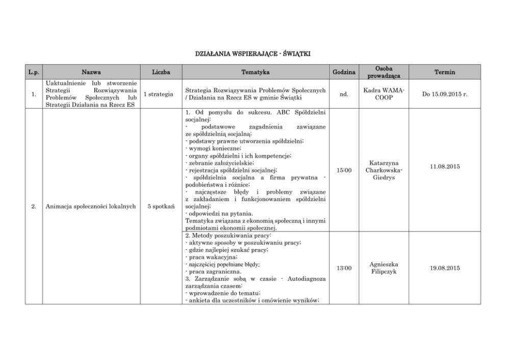 DZIAŁANIA WSPIERAJĄCE - ŚWIĄTKI L.p. Nazwa 1. Uaktualnienie lub stworzenie Strategii Rozwiązywania Problemów Społecznych lub Strategii Działania na Rzecz ES 2. Animacja społeczności lokalnych Tematyka Godzina Osoba prowadząca Termin 1 strategia Strategia Rozwiązywania Problemów Społecznych / Działania na Rzecz ES w gminie Świątki nd. Kadra WAMACOOP Do 15.09.2015 r. 15:00 Katarzyna CharkowskaGiedrys 5 spotkań 1. Od pomysłu do sukcesu. ABC Spółdzielni socjalnej: podstawowe zagadnienia zawiązane ze spółdzielnią socjalną; - podstawy prawne utworzenia spółdzielni; - wymogi konieczne; - organy spółdzielni i ich kompetencje; - zebranie założycielskie; - rejestracja spółdzielni socjalnej; - spółdzielnia socjalna a firma prywatna podobieństwa i różnice; - najczęstsze błędy i problemy związane z zakładaniem i funkcjonowaniem spółdzielni socjalnej; - odpowiedzi na pytania. Tematyka związana z ekonomią społeczną i innymi podmiotami ekonomii społecznej. 2. Metody poszukiwania pracy: - aktywne sposoby w poszukiwaniu pracy; - gdzie najlepiej szukać pracy; - praca wakacyjna; - najczęściej popełniane błędy; - praca zagraniczna. 3. Zarządzanie sobą w czasie - Autodiagnoza zarządzania czasem: - wprowadzenie do tematu; - ankieta dla uczestników i omówienie wyników; 13:00 Agnieszka Filipczyk Liczba 11.08.2015 19.08.2015 - sporządzanie budżetu czasu – na co zużywamy nasz czas? - diagnozowanie tzw. złodziei czasu; - sposoby radzenia sobie z największymi złodziejami czasu; - złote reguły zarządzania sobą w czasie. 4. Zarządzanie sobą w czasie - c.d.: Proces wytyczania celów i priorytetów: - definiowanie celów – warunki poprawnego sformułowania celu, pisemne ustalanie celów; - wyznaczenie celów i planowanie – na co należy zwracać uwagę przy formułowaniu swoich celów, jak skonstruować cel, by zwiększyć szanse na jego realizację (zasada SMART); - zarządzanie priorytetami – zasada WARTO 60/20/20, cele krótko- i długoterminowe). 5. Zarządzanie sobą w czasie - Zasady zarządzania priorytetami i techniki ustalania ważności zadań: - Diagram Eisenhowera – podział zadań na pilne, niepilne, ważne i nieważne; - Zarządzanie priorytetami – zasada Pareto w skutecznym zarządzaniu czasem; Metoda Salami, czyli szczegółowość w wyznaczaniu zadań. 11:00 Agnieszka Filipczyk 20.08.2015 Agnieszka Filipczyk 6. Autoprezentacja: - mowa werbalna; - mowa niewerbalna; - dress code; - ćwiczenia. 13:00 7. Rozmowa kwalifikacyjna: - co ze sobą zabrać?; - jak się prezentować?; - pierwsze wrażenie; - pytania trudne na rozmowie; - najczęściej popełniane błędy. 11:00 Katarzyna CharkowskaGiedrys Agnieszka Filipczyk Katarzyna CharkowskaGiedrys 26.08.2015 27.08.2015 3. 4. 5. 6. Warsztaty aktywizujące społeczności lokalne, w ramach rewitalizacji obszarów wiejskich Utworzenie Grupy Roboczej ds. działania na rzecz ES w gminach objętych wsparciem, w ramach aktywizacji obszarów wiejskich Diagnoza środowiska lokalnego wybranych miejscowości wiejskich Przeprowadzenie badań ankietowych w wybranych miejscowościach wiejskich 3 warsztaty x 10 osób 1. Udział społeczności w diagnozie potrzeb i rozwoju lokalnym: - zadatki miejscowości; - problemy występujące w miejscowości; - sposoby ich rozwiązywania - realne powodzenie; - analiza SWOT. 2. Od pomysłu do projektu. Jak pisać wnioski o dofinansowanie z funduszy europejskich i innych: - pomysł; - jak myśleć projektowo; - jak formułować cele i zadania; - grupa docelowa; - uzasadnienie projektu; - koszty i niezbędne wydatki - jak je planować i przewidywać?; - warsztaty na przykładzie wniosku do FIO. 3. Metody pisania projektów na przykładzie wybranych konkursów i grantów. 11:00 Paweł Strączek 31.08.2015 13:00 Paweł Strączek 02.09.2015 11:00 Paweł Strączek 03.09.2015 Kadra WAMACOOP Grupa robocza powstanie przy UG Świątki. Skład grupy określony zostanie w trakcie spotkań, po ustaleniu z przedstawicielami danej gminy. nd. gmina Świątki Diagnoza zostanie przeprowadzona na podstawie badań ankietowych oraz danych zastanych. nd. 200 ankiet Ankiety dotyczyć będą sytuacji społecznozawodowej mieszkańców z miejscowości Światki. Ankiety będą zbierane głównie podczas prowadzonych spotkań animacyjnych i warsztatów aktywizujących z mieszkańcami. nd. 1 grupa Przedstawiciele gminy Katarzyna CharkowskaGiedrys Opracowanie: Katarzyna CharkowskaGiedrys; Realizacja: Katarzyna CharkowskaGiedrys Spotkania od 20 sierpnia 2015 r. Od sierpnia 2015 r. Od lipca 2015 r.: Świątki – 200 ankiet 7. Opracowanie raportu z badania ankietowego wraz z rekomendacjami 1 raport Raport zostanie opracowany na podstawie przeprowadzonych badań ankietowych, do których zostaną opracowane rekomendacje. nd. 8. Konsultacje społeczne PES z JST – dialog obywatelski 3 spotkania Spotkania mają na celu konsultacje społeczne dotyczące opracowanej/uaktualnionej Strategii – JST z mieszkańcami i przedstawicielami NGO’s. nd. Katarzyna CharkowskaGiedrys Kadra WAMACOOP Przedstawiciele gminy Po realizacji badań ankietowych – sierpień 2015 r. Spotkania planowane na wrzesień 2015 r. UWAGA!!! Jeżeli będzie potrzeba rozszerzenia tematyki ekonomii społecznej na poszczególnych spotkaniach lub warsztatach, zapraszamy do zadawania pytań. Konsultanci i doradcy są przygotowani do udzielenia wszelkich niezbędnych informacji nt. funkcjonowania PES, szczególnie spółdzielni socjalnych, stowarzyszeń oraz fundacji.