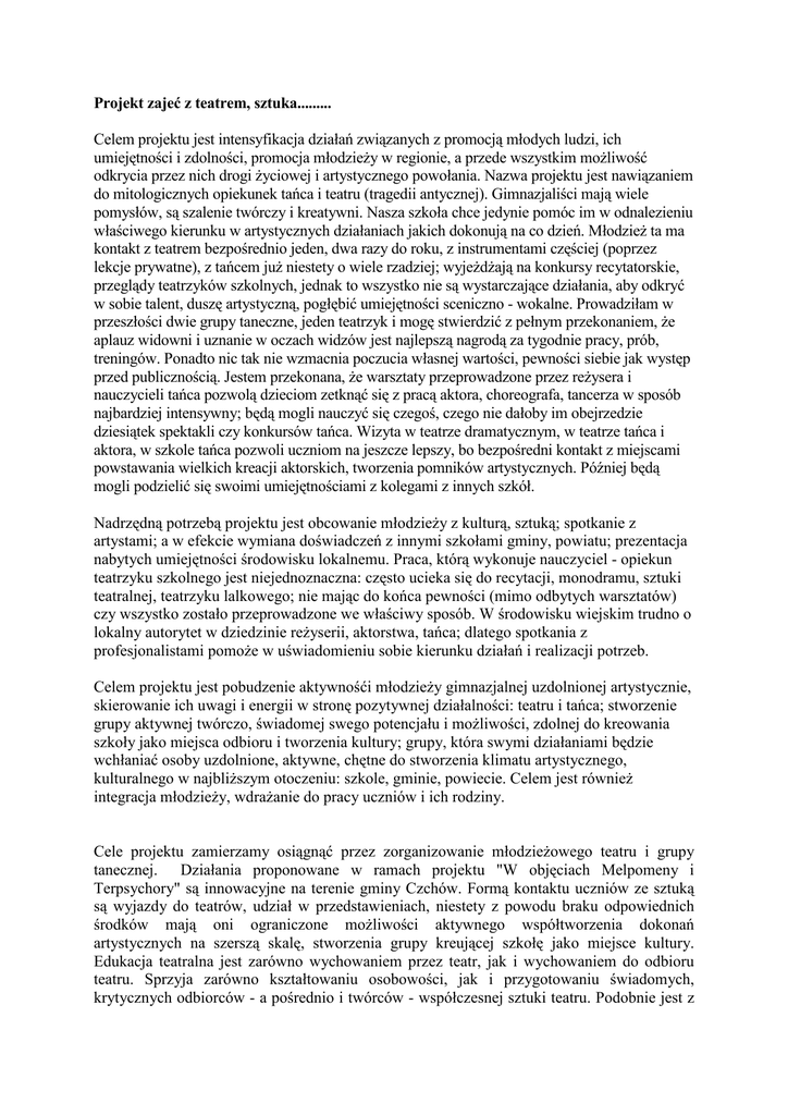 Projekt zajeć z teatrem, sztuka......... Celem projektu jest intensyfikacja działań związanych z promocją młodych ludzi, ich umiejętności i zdolności, promocja młodzieży w regionie, a przede wszystkim możliwość odkrycia przez nich drogi życiowej i artystycznego powołania. Nazwa projektu jest nawiązaniem do mitologicznych opiekunek tańca i teatru (tragedii antycznej). Gimnazjaliści mają wiele pomysłów, są szalenie twórczy i kreatywni. Nasza szkoła chce jedynie pomóc im w odnalezieniu właściwego kierunku w artystycznych działaniach jakich dokonują na co dzień. Młodzież ta ma kontakt z teatrem bezpośrednio jeden, dwa razy do roku, z instrumentami częściej (poprzez lekcje prywatne), z tańcem już niestety o wiele rzadziej; wyjeżdżają na konkursy recytatorskie, przeglądy teatrzyków szkolnych, jednak to wszystko nie są wystarczające działania, aby odkryć w sobie talent, duszę artystyczną, pogłębić umiejętności sceniczno - wokalne. Prowadziłam w przeszłości dwie grupy taneczne, jeden teatrzyk i mogę stwierdzić z pełnym przekonaniem, że aplauz widowni i uznanie w oczach widzów jest najlepszą nagrodą za tygodnie pracy, prób, treningów. Ponadto nic tak nie wzmacnia poczucia własnej wartości, pewności siebie jak występ przed publicznością. Jestem przekonana, że warsztaty przeprowadzone przez reżysera i nauczycieli tańca pozwolą dzieciom zetknąć się z pracą aktora, choreografa, tancerza w sposób najbardziej intensywny; będą mogli nauczyć się czegoś, czego nie dałoby im obejrzedzie dziesiątek spektakli czy konkursów tańca. Wizyta w teatrze dramatycznym, w teatrze tańca i aktora, w szkole tańca pozwoli uczniom na jeszcze lepszy, bo bezpośredni kontakt z miejscami powstawania wielkich kreacji aktorskich, tworzenia pomników artystycznych. Później będą mogli podzielić się swoimi umiejętnościami z kolegami z innych szkół. Nadrzędną potrzebą projektu jest obcowanie młodzieży z kulturą, sztuką; spotkanie z artystami; a w efekcie wymiana doświadczeń z innymi szkołami gminy, powiatu; prezentacja nabytych umiejętności środowisku lokalnemu. Praca, którą wykonuje nauczyciel - opiekun teatrzyku szkolnego jest niejednoznaczna: często ucieka się do recytacji, monodramu, sztuki teatralnej, teatrzyku lalkowego; nie mając do końca pewności (mimo odbytych warsztatów) czy wszystko zostało przeprowadzone we właściwy sposób. W środowisku wiejskim trudno o lokalny autorytet w dziedzinie reżyserii, aktorstwa, tańca; dlatego spotkania z profesjonalistami pomoże w uświadomieniu sobie kierunku działań i realizacji potrzeb. Celem projektu jest pobudzenie aktywnośći młodzieży gimnazjalnej uzdolnionej artystycznie, skierowanie ich uwagi i energii w stronę pozytywnej działalności: teatru i tańca; stworzenie grupy aktywnej twórczo, świadomej swego potencjału i możliwości, zdolnej do kreowania szkoły jako miejsca odbioru i tworzenia kultury; grupy, która swymi działaniami będzie wchłaniać osoby uzdolnione, aktywne, chętne do stworzenia klimatu artystycznego, kulturalnego w najbliższym otoczeniu: szkole, gminie, powiecie. Celem jest również integracja młodzieży, wdrażanie do pracy uczniów i ich rodziny. Cele projektu zamierzamy osiągnąć przez zorganizowanie młodzieżowego teatru i grupy tanecznej. Działania proponowane w ramach projektu "W objęciach Melpomeny i Terpsychory" są innowacyjne na terenie gminy Czchów. Formą kontaktu uczniów ze sztuką są wyjazdy do teatrów, udział w przedstawieniach, niestety z powodu braku odpowiednich środków mają oni ograniczone możliwości aktywnego współtworzenia dokonań artystycznych na szerszą skalę, stworzenia grupy kreującej szkołę jako miejsce kultury. Edukacja teatralna jest zarówno wychowaniem przez teatr, jak i wychowaniem do odbioru teatru. Sprzyja zarówno kształtowaniu osobowości, jak i przygotowaniu świadomych, krytycznych odbiorców - a pośrednio i twórców - współczesnej sztuki teatru. Podobnie jest z edukacją poprzez taniec, która m. in. pozwala na kształcenie słuchu, ćwiczenia koordynacji ruchowej, korygowanie ruchem wad postawy. Różnorodność działań zaproponowana w projekcie pozwoli na poprawę jakości nauczania, w jeszcze większym stopniu rozwinie wrażliwość artystyczną, udoskonali umiejętności pracy w zespole, nawiązywanie kontaktów interpersonalnych, podniesie poziom wiedzy i świadomości artystycznej uczniów; sprawi, iż młodzież własną postawą zachęci kolegów i koleżanki z innych szkół do aktywnego uczestnictwa w ubogacaniu dorobku swojej małej ojczyzny: szkoły, gminy, powiatu.Poprzez edukację teatralno - taneczną odkryją znaczenie sztuki w życiu młodego człowieka. Przez praktyczne, nowoczesne metody działania w sposób skuteczny poznają, jak stać się uczestnikiem kultury i jak tworzyć jej teksty. Oferta edukacyjna w ramach projektu obejmuje działania, które wykraczają poza obowiązujące standardy. Dzięki pomocy wielu instytucji, organizacji i osób realizacja działań będzie przebiegać w sposób innowacyjny, twórczy, kreatywny. W ramach projektu zostaną podjęte następujące działania: 1. Wyjazdy do teatrów i działania związane z edukacją teatralną. a) Działanie cykliczne zapoczątkowane wizytą w Teatrze im. Juliusza Słowackiego w Krakowie. Obejrzenie sztuki teatralnej, zwrócenie uwagi na wiele dziedzin sztuki, które spotykają się na scenie teatralnej; na żywe tworzywo, jakim jest gra aktorska, gest, język, słowo, mimika, postawa, itp. b) Spotkanie z aktorem w Piwnicy pod Baranami (podczas wyjazdu do teatru im. Juliusza Słowackiego), miejscem, które jest symbolem sztuki i kultury w Krakowie. Rozmowa z aktorem na temat warsztatu aktorskiego, specyfiki pracy w teatrze, filmie, jak odnaleźć w sobie zainteresowania sztuką, teatrem, jak je rozwijać, pogłębiać. c) Wyjazd do Teatru im. Ludwika Solskiego w Tarnowi