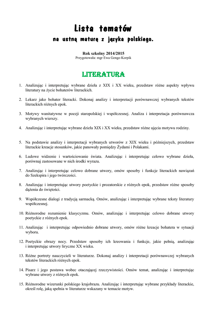Lista tematów na ustną maturę z języka polskiego. Rok szkolny 2014/2015 Przygotowała: mgr Ewa Genge-Korpik LITERATURA 1. Analizując i interpretując wybrane dzieła z XIX i XX wieku, przedstaw różne aspekty wpływu literatury na życie bohaterów literackich. 2. Lekarz jako bohater literacki. Dokonaj analizy i interpretacji porównawczej wybranych tekstów literackich różnych epok. 3. Motywy wanitatywne w poezji staropolskiej i współczesnej. Analiza i interpretacja porównawcza wybranych wierszy. 4. Analizując i interpretując wybrane dzieła XIX i XX wieku, przedstaw różne ujęcia motywu rodziny. 5. Na podstawie analizy i interpretacji wybranych utworów z XIX wieku i późniejszych, przedstaw literackie kreacje stosunków, jakie panowały pomiędzy Żydami i Polakami. 6. Ludowe widzenie i wartościowanie świata. Analizując i interpretując celowo wybrane dzieła, porównaj zastosowane w nich środki wyrazu. 7. Analizując i interpretując celowo dobrane utwory, omów sposoby i funkcje literackich nawiązań do Szekspira i jego twórczości. 8. Analizując i interpretując utwory poetyckie i prozatorskie z różnych epok, przedstaw różne sposoby dążenia do świętości. 9. Współczesne dialogi z tradycją sarmacką. Omów, analizując i interpretując wybrane teksty literatury współczesnej. 10. Różnorodne rozumienie klasycyzmu. Omów, analizując i interpretując celowo dobrane utwory poetyckie z różnych epok. 11. Analizując i interpretując odpowiednio dobrane utwory, omów różne kreacje bohatera w sytuacji wyboru. 12. Poetyckie obrazy nocy. Przedstaw sposoby ich kreowania i funkcje, jakie pełnią, analizując i interpretując utwory liryczne XX wieku. 13. Różne portrety nauczycieli w literaturze. Dokonaj analizy i interpretacji porównawczej wybranych tekstów literackich różnych epok. 14. Pisarz i jego postawa wobec otaczającej rzeczywistości. Omów temat, analizując i interpretując wybrane utwory z różnych epok. 15. Różnorodne wizerunki polskiego krajobrazu. Analizując i interpretując wybrane przykłady literackie, określ rolę, jaką spełnia w literaturze wskazany w temacie motyw. 16. Męka Chrystusa. Odwołując się do analizy i interpretacji wybranych utworów z różnych epok, przedstaw sposób prezentowania tego motywu w literaturze. 17. Analizując i interpretując celowo dobrane utwory, omów sposoby i funkcje literackich nawiązań do filozofii. 18. Literackie wizerunki małżeństw. Omów temat, analizując i interpretując wybrane utwory z różnych epok. 19. Mity greckie jako źródło inspiracji artystów. Przedstaw zagadnienie na wybranych przykładach literackich i plastycznych XX w. 20. Powroty do dzieciństwa w literaturze XIX wieku i późniejszej. Analizując i interpretując wybrane przykłady literackie, określ rolę, jaką spełnia w literaturze wskazany w temacie motyw. 21. Pieniądz jako motyw w twórczości wielkich prozaików. Omów temat, analizując i interpretując wybrane dzieła literackie. 22. Postacie biblijne w literaturze XX wieku. Na podstawie analizy i interpretacji wybranych utworów przedstaw sposoby kreowania postaci i funkcje, jakie pełnią. 23. Literackie kreacje świata marzeń i świata rzeczywistego oraz ich wzajemnych relacji. Omów, analizując i interpretując odpowiednio dobrane teksty z różnych epok. 24. Rola autobiografii w utworach „poetów przeklętych” XX wieku. Omów, analizując i interpretując wybrane utwory poetyckie. 25. Przeprowadź analizę porównawczą odpowiednio dobranych współczesnych wierszy religijnych dotyczących relacji pomiędzy Bogiem a człowiekiem. 26. Analizując i interpretując odpowiednio dobrane utwory, przedstaw różne poetyckie próby opisania rzeczywistości. 27. Na podstawie analizy i interpretacji wybranych utworów powstałych w XX wieku, omów funkcjonowanie wzorca romantycznego w polskiej literaturze. 28. Współczesne reinterpretacje mitów antycznych. Omów sposoby i cele tego zjawiska, analizując i interpretując wybrane utwory literackie. ZWIĄZKI LITERATURY Z INNYMI DZIEDZINAMI SZTUKI 1. Analizując i interpretując celowo wybrane utwory literackie i muzyczne, przedstaw, w jaki sposób wykorzystywano w sztuce formę kołysanki. 2. Porównaj różne realizacje motywu zaświatów, analizując wybrane dzieła literackie i malarskie różnych epok. 3. Przedstaw literackie i malarskie obrazy śmierci, odwołując się do analizy i interpretacji wybranych tekstów kultury. 4. Porównaj różne sposoby kreowania postaci buntownika, analizując i interpretując wybrane dzieła literackie i filmowe. 5. Motyw wody w literaturze i innych dziedzinach sztuki. Omów sposób jego ujęcia i pełnione funkcje, analizując i interpretując odpowiednio dobrane teksty kultury. 6. Różne postawy wobec Holocaustu. Omów na podstawie analizy i interpretacji celowo dobranych tekstów kultury. 7. Wizerunki ojca. Przedstaw sposoby kreowania i funkcje motywu na podstawie analizy i interpretacji wybranych tekstów kultury. 8. Porównaj różne wizerunki mężczyzny w literaturze i innych dziedzinach sztuki, analizując i interpretując odpowiednio dobrane teksty kultury. 9. Dzieła malarskie jako inspiracja dla literatury. Omów różne sposoby i funkcje nawiązywania do malarstwa, analizując celowo dobrane teksty kultury. 10. Różne ujęcia motywu księdza. Omów na podstawie analizy i interpretacji wybranych tekstów kultury. 11. Symbol jako sposób wyrażania rzeczywistości w literaturze i innych dziedzinach sztuki. Omów, analizując i interpretując odpowiednio dobrane teksty kultury. 12. Porównaj różne realizacje motywu strachu, analizując wybrane dzieła literackie i malarskie różnych epok. 13. Fascynacja górami w sztuce. Omów, odwołując się do analizy i interpretacji wybranych tekstów kultury. 14. Motyw snu w literaturze i innych dziedzinach sztuki. Omów sposób jego ujęcia i pełnione funkcje, analizując i interpretując odpowiedni