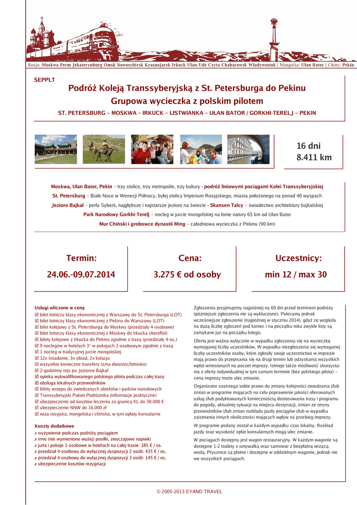 SEPPLT Podróż Koleją Transsyberyjską z St. Petersburga do Pekinu Grupowa wycieczka z polskim pilotem ST. PETERSBURG – MOSKWA – IRKUCK – LISTWIANKA – UŁAN BATOR / GORKHI-TERELJ – PEKIN 16 dni 8.411 km Moskwa, Ułan Bator, Pekin – trzy stolice, trzy metropolie, trzy kultury · podróż liniowymi pociągami Kolei Transsyberyjskiej St. Petersburg – Białe Noce w Wenecji Północy, byłej stolicy Imperium Rosyjskiego, miasta położonego na ponad 40 wyspach Jezioro Bajkał – perła Syberii, najgłębsze i najstarsze jezioro na świecie · Skansen Talcy – świadectwo architektury bajkalskiej Park Narodowy Gorkhi-Terelj – nocleg w jurcie mongolskiej na łonie natury 65 km od Ułan Bator Mur Chiński i grobowce dynastii Ming – całodniowa wycieczka z Pekinu (90 km) Termin: 24.06.-09.07.2014 Cena: 3.275 € od osoby Usługi wliczone w cenę ☑ bilet lotniczy klasy ekonomicznej z Warszawy do St. Petersburga (LOT) ☑ bilet lotniczy klasy ekonomicznej z Pekinu do Warszawy (LOT) ☑ bilet kolejowy z St. Petersburga do Moskwy (przedziały 4-osobowe) ☑ bilet lotniczy klasy ekonomicznej z Moskwy do Irkucka (Aeroflot) ☑ bilety kolejowe z Irkucka do Pekinu zgodnie z trasą (przedziały 4-os.) ☑ 9 noclegów w hotelach 3* w pokojach 2-osobowym zgodnie z trasą ☑ 1 nocleg w tradycyjnej jurcie mongolskiej ☑ 12x śniadanie, 3x obiad, 2x kolacja ☑ wszystkie konieczne transfery (z/na dworzec/lotnisko) ☑ 2-godzinny rejs po Jeziorze Bajkał ☑ opieka wykwalifikowanego polskiego pilota podczas całej trasy ☑ obsługa lokalnych przewodników ☑ bilety wstępu do zwiedzanych obiektów i parków narodowych ☑ Transsyberyjski Pakiet Podróżnika (informacje praktyczne) ☑ ubezpieczenie od kosztów leczenia za granicą KL do 30.000 € ☑ ubezpieczenie NNW do 16.000 zł ☑ wiza rosyjska, mongolska i chińska, w tym opłaty konsularne Koszty dodatkowe ✗ wyżywienie podczas podróży pociągiem ✗ inne (nie wymienione wyżej) posiłki, zwyczajowe napiwki ✗ jurta i pokoje 1-osobowe w hotelach na całej trasie: 385 € / os. ✗ przedział 4-osobowy do wyłącznej dyspozycji 2 osób: 435 € / os. ✗ przedział 4-osobowy do wyłącznej dyspozycji 3 osób: 145 € / os. ✗ ubezpieczenie kosztów rezygnacji Uczestnicy: min 12 / max 30 Zgłoszenia przyjmujemy najpóźniej na 60 dni przed terminem podróży (późniejsze zgłoszenia nie są wykluczone). Polecamy jednak wcześniejsze zgłoszenie (najpóźniej w styczniu 2014), gdyż ze względu na dużą liczbę zgłoszeń pod koniec i na początku roku zwykle listy są zamykane już na początku lutego. Oferta jest ważna wyłącznie w wypadku zgłoszenia się na wycieczkę wymaganej liczby uczestników. W wypadku niezgłoszenia się wymaganej liczby uczestników osoby, które zgłosiły swoje uczestnictwo w imprezie mają prawo do przepisania się na drugi termin lub odzyskania wszystkich wpłat wniesionych na poczet imprezy. Istnieje także możliwość skorzystania z oferty indywidualnej w tym samym terminie (bez polskiego pilota) – cena imprezy może ulec zmianie. Organizator zastrzega sobie prawo do zmiany kolejności zwiedzania i/lub zmian w programie mających na celu poprawienie jakości oferowanych usług i/lub podyktowanych koniecznością dostosowania trasy i programu do pogody, aktualnej sytuacji na miejscu destynacji, zmian ze strony przewoźników i/lub zmian rozkładu jazdy pociągów i/lub w wypadku zaistnienia innych okoliczności mających wpływ na przebieg imprezy. W programie podany został w każdym wypadku czas lokalny. Rozkład jazdy oraz wysokość opłat konsularnych mogą ulec zmianie. W pociągach dostępny jest wagon restauracyjny. W każdym wagonie są dostępne 1-2 toalety z umywalką oraz samowar z bezpłatną wrzącą wodą. Prysznice są płatne i dostępne w oddzielnym wagonie, jednak nie we wszystkich pociągach. © 2005-2013 EYAND TRAVEL Zapraszamy Państwa na wycieczkę liniowymi pociągami Kolei Transsyberyjskiej do Pekinu. Zastąpienie przejazdu pociągiem lotem na trasie Moskwa Irkuck pozwoliło na rozszerzenie programu o Białe Noce w St. Petersburgu. Ta zmiana nie powoduje utraty walorów przejazdu Koleją Transsyberyjską, gdyż przejazd koleją następuje na najciekawszym i najbardziej urozmaiconym krajobrazowo odcinku trasy pomiędzy Irkuckiem a Pekinem. Trasa prowadzi zatem około 200 km wzdłuż Jeziora Bajkał, następnie przez piękną i ciekawą rosyjską Republikę Buriacji i niemalże niezaludnione mongolskie stepy. Podczas całej trasy towarzyszy Państwu wykwalifikowany polski pilot. W programie przewidziane są ponadto: całodniowa wycieczka, podczas której zobaczą Państwo jeden z najlepiej zachowanych odcinków słynnego Muru Chińskiego, 2-godzinny rejs po Jeziorze Bajkał oraz wycieczka poza St. Petersburg do Peterhofu – słynnego zespołu pałacowo-ogrodowego ozdobionego 64 fontannami i 142 wodotryskami. W pociągu będzie okazja do zawarcia nowych ciekawych znajomości, zapoznania się z inną kulturą i zrobienia pięknych zdjęć. Na peronach stacji pośrednich będą Państwo mieli okazję spróbowania świeżych regionalnych przysmaków. Podczas podróży przewidziane są postoje w wybranych ciekawych miejscowościach na trasie: Moskwie, Irkucku i Ułan Bator oraz pobyt na łonie natury – nad Jeziorem Bajkał w miejscowości Listwianka i w mongolskim Parku Narodowym Terelj połączony z noclegiem w tradycyjnej jurcie mongolskiej. W Listwiance będzie możliwość skosztowania bajkalskiego specjału – wędzonej ryby omul i skorzystania z tradycyjnej sauny rosyjskiej – banji. Przebieg trasy St. Petersburg (1) 24.06. Rano zbiórka na lotnisku w Warszawie i lot do St. Petersburga. Transfer z lotniska do hotelu. Zakwaterowanie, kolacja i nocleg. (2) 25.06. Zwiedzanie miasta: w programie przewidziane jest zwiedzanie Twierdzy Pietropawłowskiej oraz rejs kanałami, podczas którego przekonają się Państwo o urokach St. Petersburga określanego miane