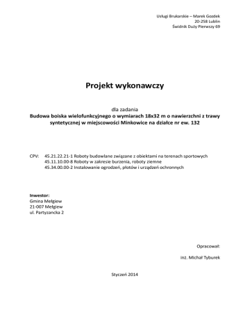 Usługi Brukarskie – Marek Gozdek 20-258 Lublin Świdnik Duży Pierwszy 69 Projekt wykonawczy dla zadania Budowa boiska wielofunkcyjnego o wymiarach 18x32 m o nawierzchni z trawy syntetycznej w miejscowości Minkowice na działce nr ew. 132 CPV: 45.21.22.21-1 Roboty budowlane związane z obiektami na terenach sportowych 45.11.10.00-8 Roboty w zakresie burzenia, roboty ziemne 45.34.00.00-2 Instalowanie ogrodzeń, płotów i urządzeń ochronnych Inwestor: Gmina Mełgiew 21-007 Mełgiew ul. Partyzancka 2 Opracował: inż. Michał Tyburek Styczeń 2014 Zawartość opracowania: I. Opis techniczny II. Część rysunkowa: - Plan orientacyjny - Plan sytuacyjny skala 1:100 - Piłkochwyty - Ogrodzenie - Chodnik - Boisko – przekrój normalny I. Opis techniczny 1. Przedmiot inwestycji Przedmiotem inwestycji jest budowa boiska wielofunkcyjnego wraz z infrastrukturą towarzyszącą w miejscowości Minkowice na działce Nr ew. 132. Zaprojektowano boisko wielofunkcyjne o wymiarach 18x32 m, o nawierzchni z wielofunkcyjnej trawy sztucznej o wysokości włókien do 20 mm, zasypywanej piaskiem kwarcowym. Boisko przeznaczone jest do gry w: - tenisa, - siatkówkę, - piłkę nożną, - koszykówkę. Wymiary sztucznej nawierzchni na boisku 19x33 m. W ramach inwestycji zostanie wykonane również ogrodzenie boiska z siatki o wysokości 4 m o rozstawie słupków co 2,5 m oraz piłkochwyty o wysokości 6 m. Ogrodzenie będzie wyposażone w bramę o wymiarach 3x3,1 m oraz furtkę 1x2,1 m. Ponadto do boiska będzie przylegał chodnik wykonany z kostki brukowej o szerokości 1,5 m zlokalizowany przy dłuższym z boków boiska/ogrodzenia. 2. Zakres robót W ramach prowadzonej inwestycji wykonane zostaną następujące prace: - roboty pomiarowe, - usunięcie warstwy urodzajnej, - roboty ziemne wraz z transportem urobku, - mechaniczne profilowanie i zagęszczanie podłoża, - ułożenie warstwy wzmacniającej grunt z geowłókniny, - ułożenie i zagęszczenie warstwy odsączającej z piasku lub pospółki, - podbudowa z kruszywa łamanego frakcji 0/31,5 mm, - podbudowa z kruszywa łamanego frakcji 0/4 mm, - obrzeża betonowe 30x8 cm, - nawierzchnia boiska wykonana ze sztucznej trawy o wysokości max. 20 mm, - dostawa wraz z montażem kompletnego wyposażenia sportowego do piłki nożnej, koszykówki, siatkówki i tenisa ziemnego, - obrzeża betonowe na podsypce piaskowej 20x6 cm, - podbudowa betonowa o Rm=1,5 MPa, - nawierzchnia z kostki brukowej betonowej 6 cm, - ogrodzenie o wys. 4 m z siatki plecionej, - piłkochwyty o wys. 6 m, - brama z furtką, - ławki, - wykonanie trawników. 3. Stan istniejący Działka Nr 132 w miejscowości Minkowice jest działką na której położony jest sklep. W chwili obecnej teren przeznaczony pod boisko jest nieużytkowany. Działka od strony północnozachodniej przylega do drogi powiatowej. Od strony północnej znajduje się wjazd na działkę. Boisko będzie zlokalizowane w południowo-zachodniej części tej działki. Teren przeznaczony pod boisko jest terenem płaskim z niewielkim spadkiem w kierunku wschodnim. 4. Projektowane elementy boiska wielofunkcyjnego a) Boisko wielofunkcyjne o wymiarach 18x32 m (z opaską 19x33 m) o nawierzchni ze sztucznej trawy – włókna niefibrylowane, wysokość 15-20 mm, gęstość włókien min. 40 000 włókien/m2, kolor – zielony. Trawa zasypywana piaskiem kwarcowym frakcji 0,2/0,8 mm lub 0,4/0,8 mm. Obramowanie boiska wykonane z obrzeży betonowych o wym. 30x8 cm na podsypce cementowo-piaskowej. Poszczególne pola do gier oznakowane różnymi kolorami, umożliwiającymi łatwą identyfikację poszczególnych pól/boisk. Kolorowe linie poszczególnych pól do gier wklejane. b) Ogrodzenie boiska wykonane z siatki stalowej, ocynkowanej powlekanej PCV, o wysokości 4m na słupkach stalowych. fi. 60x3 mm lub 60x60x3 mm malowanych farbą chlorokauczukową koloru zielonego. Słupki na fundamencie z betonu C 16/20 o wymiarach 40x40x120 cm, narożne fundamenty żelbetowe. Słupki narożne z podciągami. Siatka przymocowana do słupków za pomocą linek stalowych Ø min. 4 mm ocynkowanych powlekanych PVC w kolorze siatki. Rozstaw linek max. 70 cm. c) Piłkochwyty wykonane z siatki polipropylenowej bezwęzłowej o wysokości 6 m na słupkach stalowych. d) Brama i furtka. Wymiary bramy 300x310 cm, furtki 100x210 cm. e) Chodniki o szerokości 1,5 m z kostki betonowej wibroprasowalnej. f) Ławki. Boisko wielofunkcyjne: Konstrukcja nawierzchni: - warstwa wzmacniająca grunt z geowłókniny o wytrzymałości na rozciąganie min. 30 kN/m, - warstwa odsączająca z piasku lub pospółki o grubości 10 cm, - podbudowa z kruszywa łamanego frakcji 0/31,5 mm o grubości 12 cm, - podbudowa z kruszywa łamanego frakcji 0/4 mm o grubości 3 cm, - nawierzchnia ze sztucznej trawy wysokości 15-20 mm zasypywanej piaskiem kwarcowym. Nawierzchnia powinna zostać wyprofilowana tak by zapewnić sprawne odprowadzenie wód opadowych nawet przy większych opadach deszczu. Zaprojektowano spadek 1% skierowany od środka boiska do jego dłuższych boków. Opaska boiska może posiadać spadek do 2 %. W przypadku wystąpienia gruntów wysadzi nowych lub wątpliwych zaleca się wymianę tych gruntów na grunty nośne. Na boisku wielofunkcyjnym zostaną zlokalizowane: - Boisko do siatkówki o wymiarach 9x18 m, wyposażone w komplet słupków z profilu stalowego mocowanego w tulejach osadzonych w podłożu. Słupki wyposażone w tuleje oraz zaślepki ponadto słupki wyposażone w urządzenie naciągowe, siatkę wraz z antenką. - Boisko do tenisa ziemnego o wymiarach 10,97x23,77 m, wyposażone w komplet słupków z profilu aluminiowego mocowanego w tulejach osadzonych w podłożu. Słupki wyposażone w tuleje oraz zaślepki ponadto słupki wyposażone w urządzenie naciągowe, siatkę oraz podpórkę do gry w singla. - Boisko do koszykówki wyposażone w 2 tablice o wymiarach 105x180 cm wykonane z płyty epoksydowej zamocowanej do ramy stalowej. Tablica zamontowana na konst