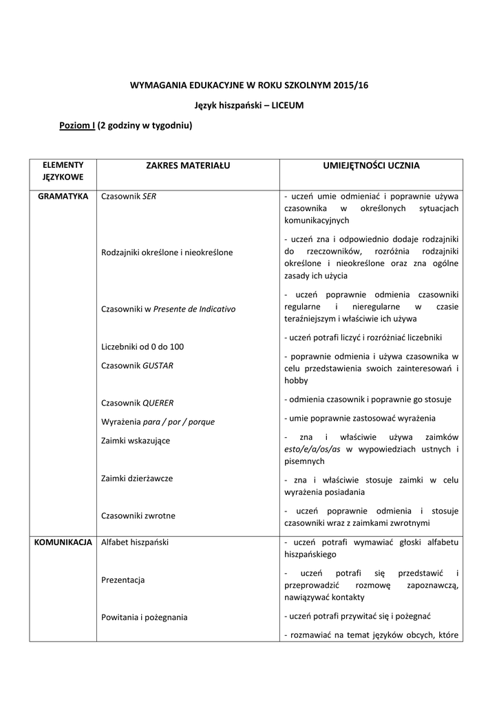WYMAGANIA EDUKACYJNE W ROKU SZKOLNYM 2015/16 Język hiszpański – LICEUM Poziom I (2 godziny w tygodniu) ELEMENTY JĘZYKOWE GRAMATYKA ZAKRES MATERIAŁU Czasownik SER Rodzajniki określone i nieokreślone Czasowniki w Presente de Indicativo UMIEJĘTNOŚCI UCZNIA - uczeń umie odmieniać i poprawnie używa czasownika w określonych sytuacjach komunikacyjnych - uczeń zna i odpowiednio dodaje rodzajniki do rzeczowników, rozróżnia rodzajniki określone i nieokreślone oraz zna ogólne zasady ich użycia - uczeń poprawnie odmienia czasowniki regularne i nieregularne w czasie teraźniejszym i właściwie ich używa - uczeń potrafi liczyć i rozróżniać liczebniki Liczebniki od 0 do 100 Czasownik GUSTAR - poprawnie odmienia i używa czasownika w celu przedstawienia swoich zainteresowań i hobby Czasownik QUERER - odmienia czasownik i poprawnie go stosuje Wyrażenia para / por / porque - umie poprawnie zastosować wyrażenia Zaimki wskazujące - zna i właściwie używa zaimków esto/e/a/os/as w wypowiedziach ustnych i pisemnych Zaimki dzierżawcze - zna i właściwie stosuje zaimki w celu wyrażenia posiadania Czasowniki zwrotne KOMUNIKACJA Alfabet hiszpański Prezentacja Powitania i pożegnania - uczeń poprawnie odmienia i stosuje czasowniki wraz z zaimkami zwrotnymi - uczeń potrafi wymawiać głoski alfabetu hiszpańskiego - uczeń potrafi się przedstawić i przeprowadzić rozmowę zapoznawczą, nawiązywać kontakty - uczeń potrafi przywitać się i pożegnać - rozmawiać na temat języków obcych, które Nauka języków obcych zna Gusta i zainteresowania - mówić i pytać o zainteresowania, gusta, preferencje Plany na weekend W sklepie WYPOWIEDZI PISEMNE - rozmawiać na temat planów na najbliższą przyszłość - uczeń potrafi komunikować się w sklepie odzieżowym, poprosić o pomoc, zapłacić za towar W restauracji - uczeń potrafi zamówić potrawy i napoje w restauracji/barze, poprosić o pomoc, zapłacić rachunek Moje, twoje, nasze - wyraża stan posiadania używając odpowiednich zaimków dzierżawczych Wygląd i charakter - uczeń potrafi opisać osoby używając odpowiednich struktur gramatycznych i słownictwa Codzienna rutyna uczeń opowiada o codziennych czynnościach, pyta i podaje godzinę Dbanie o siebie - rozmawia na temat dbania o wygląd i zdrowie Ogłoszenie Opis codziennej rutyny Wpis na bloga SŁOWNICTWO - uczeń potrafi napisać krótkie ogłoszenie, w którym przedstawia siebie - uczeń potrafi opisać swój zwykły dzień, z rozkładem godzinowym i podstawowymi czynnościami - uczeń tworzy wypowiedzi pisemne o tematyce podróżniczej Uczeń zna, rozumie i korzysta ze słownictwa związanego z następującą tematyką: W klasie Skąd jesteś? Zawody Turystyka Żywność - przybory szkolne, komunikacja na lekcji języka hiszpańskiego (przydatne zwroty) - kraje i narodowości - słownictwo związane z wykonywaną pracą - podróże, środki transportu, zwiedzanie - produkty żywnościowe, tradycyjne potrawy kuchni hiszpańskiej, zwyczaje żywieniowe, jedzenie w restauracji - zjawiska pogodowe, klimat, miesiące, pory Pogoda i klimat roku Zakupy - sklepy, odzież, słownictwo związane z zakupami Czas wolny Rodzina Codzienna rutyna Wygląd i charakter KULTURA Kraje hiszpańskojęzyczne Osobistości ze świata hiszpańskojęzycznego Podróże po krajach hiszpańskojęzycznych - rozrywki, sport, sposoby spędzania czasu wolnego - członkowie rodziny, relacje rodzinne, stany cywilne - czynności dnia codziennego, godziny, dni tygodnia - cechy fizyczne i cechy charakteru - podstawowe informacje dotyczące krajów hiszpańskojęzycznych, ciekawostki najważniejsze postacie kultury hiszpańskojęzycznej (artyści, pisarze, twórcy filmowi, politycy, odkrywcy, itd.) ciekawe miejsca w krajach hiszpańskojęzycznych, zabytki, miasta Poziom II (2 godziny w tygodniu) ELEMENTY JĘZYKOWE GRAMATYKA ZAKRES MATERIAŁU Czas teraźniejszy Presente de Indicativo UMIEJĘTNOŚCI UCZNIA Uczeń potrafi: - poprawnie odmieniać czasowniki regularne i nieregularne - używać czasu gramatycznego w różnych kontekstach i sytuacjach codziennych - tworzyć wypowiedzi ustne i pisemne z użyciem odpowiednich form czasownikowych Czasownik GUSTAR - poprawna odmiana czasownika w czasie teraźniejszym - użycie czasownika w wypowiedziach ustnych i pisemnych (mówienie o zainteresowaniach, gustach, hobby) - właściwe użycie wyrażeń w celu mówienia o własnych preferencjach oraz podkreślenia también / tampoco / mucho / bastante / intensywności demasiado / nada Wyrażenia: Czasownik DOLER - poprawna odmiana czasownika w czasie teraźniejszym - użycie czasownika w wypowiedziach ustnych i pisemnych (mówienie o tym, co nas boli) Zaimki nieokreślone: - właściwe użycie wyrażeń w odpowiednim kontekście Algo / alguien / nada / nadie , etc. Zaimki wskazujące: Esto / este / esta / estos / estas Eso / ese / esa / esos / esas Aquello / aquel / aquella / aquellos / as - właściwe użycie wyrażeń w zależności od dystansu Peryfrazy: ESTAR + GERUNDIO SEGUIR + GERUNDIO - uczeń poprawnie stosuje struktury gramatyczne w odpowiednim kontekście (podkreślenie symultaniczności, mówienie o planach, projektach, nakazy i zakazy, itp.) IR + A + INFINITIVO TENER QUE + INFINITIVO DEBER + INFINITIVO HAY QUE + INFINITIVO Zaimki dopełnienia bliższego i dalszego Complementos de Objeto Directo / Indirecto Liczebniki od 100 do miliona - uczeń zna zaimki i poprawnie je rozróżnia - właściwie używa zaimków w połączeniu z czasem teraźniejszym (zaimki dopełnienia bliższego i dalszego osobno i łącznie) - uczeń zna, rozróżnia i korzysta z liczebników w wypowiedziach ustnych i pisemnych Czasy przeszłe: Uczeń potrafi: -Preterito Perfecto - poprawnie odmieniać czasowniki regularne i nieregularne w odpowiednich czasach -Preterito Indefinido - rozróżniać czasy przeszłe - używać struktur gramatycznych zgodnie z ich przeznaczeniem - tworzyć wypowiedzi ustne i pisemne z użycie