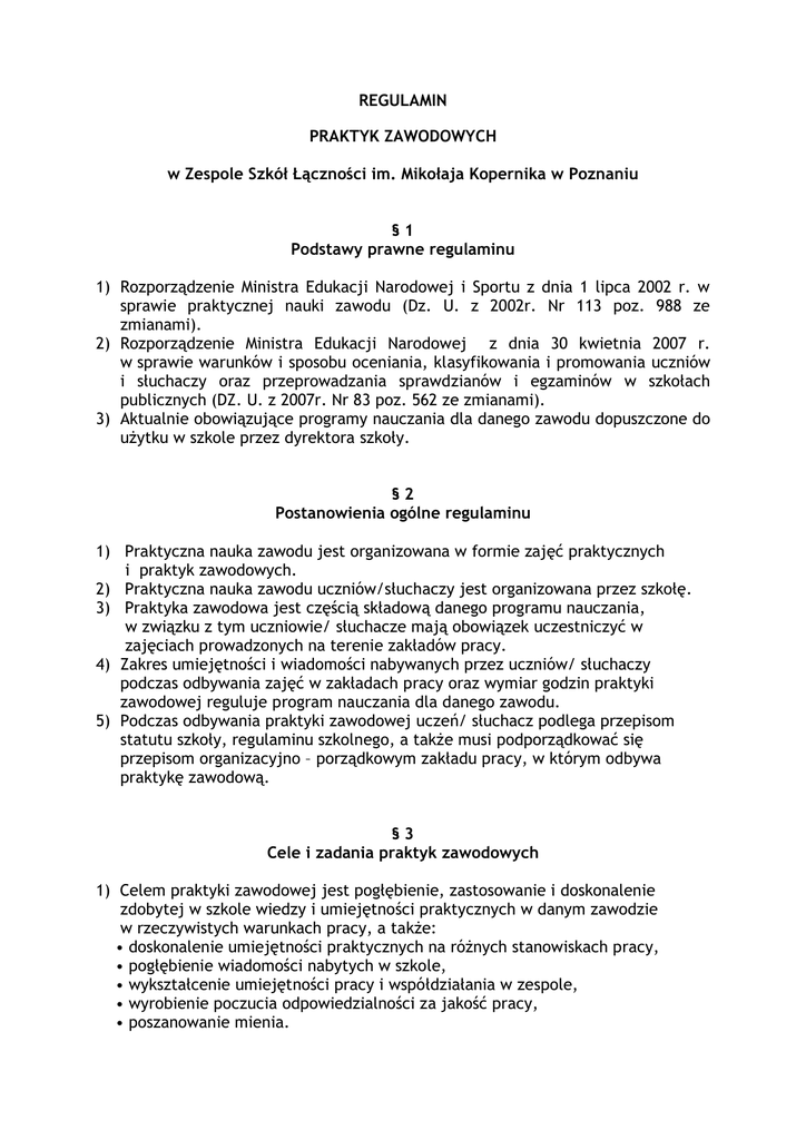 REGULAMIN PRAKTYK ZAWODOWYCH w Zespole Szkół Łączności im. Mikołaja Kopernika w Poznaniu §1 Podstawy prawne regulaminu 1) Rozporządzenie Ministra Edukacji Narodowej i Sportu z dnia 1 lipca 2002 r. w sprawie praktycznej nauki zawodu (Dz. U. z 2002r. Nr 113 poz. 988 ze zmianami). 2) Rozporządzenie Ministra Edukacji Narodowej z dnia 30 kwietnia 2007 r. w sprawie warunków i sposobu oceniania, klasyfikowania i promowania uczniów i słuchaczy oraz przeprowadzania sprawdzianów i egzaminów w szkołach publicznych (DZ. U. z 2007r. Nr 83 poz. 562 ze zmianami). 3) Aktualnie obowiązujące programy nauczania dla danego zawodu dopuszczone do użytku w szkole przez dyrektora szkoły. §2 Postanowienia ogólne regulaminu 1) Praktyczna nauka zawodu jest organizowana w formie zajęć praktycznych i praktyk zawodowych. 2) Praktyczna nauka zawodu uczniów/słuchaczy jest organizowana przez szkołę. 3) Praktyka zawodowa jest częścią składową danego programu nauczania, w związku z tym uczniowie/ słuchacze mają obowiązek uczestniczyć w zajęciach prowadzonych na terenie zakładów pracy. 4) Zakres umiejętności i wiadomości nabywanych przez uczniów/ słuchaczy podczas odbywania zajęć w zakładach pracy oraz wymiar godzin praktyki zawodowej reguluje program nauczania dla danego zawodu. 5) Podczas odbywania praktyki zawodowej uczeń/ słuchacz podlega przepisom statutu szkoły, regulaminu szkolnego, a także musi podporządkować się przepisom organizacyjno – porządkowym zakładu pracy, w którym odbywa praktykę zawodową. §3 Cele i zadania praktyk zawodowych 1) Celem praktyki zawodowej jest pogłębienie, zastosowanie i doskonalenie zdobytej w szkole wiedzy i umiejętności praktycznych w danym zawodzie w rzeczywistych warunkach pracy, a także: • doskonalenie umiejętności praktycznych na różnych stanowiskach pracy, • pogłębienie wiadomości nabytych w szkole, • wykształcenie umiejętności pracy i współdziałania w zespole, • wyrobienie poczucia odpowiedzialności za jakość pracy, • poszanowanie mienia. 2) Programy nauczania dla poszczególnych zawodów określają szczegółowe cele kształcenia dotyczące praktyk zawodowych. §4 Organizacja praktyk zawodowych 1) Praktyki zawodowe są organizowane przez szkołę u pracodawców i prowadzone pod kierunkiem opiekunów praktyk zawodowych, którymi mogą być pracodawcy lub wyznaczeni przez nich pracownicy. 2) Praktyka zawodowa może być prowadzona indywidualnie lub w grupach, przy czym liczba uczniów/słuchaczy w grupie powinna umożliwiać realizację programu nauczania dla danego zawodu i uwzględniać specyfikę nauczanego zawodu oraz przepisy bezpieczeństwa i higieny pracy. 3) Praktyka zawodowa realizowana jest w oparciu o umowę zawartą pomiędzy szkołą, a zakładem pracy przyjmujących uczniów/słuchaczy na zajęcia. 4) Dobowy wymiar godzin praktyki zawodowej dla uczniów/słuchaczy w wieku powyżej 16 lat nie może przekraczać 8 godzin. 5) Praktyka zawodowa może być organizowana w systemie zmianowym, z tym że nie może wypadać w porze nocnej. 6) Praktyka zawodowa realizowana jest zgodnie z harmonogramem praktyk zawodowych ustalonym na dany rok szkolny przez kierownika laboratorium, a zatwierdzonym przez dyrektora szkoły. 7) Praktyki zawodowe odbywają się w wyznaczonych przez szkołę zakładach pracy gwarantujących realizację programu nauczania. 8) W szczególnych przypadkach (np. zamieszkanie poza miejscem kształcenia, kształcenie dorosłych) istnieje możliwość odbycia praktyki zawodowej w firmie wskazanej przez ucznia/słuchacza. Uczeń/słuchacz może zorganizować praktykę zawodową we własnym zakresie po uzyskaniu zgody kierownika laboratorium, w przeciwnym razie praktyka nie będzie zaliczona. Instytucja przyjmująca praktykanta powinna spełniać określone warunki: • zatrudniać minimum 10 osób; • posiadać osobowość prawną; • prowadzić pełną księgowość; • nie być w trakcie likwidacji. Praktyka indywidualna podlega przepisom określonym przez Kodeks Pracy, rozporządzenie MENiS w sprawie praktycznej nauki zawodu (Dz. U. Nr 113 poz. 988 z dnia 01.07.2002 ze zmianami), przepisom regulaminowym szkoły, organizacyjno-porządkowym zakładu pracy i postanowieniom niniejszego regulaminu. W przypadku nie uzyskania akceptacji Dyrekcji Szkoły, nie dopełnienia formalności, bądź nie wywiązania się zakładu pracy z ustaleń – praktykant zostaje skierowany na praktykę do placówki wskazanej przez szkołę. 9) W przypadku dyscyplinarnego usunięcia ucznia/słuchacza z praktyki zawodowej przez zakład pracy, uczeń/słuchacz zobowiązany jest do ponownego odbycia praktyki zawodowej w terminie i firmie wskazanej przez szkołę. Nie zastosowanie się do powyższego będzie skutkować oceną niedostateczną z praktyk zawodowych i brakiem promocji do klasy programowo wyższej. §5 Prawa ucznia/słuchacza W czasie odbywania zajęć z praktyki zawodowej uczeń/słuchacz ma prawo do: 1) Zapoznania z obowiązującym w zakładzie regulaminem i zasadami pracy na poszczególnych stanowiskach. 2) Zapoznania z wymaganiami i oczekiwaniami pracodawcy. 3) Wykonywania zadań wynikających z programu praktyk. 4) Zapoznania z kryteriami oceniania. 5) Informowania szkoły o nieprawidłowościach i zmianach dotyczących zakresu obowiązków, czasu trwania praktyki itd. 6) Zapoznania z sankcjami wynikającymi z nie wywiązywania się z obowiązków i łamania postanowień regulaminu praktyk. 7) Uzyskania informacji o ocenie praktyki zawodowej i uzasadnienia jej. 8) Uzyskania wpisu i odbioru dzienniczka praktyk w ostatnim dniu ich trwania. 9) Właściwego traktowania i poszanowania godności osobistej. §6 Obowiązki ucznia/słuchacza Uczeń/słuchacz ma obowiązek przygotować się do praktyki zawodowej poprzez: 1) Zapoznanie się z informacjami przekazanymi na spotkaniu z kierownikiem laboratorium, które odbywa się nie później niż miesiąc przed rozpoczęciem praktyki, 2)