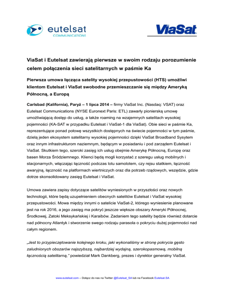 ViaSat i Eutelsat zawierają pierwsze w swoim rodzaju porozumienie celem połączenia sieci satelitarnych w paśmie Ka Pierwsza umowa łącząca satelity wysokiej przepustowości (HTS) umożliwi klientom Eutelsat i ViaSat swobodne przemieszczanie się między Ameryką Północną, a Europą Carlsbad (Kalifornia), Paryż – 1 lipca 2014 – firmy ViaSat Inc. (Nasdaq: VSAT) oraz Eutelsat Communications (NYSE Euronext Paris: ETL) zawarły pionierską umowę umożliwiającą dostęp do usług, a także roaming na wzajemnych satelitach wysokiej pojemności (KA-SAT w przypadku Eutelsat i ViaSat-1 dla ViaSat). Obie sieci w paśmie Ka, reprezentujące ponad połowę wszystkich dostępnych na świecie pojemności w tym paśmie, dzielą jeden ekosystem satelitarny wysokiej pojemności dzięki ViaSat Broadband Sysytem oraz innym infrastrukturom naziemnym, będącym w posiadaniu i pod zarządem Eutelsat i ViaSat. Skutkiem tego, szeroki zasięg ich usług obejmie Amerykę Północną, Europę oraz basen Morza Śródziemnego. Klienci będą mogli korzystać z szeregu usług mobilnych i stacjonarnych, włączając łączność podczas lotu samolotem, czy rejsu statkiem, łączność awaryjną, łączność na platformach wiertniczych oraz dla potrzeb rządowych, wszędzie, gdzie dotrze skonsolidowany zasięg Eutelsat i ViaSat. Umowa zawiera zapisy dotyczące satelitów wyniesionych w przyszłości oraz nowych technologii, które będą uzupełnieniem obecnych satelitów Eutelsat i ViaSat wysokiej przepustowości. Mowa między innymi o satelicie ViaSat-2, którego wyniesienie planowane jest na rok 2016, a jego zasięg ma pokryć jeszcze większe obszary Ameryki Północnej, Środkowej, Zatoki Meksykańskiej i Karaibów. Zadaniem tego satelity będzie również dotarcie nad północny Atlantyk i stworzenie swego rodzaju parasola o pokryciu dużej pojemności nad całym regionem. „Jest to przypieczętowanie kolejnego kroku, jaki wykonaliśmy w stronę pokrycia gęsto zaludnionych obszarów najszybszą, najbardziej wydajną, szerokopasmową, mobilną łącznością satelitarną,” powiedział Mark Dankberg, prezes i dyrektor generalny ViaSat. www.eutelsat.com – Dołącz do nas na Twitter @Eutelsat_SA lub na Facebook Eutelsat.SA „Rozszerzenie naszej dotychczasowej współpracy z Eutelsat umożliwia nam zapewnienie najszybszego Wi-Fi na pokładach samolotów po obydwu stronach Atlantyku.” Michel de Rosen, prezes i dyrektor generalny Eutelsat, powiedział: „Dzięki współpracy z ViaSat możemy poszerzyć zasięg usług wysokiej jakości, jakie oferujemy obecnie klientom w Europie przy użyciu satelity KA-SAT i zaoferować je odbiorcom w Ameryce Północnej. Wierzymy, że połączenie tych dwóch systemów satelitarnych przez satelitę ViaSat-2 w przyszłości, będzie ogromnym plusem dla firm dostarczających usługi mobilne i tych, którzy zmuszeni są do ciągłego podróżowania.” Pierwszy w Europie satelita wysokiej przepustowości (HTS), Eutelsat KA-SAT, zapewnia przepustowość rzędu ponad 90 Gb/s. Eutelsat przy współpracy z wieloma partnerami dostarcza rozmaite usługi, między innymi usługę internetu szerokopasmowego Tooway™ oraz usługę transmisji video, NewsSpotter. Sieć ViaSat pokrywa swoim zasięgiem Stany Zjednoczone i Kanadę, zapewniając przepustowość rzędu ponad 145 Gb/s, dostarczając swoje usługi, między innymi Exede® i Xplornet, zarówno do przedsiębiorstw, jak i odbiorców prywatnych. www.eutelsat.com – Dołącz do nas na Twitter @Eutelsat_SA lub na Facebook Eutelsat.SA O Eutelsat (www.eutelsat.com) Założona w 1977 roku firma Eutelsat Communications (NYSE Euronext Paris: ETL, kod ISIN: FR0010221234) jest jednym z wiodących na świecie i najbardziej doświadczonych operatorów satelitów komunikacyjnych. Firma oferuje pojemność nadawczą na 37 satelitach klientom, wśród których są nadawcy i stowarzyszenia nadawców, operatorzy płatnej telewizji, dostawcy usług internetowych i wideo oraz przedsiębiorstwa i agencje rządowe. Satelity Eutelsat zapewniają pełen zasięg na Europę, Bliski Wschód, Afrykę, region Azji i Pacyfiku oraz obie Ameryki, umożliwiając szerokopasmową i rządową komunikację wideo, danych, niezależnie od lokalizacji użytkownika. Siedziba firmy znajduje się w Paryżu, a biura i teleporty zlokalizowane są na całym świecie. Eutelsat zatrudnia 1000 mężczyzn i kobiet z 32 krajów, którzy będąc ekspertami w swych dziedzinach, współpracują z klientami zapewniając najwyższą jakość świadczonych usług. Kontakty: Eutelsat Dział prasowy Vanessa O’Connor Frédérique Gautier Marie-Sophie Ecuer Tel: + 33 1 53 98 37 91 Tel: + 33 1 53 98 37 91 Tel: + 33 1 53 98 37 91 [email protected] [email protected] [email protected] Tel. : +33 1 53 98 35 30 Tel. : +33 1 53 98 35 30 [email protected] [email protected] Inwestorzy i analitycy Leonard Wapler Cédric Pugni O ViaSat (www.viasat.com) ViaSat zajmuje się tworzeniem satelitarnych i innych bezprzewodowych systemów sieciowych, które w wydajny sposób dostarczają najwyższą przepustowość, umożliwiając szybką i bezpieczną komunikację wysokiej jakości w niemal każdej lokalizacji i dla wszystkich odbiorców (konsumenci prywatni, instytucje rządowe, przedsiębiorstwa oraz wojsko). Dzięki satelicie ViaSat-1, zapewniającej największą przepustowość na świecie, firma oferuje usługi Exede w Ameryce Północnej; mobilne usługi satelitarne na całym świecie, włącznie z szybkim Internetem na pokładach samolotów oraz usługami trackingu i przesyłania komunikatów o zakresie światowym; szerokopasmowe satelitarne systemy sieciowe; a także systemy łączności militarnej i usługi związane z bezpieczeństwem w sieci dla rządu Stanów Zjednoczonych oraz jego sojuszników. Ponadto, ViaSat oferuje swoim klientom wiele produktów i technologii uzupełniających. Z siedzibą w Carlsbad, firma zatrudnia ponad 3100 osób, które pracując w filiach na całym ś